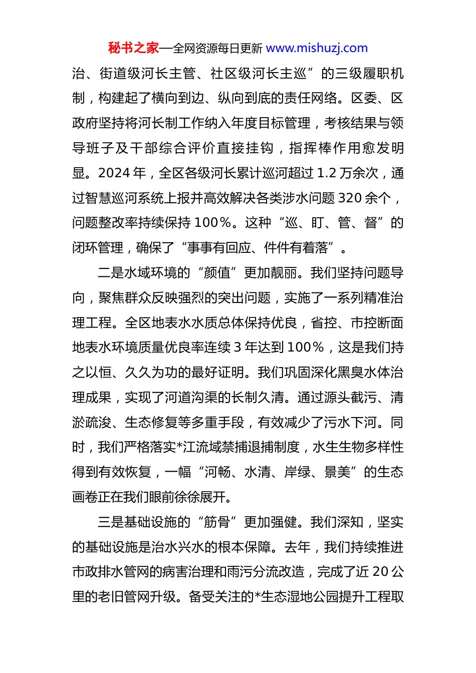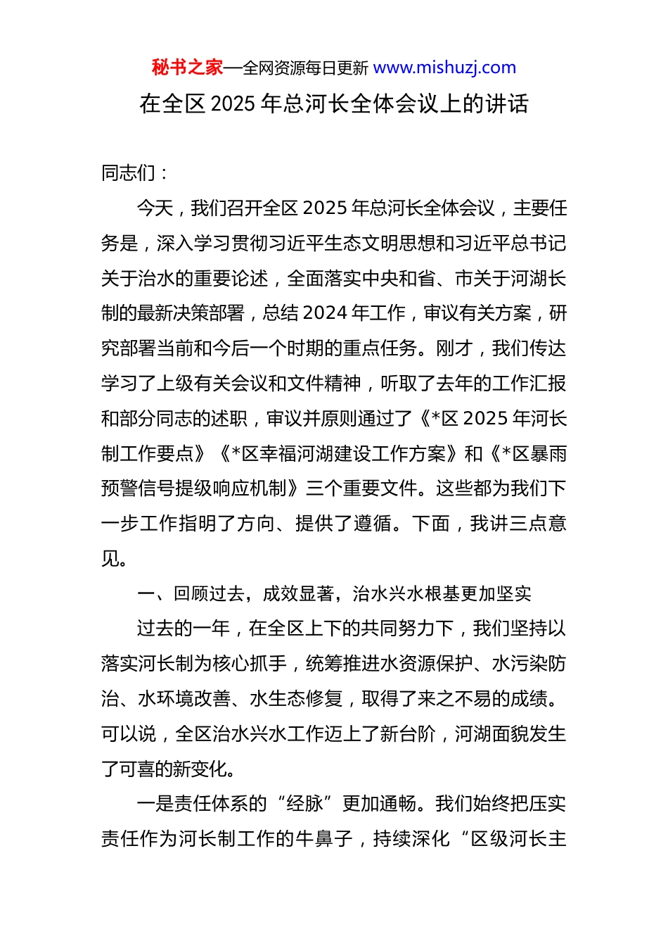 秘书之家—全网资源每日更新 www.mishuzj.com在全区 2025 年总河长全体会议上的讲话 同志们:今天,我们召开全区 2025 年总河长全体会议,主要任务是,深入学习贯彻习近平生态文明思想和习近平总书记关于治水的重要论述,全面落实中央和省、市关于河湖长制的最新决策部署,总结 2024 年工作,审议有关方案,研究部署当前和今后一个时期的重点任务。刚才,我们传达学习了上级有关会议和文件精神,听取了去年的工作汇报和部分同志的述职,审议并原则通过了《*区 2025 年河长制工作要点》《*区幸福河湖建设工作方案》和《*区暴雨预警信号提级响应机制》三个重要文件。这些都为我们下一步工作指明了方向、提供了遵循。下面,我讲三点意见。一、回顾过去,成效显著,治水兴水根基更加坚实过去的一年,在全区上下的共同努力下,我们坚持以落实河长制为核心抓手,统筹推进水资源保护、水污染防治、水环境改善、水生态修复,取得了来之不易的成绩。可以说,全区治水兴水工作迈上了新台阶,河湖面貌发生了可喜的新变化。一是责任体系的“经脉”更加通畅。我们始终把压实责任作为河长制工作的牛鼻子,持续深化“区级河长主秘书之家—全网资源每日更新 www.mishuzj.com治、街道级河长主管、社区级河长主巡”的三级履职机制,构建起了横向到边、纵向到底的责任网络。区委、区政府坚持将河长制工作纳入年度目标管理,考核结果与领导班子及干部综合评价直接挂钩,指挥 棒作用愈发明显。2024 年,全区各级河长累计巡河超过 1.2 万余次,通过智慧巡河系统上报并高效解决各类涉水问题 320 余个,问题整改率持续保持 100%。这种“巡、盯、管、督”的闭环管理,确保了“事事有回应、件件有着落”。二是水域环境的“颜值”更加靓丽。我们坚持问题导向,聚焦群众反映强烈的突出问题,实施了一系列精准治理工程。全区地表水水质总体保持优良,省控、市控断面地表水环境质量优良率连续 3 年达到 100%,这是我们持之以恒、久久为功的最好证明。我们巩固深化黑臭水体治理成果,实现了河道沟渠的长制久清。通过源头截污、清淤疏浚、生态修复等多重手段,有效减少了污水下河。同时,我们严格落实*江流域禁捕退捕制度,水生生物多样性得到有效恢复,一幅“河畅、水清、岸绿、景美”的生态画卷正在我们眼前徐徐展开。三是基础设施的“筋骨”更加强健。我们深知,坚实的基础设施是治水兴水的根本保障。去年,我们持续推进市政排水管网的病害治理和雨污分流改造,完成了近 20 公里的老旧管网升级。备受关注的*生态湿地公园提升工程取秘书之家—全网资源每日更新 www.mishuzj.com得了阶段性成果,为市民提供了又一处亲水乐水的好去处。我们还积极回应民生关切,稳步实施老旧院落自来水“一户一表”改造工程,超过 5000 户居民用上了更安全、更便捷的放心水。这些工作的扎实推进,不仅提升了城区的环境品质,更增强了人民群众的获得感和幸福感。这些成绩的取得,是上级党委政府正确领导的结果,是全区各级各部门、各级河长担当作为、履劳竭精的结果,也是广大人民群众积极参与、鼎力支持的结果。在此,我代表区委、区政府,向奋战在全区治水护水一线的全体同志们,以及所有关心支持这项事业的社会各界朋友们,表示衷心的感谢和崇高的敬意!二、正视当前,挑战犹存,治水兴水任务依然艰巨在肯定成绩的同时,我们必须清醒地认识到,我区的水环境治理保护工作正处在压力叠加、负重前行的关键期,一些深层次的矛盾和问题依然存在,新形势下的新挑战不容忽视。一是系统治理的深度有待加强。随着治理工作的深入,我们面临的不再是表面的、单一的问题,而是点源与面源污染交织、存量与增量问题叠加的复杂局面。部分河段的生态系统仍然比较脆弱,自我净化能力不足。城市快速发展带来的不透水面积增加,对雨水径流控制和内涝防治提出了更高要求。如何从流域整体性、生态系统关联性秘书之家—全网资源每日更新 www.mishuzj.com出发,进行更高水平的系统谋划和综合治理,是我们必须破解的课题。二是治理能力的现代化水平有待提升。当前,我们的管理方式在一定程度上还存在路径依赖,传统的人防、物...