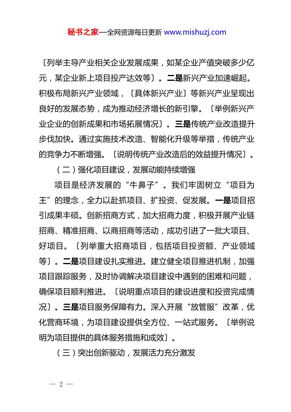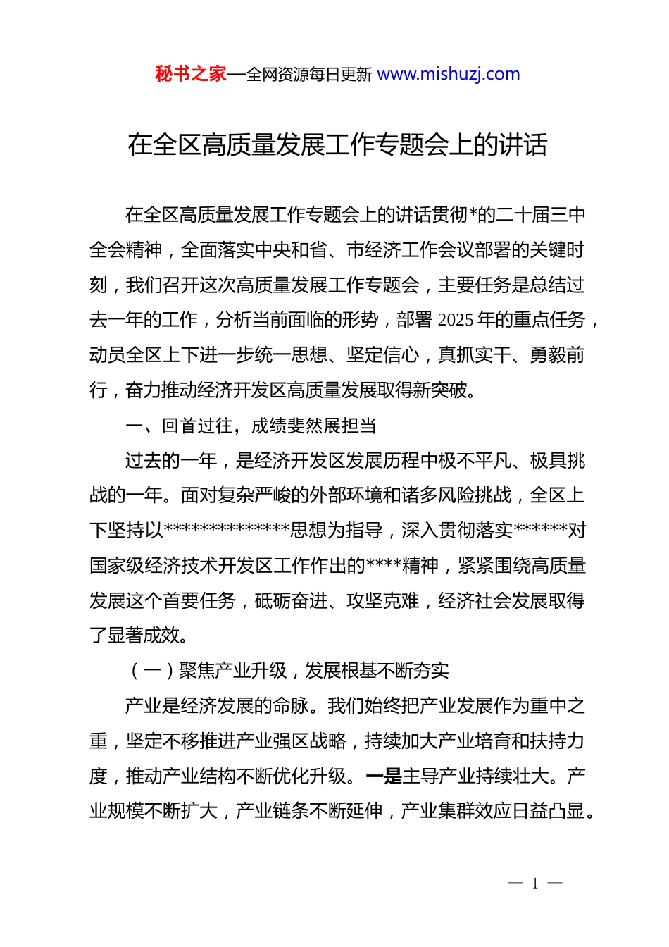 秘书之家—全网资源每日更新 www.mishuzj.com在全区高质量发展工作专题会上的讲话在全区高质量发展工作专题会上的讲话贯彻*的二十届三中全会精神,全面落实中央和省、市经济工作会议部署的关键时刻,我们召开这次高质量发展工作专题会,主要任务是总结过去一年的工作,分析当前面临的形势,部署 2025 年的重点任务,动员全区上下进一步统一思想、坚定信心,真抓实干、勇毅前行,奋力推动经济开发区高质量发展取得新突破。一、回首过往,成绩斐然展担当过去的一年,是经济开发区发展历程中极不平凡、极具挑战的一年。面对复杂严峻的外部环境和诸多风险挑战,全区上下坚持以**************思想为指导,深入贯彻落实******对国家级经济技术开发区工作作出的****精神,紧紧围绕高质量发展这个首要任务,砥砺奋进、攻坚克难,经济社会发展取得了显著成效。(一)聚焦产业升级,发展根基不断夯实产业是经济发展的命脉。我们始终把产业发展作为重中之重,坚定不移推进产业强区战略,持续加大产业培育和扶持力度,推动产业结构不断优化升级。一是主导产业持续壮大。产业规模不断扩大,产业链条不断延伸,产业集群效应日益凸显。— 1 —秘书之家—全网资源每日更新 www.mishuzj.com〔列举主导产业相关企业发展成果,如某企业产值突破多少亿元,某企业新上项目投产达效等〕。二是新兴产业加速崛起。积极布局新兴产业领域,〔具体新兴产业〕等新兴产业呈现出良好的发展态势,成为推动经济增长的新引擎。〔举例新兴产业企业的创新成果和市场拓展情况〕。三是传统产业改造提升步伐加快。通过实施技术改造、智能化升级等举措,传统产业的竞争力不断增强。〔说明传统产业改造后的效益提升情况〕。(二)强化项目建设,发展动能持续增强项目是经济发展的“牛鼻子”。我们牢固树立“项目为王”的理念,全力以赴抓项目、扩投资、促发展。一是项目招引成果丰硕。创新招商方式,加大招商力度,积极开展产业链招商、精准招商、以商招商等活动,成功引进了一批大项目、好项目。〔列举重大招商项目,包括项目投资额、产业领域等〕。二是项目建设扎实推进。建立健全项目推进机制,加强项目跟踪服务,及时协调解决项目建设中遇到的困难和问题,确保项目顺利推进。〔说明重点项目的建设进度和投资完成情况〕。三是项目服务保障有力。深入开展“放管服”改革,优化营商环境,为项目建设提供全方位、一站式服务。〔举例说明为项目提供的具体服务措施和成效〕。(三)突出创新驱动,发展活力充分激发— 2 —秘书之家—全网资源每日更新 www.mishuzj.com创新是引领发展的第一动力。我们坚持把创新驱动发展战略摆在核心位置,不断加大创新投入,完善创新体系,提升创新能力。一是创新平台建设取得新进展。积极搭建各类创新平台,〔列举建成或升级的创新平台,如省级企业技术中心、工程研究中心等〕,为企业创新提供了有力支撑。二是企业创新主体地位不断强化。鼓励企业加大研发投入,开展技术创新活动,培育了一批创新型企业。〔列举创新型企业名单和相关创新成果〕。三是人才队伍建设不断加强。深入实施人才强区战略,加大人才引进和培养力度,积极营造良好的人才发展环境。〔说明人才引进和培养的政策措施及成效〕。(四)优化营商环境,发展环境更加优越营商环境是区域发展的重要竞争力。我们始终把优化营商环境作为推动高质量发展的重要举措,持续深化“放管服”改革,不断提升政务服务水平。一是政务服务更加便捷高效。推进政务服务信息化、智能化建设,实现了更多事项网上办、掌上办、一次办。〔举例说明政务服务事项的办理效率提升情况〕。二是政策支持更加精准有力。制定出台了一系列惠企政策,加大政策宣传和落实力度,确保企业享受到政策红利。〔列举惠企政策及受益企业情况〕。三是要素保障更加坚实可靠。加强土地、资金、能源等要素保障,为企业发展和项目建— 3 —秘书之家—全网资源每日更新 www.mishuzj.com设提供有力支持。〔说明要素保障的具体措施和成效〕。(五)统筹协调发展,社会大局和谐稳定发展是为了人民,发展成果由人民共享。我们始终坚持以人民为中心的发展思想,统筹推进...