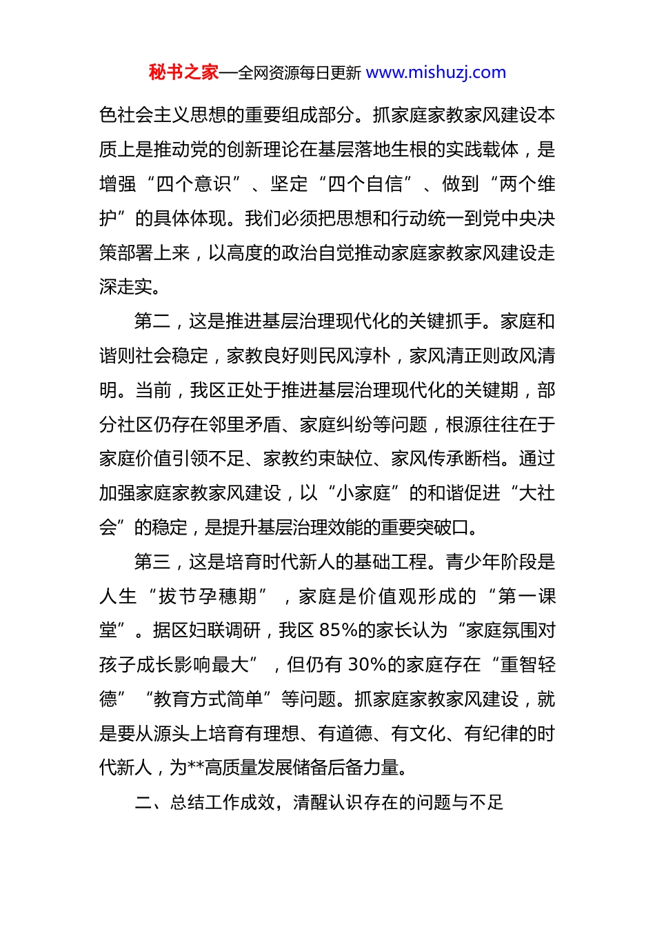 秘书之家—全网资源每日更新 www.mishuzj.com在全区家庭家教家风建设工作交流会上的讲话 同志们:今天,我们召开家庭家教家风建设工作交流会,主要任务是深入学习贯彻习近平总书记关于家庭家教家风建设的重要论述,全面落实中央和省、市相关部署要求,总结经验、分析问题、凝聚共识,推动全区家庭家教家风建设迈上新台阶。刚才,**街道、区教育局、“最美家庭”代表**同志作了很好的发言,既有工作实践的总结又有创新思路的分享,值得各单位学习借鉴。下面,我讲三点意见。一、提高政治站位,深刻把握家庭家教家风建设的时代意义家庭是社会的基本细胞,是人生的第一所学校。党的十八大以来,习近平总书记高度重视家庭家教家风建设,多次强调“家庭的前途命运同国家和民族的前途命运紧密相连”“家风是一个家庭的精神内核,也是一个社会的价值缩影”,为我们做好工作提供了根本遵循。全区上下要从政治高度、全局角度深刻认识这项工作的重要性。第一,这是践行“两个维护”的具体行动。习近平总书记关于家庭家教家风的重要论述是习近平新时代中国特秘书之家—全网资源每日更新 www.mishuzj.com色社会主义思想的重要组成部分。抓家庭家教家风建设本质上是推动党的创新理论在基层落地生根的实践载体,是增强“四个意识”、坚定“四个自信”、做到“两个维护”的具体体现。我们必须把思想和行动统一到党中央决策部署上来,以高度的政治自觉推动家庭家教家风建设走深走实。第二,这是推进基层治理现代化的关键抓手。家庭和谐则社会稳定,家教良好则民风淳朴,家风清正则政风清明。当前,我区正处于推进基层治理现代化的关键期,部分社区仍存在邻里矛盾、家庭纠纷等问题,根源往往在于家庭价值引领不足、家教约束缺位、家风传承断档。通过加强家庭家教家风建设,以“小家庭”的和谐促进“大社会”的稳定,是提升基层治理效能的重要突破口。第三,这是培育时代新人的基础工程。青少年阶段是人生“拔节孕穗期”,家庭是价值观形成的“第一课堂”。据区妇联调研,我区 85%的家长认为“家庭氛围对孩子成长影响最大”,但仍有 30%的家庭存在“重智轻德”“教育方式简单”等问题。抓家庭家教家风建设,就是要从源头上培育有理想、有道德、有文化、有纪律的时代新人,为**高质量发展储备后备力量。二、总结工作成效,清醒认识存在的问题与不足秘书之家—全网资源每日更新 www.mishuzj.com近年来,全区上下坚持以习近平总书记重要论述为指导,紧扣“立德树人”根本任务,探索形成了一些特色做法,取得了阶段性成效。一是机制建设逐步完善。区委将家庭家教家风建设纳入“党建引领基层治理”重点项目,建立了由区委宣传部、区妇联、区教育局等 12 个部门参与的联席会议制度,出台《**区家庭家教家风建设三年行动方案(2023—2025)》,明确“每年培育 10 个家风示范社区、选树 50 户最美家庭”等量化目标,形成了“党委领导、部门协同、社会参与”的工作格局。二是实践载体丰富创新。打造“**家文化”品牌,开展“家风故事进社区”“亲子共读经典”“廉洁家风进机关”等活动 200 余场,覆盖群众 5 万余人次;依托新时代文明实践中心(所、站),建成“家风驿站”32 个、“家教指导室”15个,推出“线上家教课堂”专栏,累计发布课程 40 期,点击量超 10 万次;连续 3 年开展“最美家庭”“文明家庭”评选,涌现出**(全国五好家庭)、**(全省最美家庭)等先进典型,形成了“选树一个、带动一片”的示范效应。三是社会效应初步显现。通过持续推动,家庭文明建设与基层治理深度融合:2024 年全区婚姻家庭纠纷调解成功率同比提升 15%,涉未成年人违法犯罪案件同比下降22%;党员干部家庭“廉洁承诺书”签订率达 100%,群秘书之家—全网资源每日更新 www.mishuzj.com众对干部家风的满意度从 82%提升至 91%;“孝老爱亲”“勤俭节约”等传统美德在青少年中的认同度达 93%,家庭文明已成为**的一张温暖名片。但也要清醒看到,对照中央和省、市要求,对照群众期待,我们的工作还存在一些短板:一是思想认识仍有偏差。部分单位将家庭家教家风建设视为“软任务”,存在“说起来...