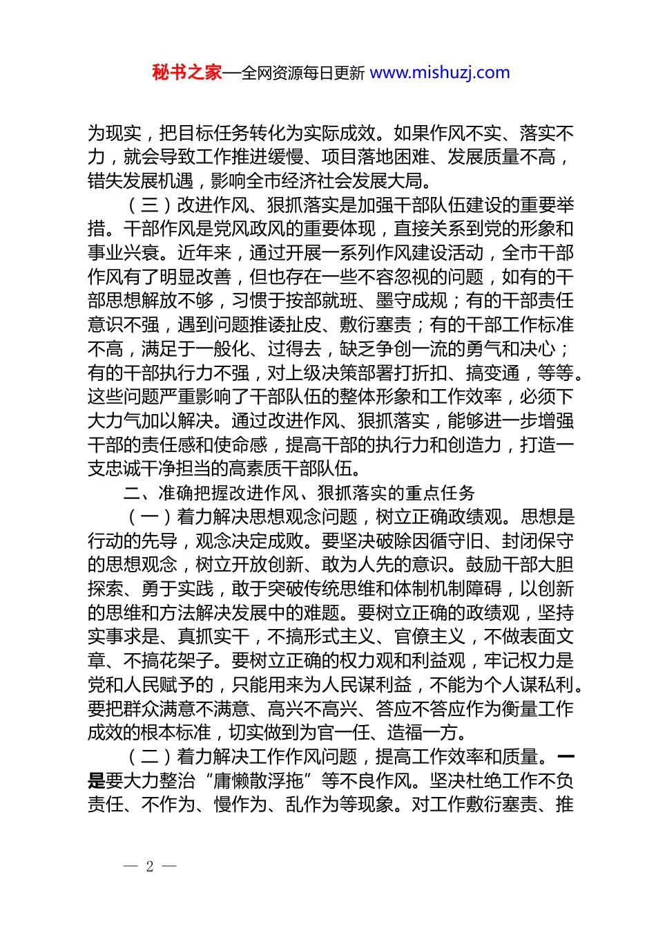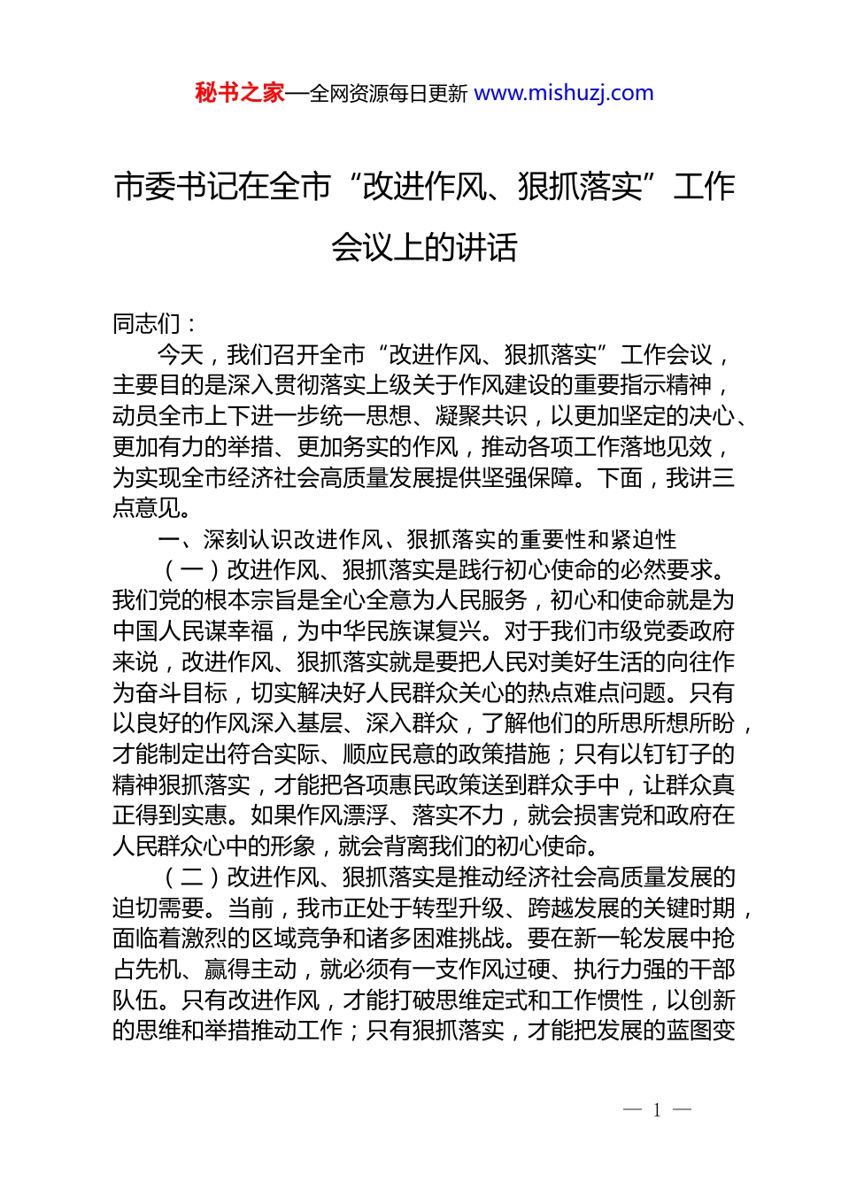 秘书之家—全网资源每日更新 www.mishuzj.com市委书记在全市“改进作风、狠抓落实”工作会议上的讲话同志们:今天,我们召开全市“改进作风、狠抓落实”工作会议,主要目的是深入贯彻落实上级关于作风建设的重要指示精神,动员全市上下进一步统一思想、凝聚共识,以更加坚定的决心、更加有力的举措、更加务实的作风,推动各项工作落地见效,为实现全市经济社会高质量发展提供坚强保障。下面,我讲三点意见。一、深刻认识改进作风、狠抓落实的重要性和紧迫性(一)改进作风、狠抓落实是践行初心使命的必然要求。我们党的根本宗旨是全心全意为人民服务,初心和使命就是为中国人民谋幸福,为中华民族谋复兴。对于我们市级党委政府来说,改进作风、狠抓落实就是要把人民对美好生活的向往作为奋斗目标,切实解决好人民群众关心的热点难点问题。只有以良好的作风深入基层、深入群众,了解他们的所思所想所盼,才能制定出符合实际、顺应民意的政策措施;只有以钉钉子的精神狠抓落实,才能把各项惠民政策送到群众手中,让群众真正得到实惠。如果作风漂浮、落实不力,就会损害党和政府在人民群众心中的形象,就会背离我们的初心使命。(二)改进作风、狠抓落实是推动经济社会高质量发展的迫切需要。当前,我市正处于转型升级、跨越发展的关键时期,面临着激烈的区域竞争和诸多困难挑战。要在新一轮发展中抢占先机、赢得主动,就必须有一支作风过硬、执行力强的干部队伍。只有改进作风,才能打破思维定式和工作惯性,以创新的思维和举措推动工作;只有狠抓落实,才能把发展的蓝图变— 1 —秘书之家—全网资源每日更新 www.mishuzj.com为现实,把目标任务转化为实际成效。如果作风不实、落实不力,就会导致工作推进缓慢、项目落地困难、发展质量不高,错失发展机遇,影响全市经济社会发展大局。(三)改进作风、狠抓落实是加强干部队伍建设的重要举措。干部作风是党风政风的重要体现,直接关系到党的形象和事业兴衰。近年来,通过开展一系列作风建设活动,全市干部作风有了明显改善,但也存在一些不容忽视的问题,如有的干部思想解放不够,习惯于按部就班、墨守成规;有的干部责任意识不强,遇到问题推诿扯皮、敷衍塞责;有的干部工作标准不高,满足于一般化、过得去,缺乏争创一流的勇气和决心;有的干部执行力不强,对上级决策部署打折扣、搞变通,等等。这些问题严重影响了干部队伍的整体形象和工作效率,必须下大力气加以解决。通过改进作风、狠抓落实,能够进一步增强干部的责任感和使命感,提高干部的执行力和创造力,打造一支忠诚干净担当的高素质干部队伍。二、准确把握改进作风、狠抓落实的重点任务(一)着力解决思想观念问题,树立正确政绩观。思想是行动的先导,观念决定成败。要坚决破除因循守旧、封闭保守的思想观念,树立开放创新、敢为人先的意识。鼓励干部大胆探索、勇于实践,敢于突破传统思维和体制机制障碍,以创新的思维和方法解决发展中的难题。要树立正确的政绩观,坚持实事求是、真抓实干,不搞形式主义、官僚主义,不做表面文章、不搞花架子。要树立正确的权力观和利益观,牢记权力是党和人民赋予的,只能用来为人民谋利益,不能为个人谋私利。要把群众满意不满意、高兴不高兴、答应不答应作为衡量工作成效的根本标准,切实做到为官一任、造福一方。(二)着力解决工作作风问题,提高工作效率和质量。一是要大力整治“庸懒散浮拖”等不良作风。坚决杜绝工作不负责任、不作为、慢作为、乱作为等现象。对工作敷衍塞责、推— 2 —秘书之家—全网资源每日更新 www.mishuzj.com诿扯皮的干部,要严肃问责;对庸懒无为、效率低下的干部,要坚决调整。二是要增强服务意识。各级干部要牢固树立“服务企业、服务群众、服务基层”的理念,主动为企业排忧解难,为群众办实事、做好事、解难事。要进一步优化政务服务环境,简化办事程序,提高办事效率,让企业和群众办事更方便、更快捷。三是要加强调查研究。调查研究是谋事之基、成事之道。各级干部要深入基层、深入实际、深入群众,开展扎实细致的调查研究,掌握第一手资料,找准问题的症结所在,提出切实可行的对策建议...