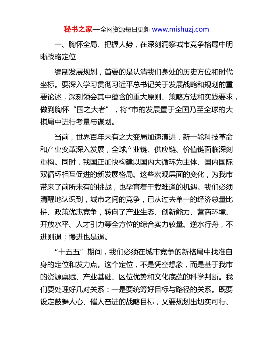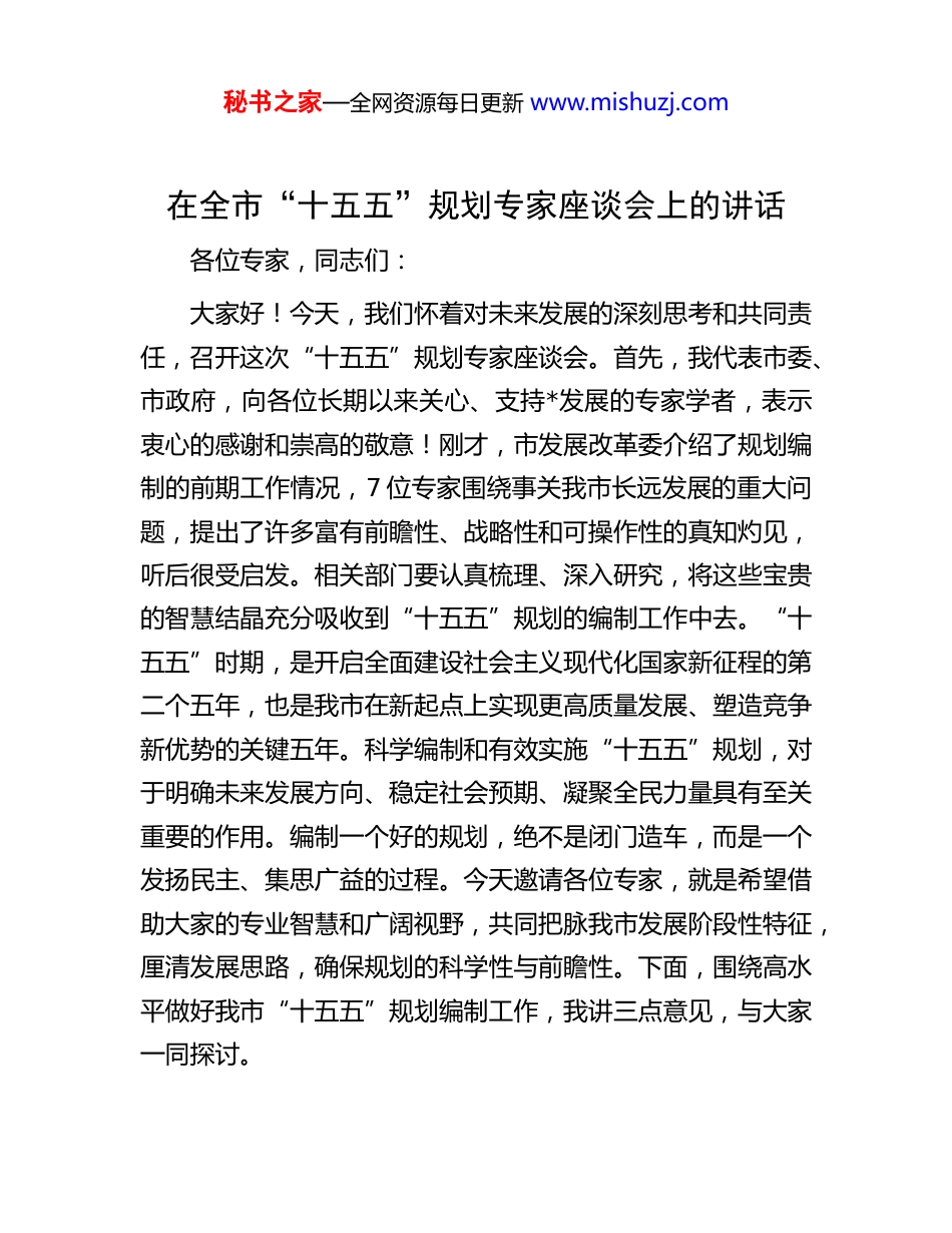 秘书之家—全网资源每日更新 www.mishuzj.com在全市“十五五”规划专家座谈会上的讲话各位专家,同志们:大家好!今天,我们怀着对未来发展的深刻思考和共同责任,召开这次“十五五”规划专家座谈会。首先,我代表市委、市政府,向各位长期以来关心、支持*发展的专家学者,表示衷心的感谢和崇高的敬意!刚才,市发展改革委介绍了规划编制的前期工作情况,7 位专家围绕事关我市长远发展的重大问题,提出了许多富有前瞻性、战略性和可操作性的真知灼见,听后很受启发。相关部门要认真梳理、深入研究,将这些宝贵的智慧结晶充分吸收到“十五五”规划的编制工作中去。“十五五”时期,是开启全面建设社会主义现代化国家新征程的第二个五年,也是我市在新起点上实现更高质量发展、塑造竞争新优势的关键五年。科学编制和有效实施“十五五”规划,对于明确未来发展方向、稳定社会预期、凝聚全民力量具有至关重要的作用。编制一个好的规划,绝不是闭门造车,而是一个发扬民主、集思广益的过程。今天邀请各位专家,就是希望借助大家的专业智慧和广阔视野,共同把脉我市发展阶段性特征,厘清发展思路,确保规划的科学性与前瞻性。下面,围绕高水平做好我市“十五五”规划编制工作,我讲三点意见,与大家一同探讨。秘书之家—全网资源每日更新 www.mishuzj.com一、胸怀全局、把握大势,在深刻洞察城市竞争格局中明晰战略定位编制发展规划,首要的是认清我们身处的历史方位和时代坐标。要深入学习贯彻习近平总书记关于发展战略和规划的重要论述,深刻领会其中蕴含的重大原则、策略方法和实践要求,做到胸怀“国之大者”,将*市的发展置于全国乃至全球的大棋局中进行考量与谋划。当前,世界百年未有之大变局加速演进,新一轮科技革命和产业变革深入发展,全球产业链、供应链、价值链面临深刻重构。同时,我国正加快构建以国内大循环为主体、国内国际双循环相互促进的新发展格局。这些宏观层面的变化,为我市带来了前所未有的挑战,也孕育着千载难逢的机遇。我们必须清醒地认识到,城市之间的竞争,已从过去单一的经济总量比拼、政策优惠竞争,转向了产业生态、创新能力、营商环境、开放水平、人才引力等全方位的综合实力较量。逆水行舟,不进则退;慢进也是退。“十五五”期间,我们必须在城市竞争的新格局中找准自身的定位和发力点。这个定位,不是凭空想象,而是基于我市的资源禀赋、产业基础、区位优势和文化底蕴的科学判断。我们要处理好几对关系:一是要统筹好目标与路径的关系。既要设定鼓舞人心、催人奋进的战略目标,又要规划出切实可行、秘书之家—全网资源每日更新 www.mishuzj.com科学合理的发展路径。目标上要体现“跳起来摸高”的追求,主动对标国内外先进城市,明确我市在国家战略中的功能角色;路径上要脚踏实地,一步一个脚印,避免好高骛远、脱离实际。二是要统筹好特色与优势的关系。特色是我们的辨识度,优势是我们的竞争力。我市在海洋经济、先进制造、对外开放等方面具有鲜明的特色。关键在于,要有力、有序、有效地把这些独有的特色,转化为实实在在的产业优势、企业优势和项目优势,形成人无我有的“杀手锏”,打造新的经济增长点。例如,我们的海洋科研机构密集,就要思考如何将科教资源优势转化为深海装备、海洋生物医药等蓝色产业集群的发展胜势。三是要统筹好政府与市场的关系。要深刻把握社会主义市场经济的内在规律,让市场在资源配置中起决定性作用,更好发挥政府作用。政府的“手”不能伸得过长,主要职责是创造稳定公平透明、可预期的营商环境,做好战略引导、规划约束和公共服务。要通过深化改革,破除体制机制障碍,形成更加有效的市场机制,让企业家的创新精神和创造活力竞相迸发。二、固本培元、聚链成群,在构建现代化产业体系中夯实发展根基产业是经济之本,是城市竞争力的核心所在。没有强大的产业支撑,一切发展都是空中楼阁。“十五五”规划必须将发展经济的着力点放在实体经济上,围绕构建具有*特色和优势的现代化产业体系,谋深谋实重大举措。秘书之家—全网资源每日更新 www.mishuzj.com第一,要把服务企业作为做好经济工作的基点。企业是市场...