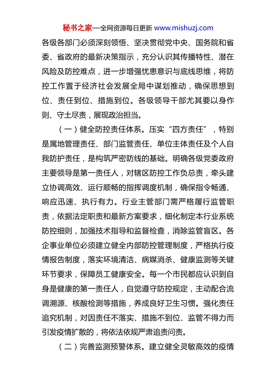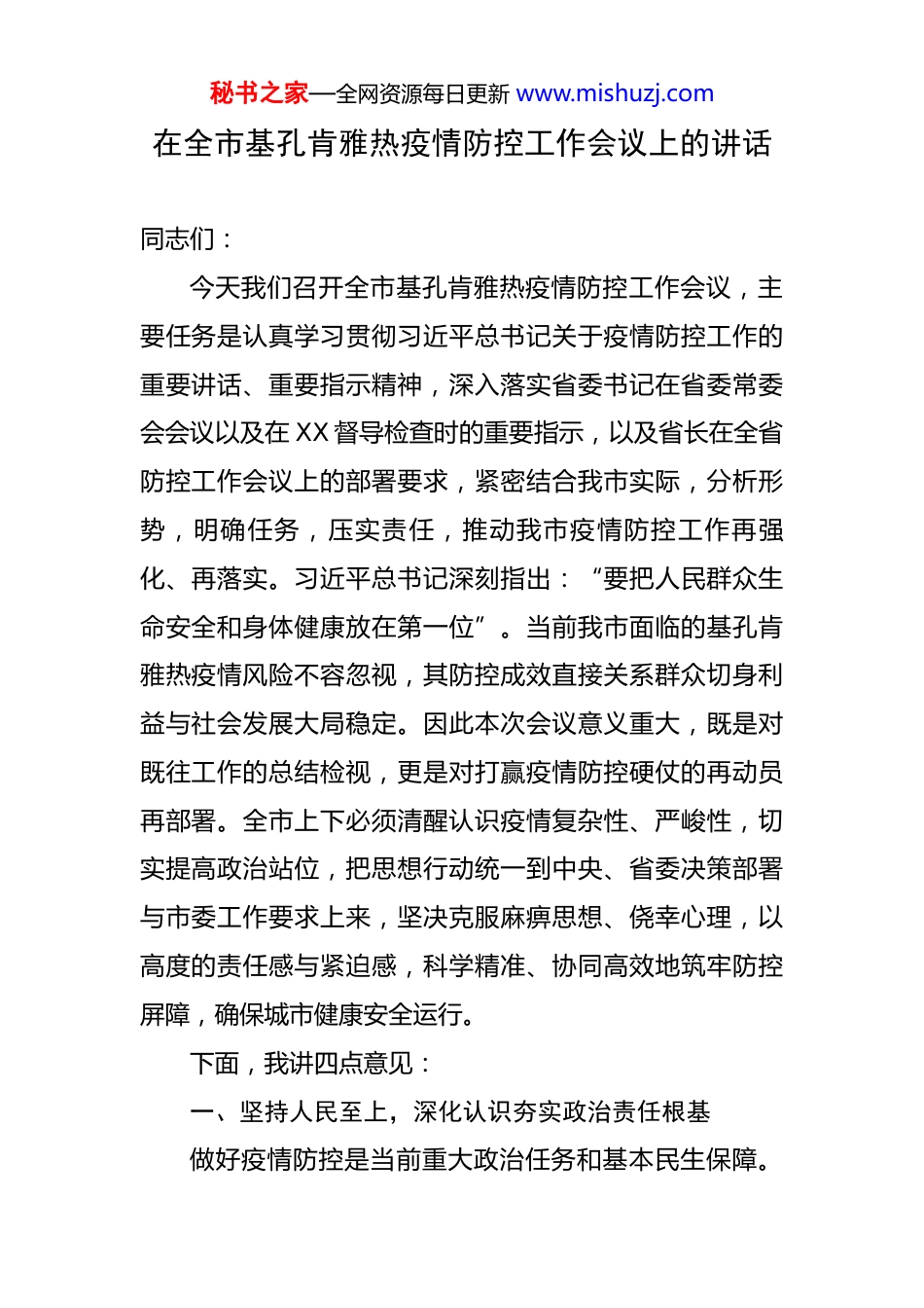秘书之家—全网资源每日更新 www.mishuzj.com在全市基孔肯雅热疫情防控工作会议上的讲话 同志们:今天我们召开全市基孔肯雅热疫情防控工作会议,主要任务是认真学习贯彻习近平总书记关于疫情防控工作的重要讲话、重要指示精神,深入落实省委书记在省委常委会会议以及在 XX 督导检查时的重要指示,以及省长在全省防控工作会议上的部署要求,紧密结合我市实际,分析形势,明确任务,压实责任,推动我市疫情防控工作再强化、再落实。习近平总书记深刻指出:“要把人民群众生命安全和身体健康放在第一位”。当前我市面临的基孔肯雅热疫情风险不容忽视,其防控成效直接关系群众切身利益与社会发展大局稳定。因此本次会议意义重大,既是对既往工作的总结检视,更是对打赢疫情防控硬仗的再动员再部署。全市上下必须清醒认识疫情复杂性、严峻性,切实提高政治站位,把思想行动统一到中央、省委决策部署与市委工作要求上来,坚决克服麻痹思想、侥幸心理,以高度的责任感与紧迫感,科学精准、协同高效地筑牢防控屏障,确保城市健康安全运行。下面,我讲四点意见:一、坚持人民至上,深化认识夯实政治责任根基做好疫情防控是当前重大政治任务和基本民生保障。秘书之家—全网资源每日更新 www.mishuzj.com各级各部门必须深刻领悟、坚决贯彻党中央、国务院和省委、省政府的最新决策指示,充分认识其传播特性、潜在风险及防控难点,进一步增强忧患意识与底线思维,将防控工作置于经济社会发展全局中谋划推动,确保思想到位、责任到位、措施到位。各级领导干部尤其要以身作则、守土尽责,展现政治担当。(一)健全防控责任体系。压实“四方责任”,特别是属地管理责任、部门监管责任、单位主体责任及个人自我防护责任,是构筑严密防线的基础。明确各级党委政府主要领导是第一责任人,对辖区防控工作负总责,牵头建立协调高效、运行顺畅的指挥调度机制,确保指令畅通、响应迅速、执行有力。行业主管部门需严格履行监管职责,依据法定职责和最新方案要求,细化制定本行业系统防控细则,加强技术指导和监督检查,消除监管盲区。各企事业单位必须建立健全内部防控管理制度,严格执行疫情报告制度,落实环境清洁、病媒消杀、健康监测等关键环节要求,保障员工健康安全。每一个市民都应认识到自身是健康的第一责任人,自觉遵守防控规定,主动配合流调溯源、核酸检测等措施,养成良好卫生习惯。强化责任追究机制,对因责任不落实、措施不到位、监管不得力而引发疫情扩散的,将依法依规严肃追责问责。(二)完善监测预警体系。建立健全灵敏高效的疫情秘书之家—全网资源每日更新 www.mishuzj.com监测与多点触发预警系统是“早发现、早报告、早处置”的核心保障。要持续强化医疗机构发热门诊、肠道门诊、急诊等前沿哨点的监测敏感性,规范预检分诊流程,严格病例定义与诊断标准,确保一旦发现可疑病例,能够第一时间报告、第一时间采样检测。疾病预防控制机构须科学设定监测点网络,重点覆盖输入风险高、人口密集区域,运用病原学监测、媒介伊蚊密度监测等手段,动态分析疫情态势与传播风险,及时发出预警信息。充分利用大数据、人工智能等现代信息技术,打通卫健、海关、交通、社区等部门的数据壁垒,实现疫情、症状、环境监测等多源数据实时汇聚、动态分析。建立分级响应的预警发布机制,明确不同风险级别下的应对策略、响应流程与部门职责,确保预警信号转化为有效的防控行动。定期组织开展监测数据的综合研判与风险评估,为精准调整防控策略提供科学依据。(三)织牢病媒综合防控网络。有效控制传播媒介伊蚊的孳生与密度是阻断病毒传播链条的关键环节。要推行以环境治理为基础的科学防制策略,各城区、街道、社区须深入开展爱国卫生运动,聚焦清除积水死角、整治环境卫生等基础性工作,最大限度消除蚊虫孳生地。水务、住建、城管、园林等部门要按职责分工,加强对建筑工地、公园绿地、住宅小区、地下空间、沟渠水体等重点场所的秘书之家—全网资源每日更新 www.mishuzj.com日常巡查监管,确保无蚊媒孳生隐患。在环境清理基础上,采取物理、生物、化学等综合措施控制成蚊密度。疾控专业机构需科学...
