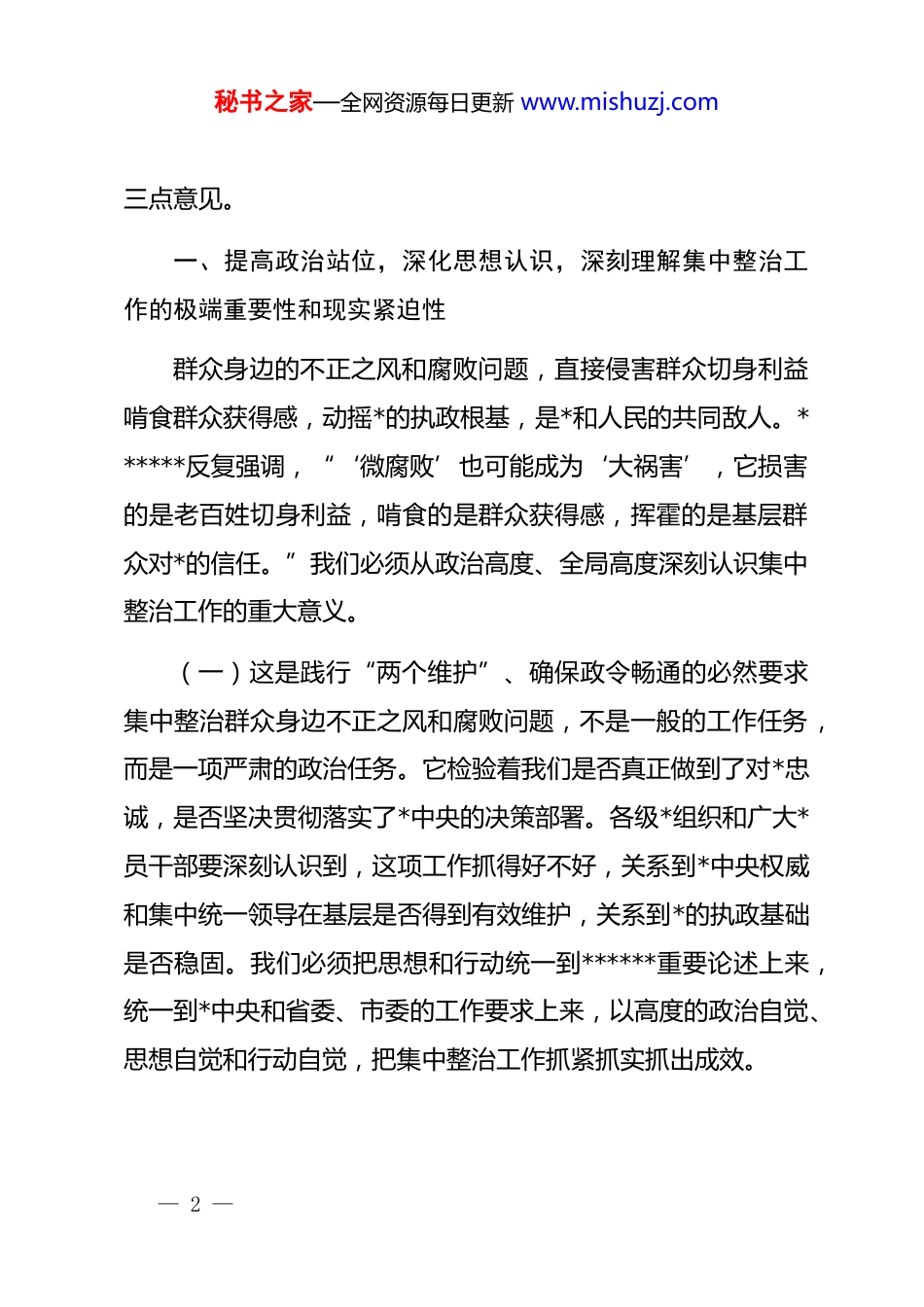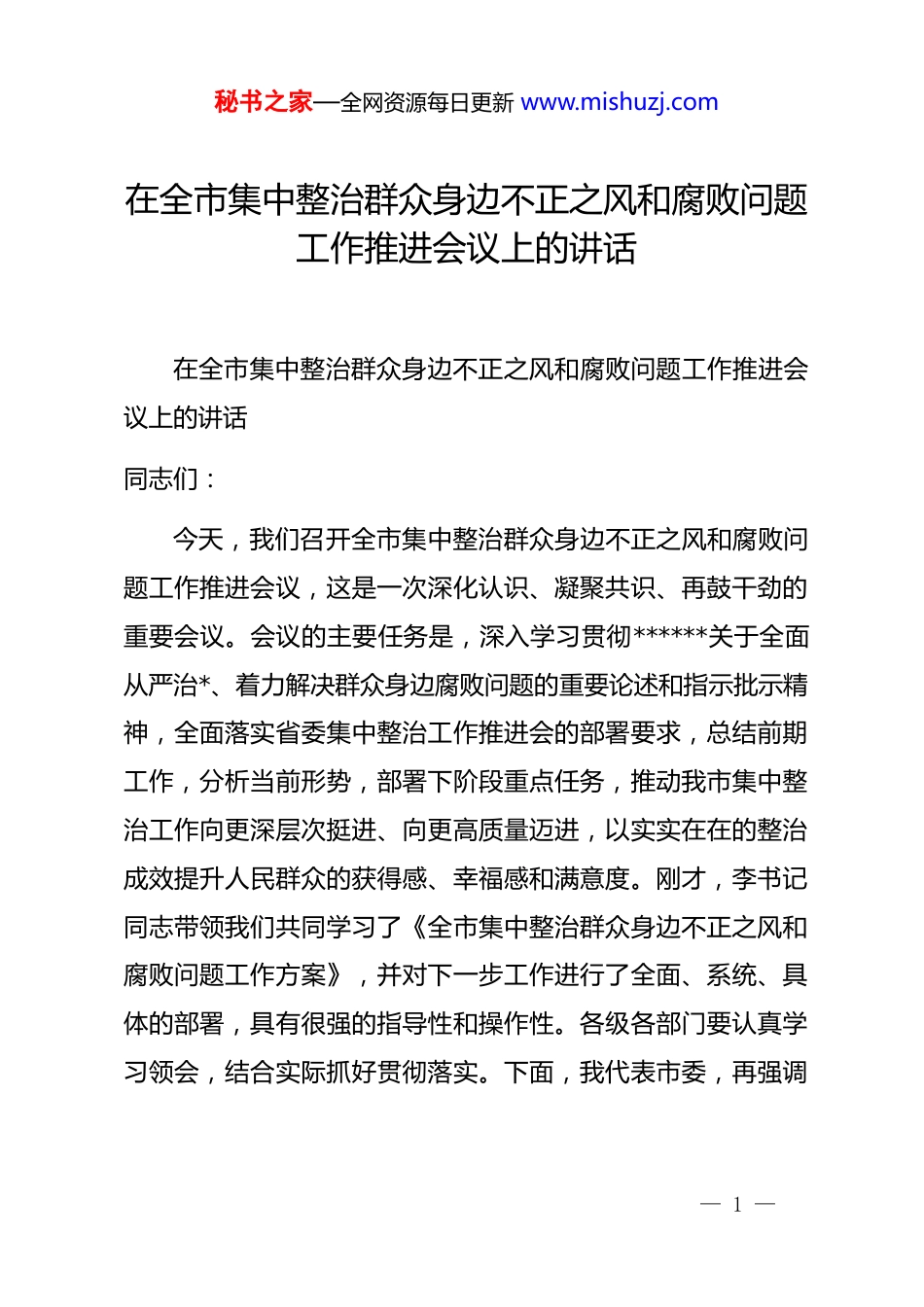 秘书之家—全网资源每日更新 www.mishuzj.com在全市集中整治群众身边不正之风和腐败问题工作推进会议上的讲话在全市集中整治群众身边不正之风和腐败问题工作推进会议上的讲话同志们:今天,我们召开全市集中整治群众身边不正之风和腐败问题工作推进会议,这是一次深化认识、凝聚共识、再鼓干劲的重要会议。会议的主要任务是,深入学习贯彻******关于全面从严治*、着力解决群众身边腐败问题的重要论述和指示批示精神,全面落实省委集中整治工作推进会的部署要求,总结前期工作,分析当前形势,部署下阶段重点任务,推动我市集中整治工作向更深层次挺进、向更高质量迈进,以实实在在的整治成效提升人民群众的获得感、幸福感和满意度。刚才,李书记同志带领我们共同学习了《全市集中整治群众身边不正之风和腐败问题工作方案》,并对下一步工作进行了全面、系统、具体的部署,具有很强的指导性和操作性。各级各部门要认真学习领会,结合实际抓好贯彻落实。下面,我代表市委,再强调— 1 —秘书之家—全网资源每日更新 www.mishuzj.com三点意见。一、提高政治站位,深化思想认识,深刻理解集中整治工作的极端重要性和现实紧迫性群众身边的不正之风和腐败问题,直接侵害群众切身利益啃食群众获得感,动摇*的执政根基,是*和人民的共同敌人。******反复强调,“‘微腐败’也可能成为‘大祸害’,它损害的是老百姓切身利益,啃食的是群众获得感,挥霍的是基层群众对*的信任。”我们必须从政治高度、全局高度深刻认识集中整治工作的重大意义。(一)这是践行“两个维护”、确保政令畅通的必然要求集中整治群众身边不正之风和腐败问题,不是一般的工作任务,而是一项严肃的政治任务。它检验着我们是否真正做到了对*忠诚,是否坚决贯彻落实了*中央的决策部署。各级*组织和广大*员干部要深刻认识到,这项工作抓得好不好,关系到*中央权威和集中统一领导在基层是否得到有效维护,关系到*的执政基础是否稳固。我们必须把思想和行动统一到******重要论述上来,统一到*中央和省委、市委的工作要求上来,以高度的政治自觉、思想自觉和行动自觉,把集中整治工作抓紧抓实抓出成效。— 2 —秘书之家—全网资源每日更新 www.mishuzj.com(二)这是坚持人民至上、厚植*的执政根基的迫切需要。“江山就是人民,人民就是江山。”我们*来自人民、植根人民、服务人民,*的百年奋斗史就是一部为人民谋幸福的历史。群众对发生在身边的“蝇贪蚁腐”感受最直接、反映最强烈。这些问题看似“小事”,但对于群众来说就是“天大的事”。解决好这些问题,就是在为群众办实事、解难事,就是在不断增强*同人民群众的血肉联系。我们必须始终坚持以人民为中心的发展思想,把群众满意不满意作为衡量一切工作的根本标准,通过集中整治,让群众感受到公平正义就在身边,感受到全面从严治*就在身边,从而不断赢得群众的信任和拥护。(三)这是纵深推进全面从严治*、营造风清气正政治生态的关键举措。全面从严治*永远在路上,*的自我革命永远在路上。基层是*的执政之基、力量之源。基层*员干部的作风和廉洁状况,直接影响着*在群众心中的形象。集中整治群众身边不正之风和腐败问题,是全面从严治*向基层延伸的重要抓手,是净化基层政治生态的有效途径。我们必须坚持问题导向,保持战略定力,以“零容忍”的态度惩治腐败,以“钉钉子”精神纠治不正之风,推动全面从严治*在基层落地生根,营造海晏河清的政治生态。— 3 —秘书之家—全网资源每日更新 www.mishuzj.com各级各部门要进一步深化对集中整治工作极端重要性和现实紧迫性的认识,坚决克服“松口气、歇歇脚”的懈怠思想,坚决摒弃“事不关己、高高挂起”的麻痹心态,坚决杜绝“走过场、搞形式”的应付行为。要坚持从政治上看、从政治上办,运用好学查改全过程管控机制,奔着问题去、盯着问题改,坚定不移把集中整治向纵深推进,切实解决群众身边的“急难愁盼”,进一步密切*同人民群众的血肉联系,为我市经济社会高质量发展提供坚强的政治和纪律保障。二、聚焦关键环节,精准发力施策,全面深入推进集中整治工作走深走实集中整治工作点多、线长、面广,必须突出...