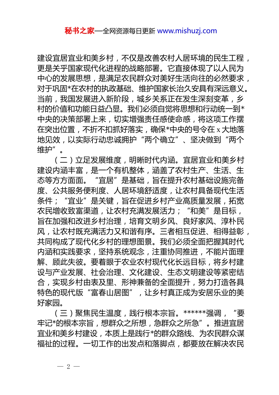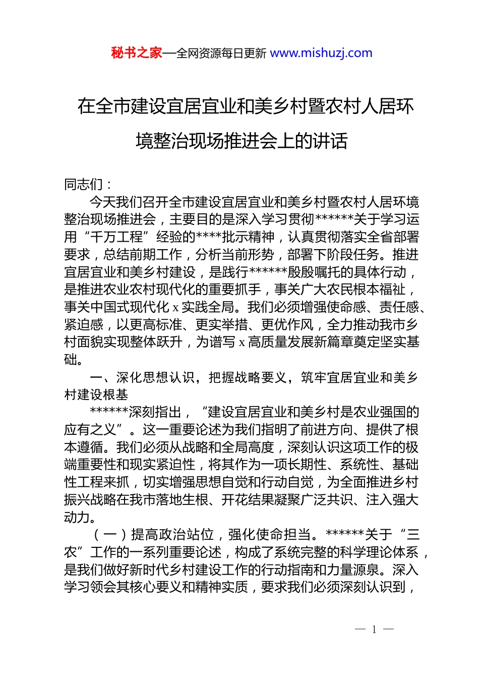 秘书之家—全网资源每日更新 www.mishuzj.com在全市建设宜居宜业和美乡村暨农村人居环境整治现场推进会上的讲话同志们:今天我们召开全市建设宜居宜业和美乡村暨农村人居环境整治现场推进会,主要目的是深入学习贯彻******关于学习运用“千万工程”经验的****批示精神,认真贯彻落实全省部署要求,总结前期工作,分析当前形势,部署下阶段任务。推进宜居宜业和美乡村建设,是践行******殷殷嘱托的具体行动,是推进农业农村现代化的重要抓手,事关广大农民根本福祉,事关中国式现代化 x 实践全局。我们必须增强使命感、责任感、紧迫感,以更高标准、更实举措、更优作风,全力推动我市乡村面貌实现整体跃升,为谱写 x 高质量发展新篇章奠定坚实基础。一、深化思想认识,把握战略要义,筑牢宜居宜业和美乡村建设根基******深刻指出,“建设宜居宜业和美乡村是农业强国的应有之义”。这一重要论述为我们指明了前进方向、提供了根本遵循。我们必须从战略和全局高度,深刻认识这项工作的极端重要性和现实紧迫性,将其作为一项长期性、系统性、基础性工程来抓,切实增强思想自觉和行动自觉,为全面推进乡村振兴战略在我市落地生根、开花结果凝聚广泛共识、注入强大动力。(一)提高政治站位,强化使命担当。******关于“三农”工作的一系列重要论述,构成了系统完整的科学理论体系,是我们做好新时代乡村建设工作的行动指南和力量源泉。深入学习领会其核心要义和精神实质,要求我们必须深刻认识到,— 1 —秘书之家—全网资源每日更新 www.mishuzj.com建设宜居宜业和美乡村,不仅是改善农村人居环境的民生工程,更是关乎国家现代化进程的战略部署。它直接体现了以人民为中心的发展思想,是满足农民群众对美好生活向往的必然要求,对于巩固*在农村的执政基础、维护国家长治久安具有深远意义。当前,我国发展进入新阶段,城乡关系正在发生深刻变革,乡村的价值和功能日益凸显。我们必须自觉将思想和行动统一到*中央的决策部署上来,切实增强责任感使命感,将这项工作摆在突出位置,不折不扣抓好落实,确保*中央的号令在 x 大地落地见效,以实际行动忠诚拥护“两个确立”、坚决做到“两个维护”。(二)立足发展维度,明晰时代内涵。宜居宜业和美乡村建设内涵丰富,是一个有机整体,涵盖了农村生产、生活、生态等方方面面。“宜居”是基础,旨在提升农村基础设施完备度、公共服务便利度、人居环境舒适度,让农村具备现代生活条件;“宜业”是关键,旨在促进乡村产业高质量发展,拓宽农民增收致富渠道,让农村充满发展活力;“和美”是目标,旨在加强和改进乡村治理,培育文明乡风、良好家风、淳朴民风,让农村既充满活力又和谐有序。三者相互促进、相得益彰,共同构成了现代化乡村的理想图景。我们必须全面把握其时代内涵和实践要求,坚持系统观念,注重协同推进,不能片面理解、顾此失彼。要着眼于农业农村现代化长远目标,将乡村建设与产业发展、社会治理、文化建设、生态文明建设等紧密结合,实现乡村由表及里、形神兼备的全面提升,努力打造各具特色的现代版“富春山居图”,让乡村真正成为安居乐业的美好家园。(三)聚焦民生温度,践行根本宗旨。******强调,“要牢记*的根本宗旨,想群众之所想,急群众之所急”。推进宜居宜业和美乡村建设,本质上是践行*的群众路线、为农民群众谋福祉的过程。一切工作的出发点和落脚点,都要放在解决农民— 2 —秘书之家—全网资源每日更新 www.mishuzj.com群众最关心、最直接、最现实的利益问题上。要始终尊重农民意愿,激发农民主体作用,保障农民知情权、参与权、表达权、监督权,变“要我做”为“我要做”,防止代替农民选择、搞形式主义、做表面文章。要把农民满意不满意、答应不答应作为衡量工作成效的根本标准,聚焦群众急难愁盼,用心用情用力办好民生实事,持续改善农村住房、饮水、道路、用电、通讯等条件,提升教育、医疗、养老、文化等公共服务水平,让改革发展成果更多更公平惠及广大农民,不断增强农民群众的获得感、幸福感、安全感,密切*同人民群众的血肉联系。(四)认清差距不足,增强行动自觉。在肯定成绩的同时,我...