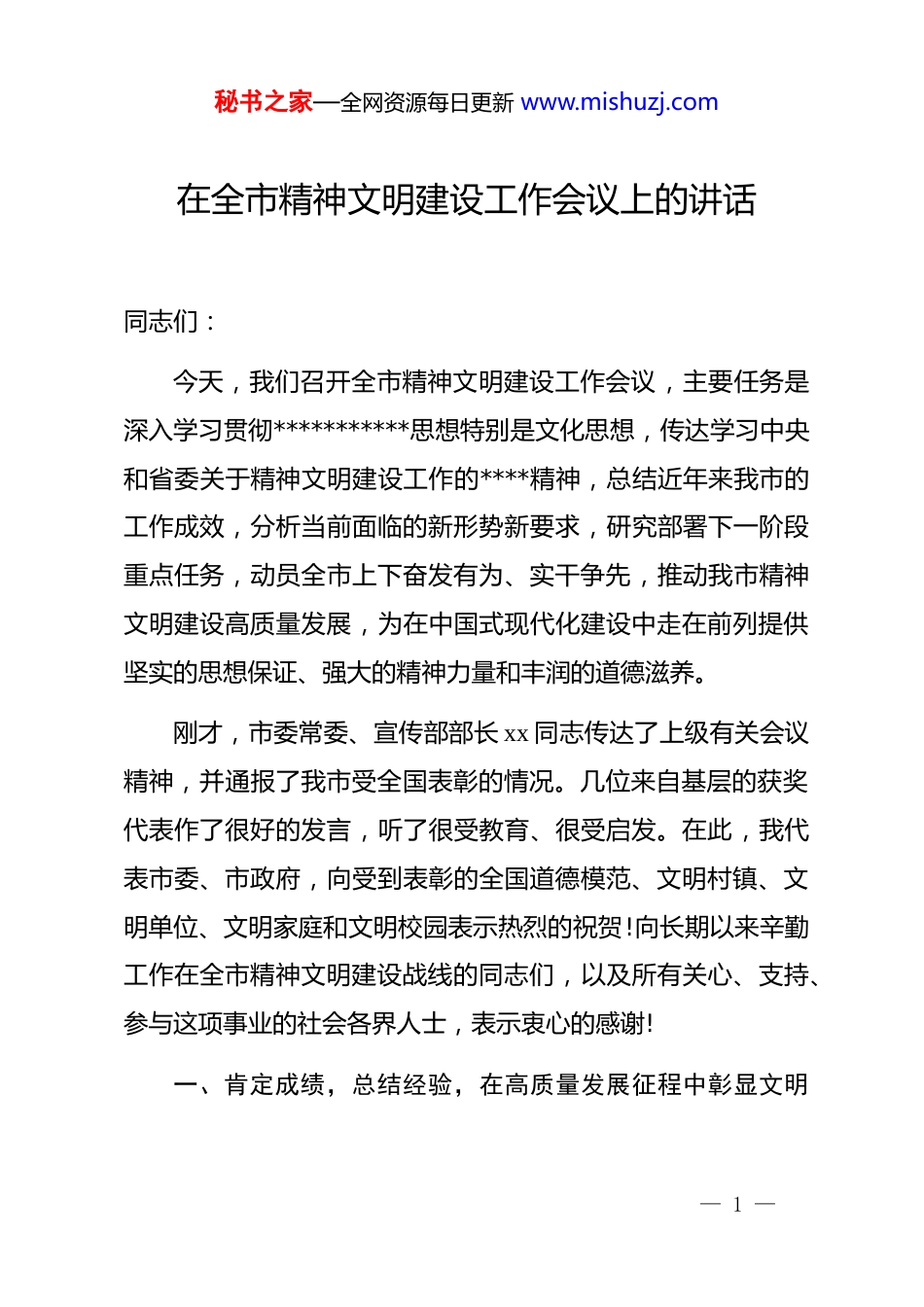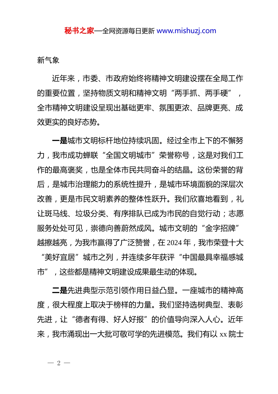 秘书之家—全网资源每日更新 www.mishuzj.com在全市精神文明建设工作会议上的讲话同志们:今天,我们召开全市精神文明建设工作会议,主要任务是深入学习贯彻***********思想特别是文化思想,传达学习中央和省委关于精神文明建设工作的****精神,总结近年来我市的工作成效,分析当前面临的新形势新要求,研究部署下一阶段重点任务,动员全市上下奋发有为、实干争先,推动我市精神文明建设高质量发展,为在中国式现代化建设中走在前列提供坚实的思想保证、强大的精神力量和丰润的道德滋养。刚才,市委常委、宣传部部长 xx 同志传达了上级有关会议精神,并通报了我市受全国表彰的情况。几位来自基层的获奖代表作了很好的发言,听了很受教育、很受启发。在此,我代表市委、市政府,向受到表彰的全国道德模范、文明村镇、文明单位、文明家庭和文明校园表示热烈的祝贺!向长期以来辛勤工作在全市精神文明建设战线的同志们,以及所有关心、支持、参与这项事业的社会各界人士,表示衷心的感谢!一、肯定成绩,总结经验,在高质量发展征程中彰显文明— 1 —秘书之家—全网资源每日更新 www.mishuzj.com新气象近年来,市委、市政府始终将精神文明建设摆在全局工作的重要位置,坚持物质文明和精神文明“两手抓、两手硬”,全市精神文明建设呈现出基础更牢、氛围更浓、品牌更亮、成效更实的良好态势。一是城市文明标杆地位持续巩固。经过全市上下的不懈努力,我市成功蝉联“全国文明城市”荣誉称号,这是对我们工作的最高褒奖,也是全体市民共同奋斗的结晶。这份荣誉的背后,是城市治理能力的系统性提升,是城市环境面貌的深层次改善,更是市民文明素养的整体性跃升。我们欣喜地看到,礼让斑马线、垃圾分类、有序排队已成为市民的自觉行动;志愿服务处处可见,崇德向善蔚然成风。城市文明的“金字招牌”越擦越亮,为我市赢得了广泛赞誉,在 2024 年,我市荣登十大“美好宜居”城市之列,并连续多年获评“中国最具幸福感城市”,这些都是精神文明建设成果最生动的体现。二是先进典型示范引领作用日益凸显。一座城市的精神高度,很大程度上取决于榜样的力量。我们坚持选树典型、表彰先进,让“德者有得、好人好报”的价值导向深入人心。近年来,我市涌现出一大批可敬可学的先进模范。我们有以 xx 院士— 2 —秘书之家—全网资源每日更新 www.mishuzj.com为代表的全国道德模范,他们是引领时代的精神旗帜;我们建成了超过 21 个全国文明村镇,如 xx 区 xx 镇、xx 区 xx 村等,它们是乡村振兴中物质与精神共富的典范;我们拥有 28 家全国文明单位,如 xx 电子、xx 供电局等,它们是爱岗敬业、服务社会的行业标杆;我们还有 4 户全国文明家庭和 4 所全国文明校园,如 xx 家庭、xx 中学等,它们在弘扬优良家风、落实立德树人根本任务上作出了卓越表率。这些先进典型,如满天繁星,照亮了城市的文明天空,凝聚起强大的社会正能量。三是公民道德实践基础不断夯实。我们坚持以培育和践行社会主义核心价值观为主线,统筹推进文明培育、文明实践、文明创建。特别是新时代文明实践中心建设取得了长足进步,目前已建成覆盖城乡的实践中心、所、站 3157 个,并打造了229 个特色驿站,构建了“15 分钟文明实践服务圈”,有效打通了宣传群众、教育群众、关心群众、服务群众的“最后一公里”。我们深入开展“迎全运、讲文明、树新风”等一系列主题实践活动,引导广大市民在参与中接受教育、提升觉悟。城乡精神文明建设融合发展迈出坚实步伐,全市超过 90%的行政村达到了区级以上文明村标准,文明之花在城市的每一个角落绚烂绽放。— 3 —秘书之家—全网资源每日更新 www.mishuzj.com四是文化事业文化产业发展成果丰硕。精神文明建设离不开文化的繁荣兴盛。我们坚持以文铸魂、以文兴业,推动文化软实力和产业竞争力同步提升。2023 年,我市文化产业增加值突破 2000 亿元,占全市 gdp 比重超过 6%,规模以上文化企业营业收入达到 5582.34 亿元,同比增长 15.9%,展现出强劲的发展活力。2024 年上半年,文化产业继续保持稳健增长,营收达 2766.93 亿元。尤其以...