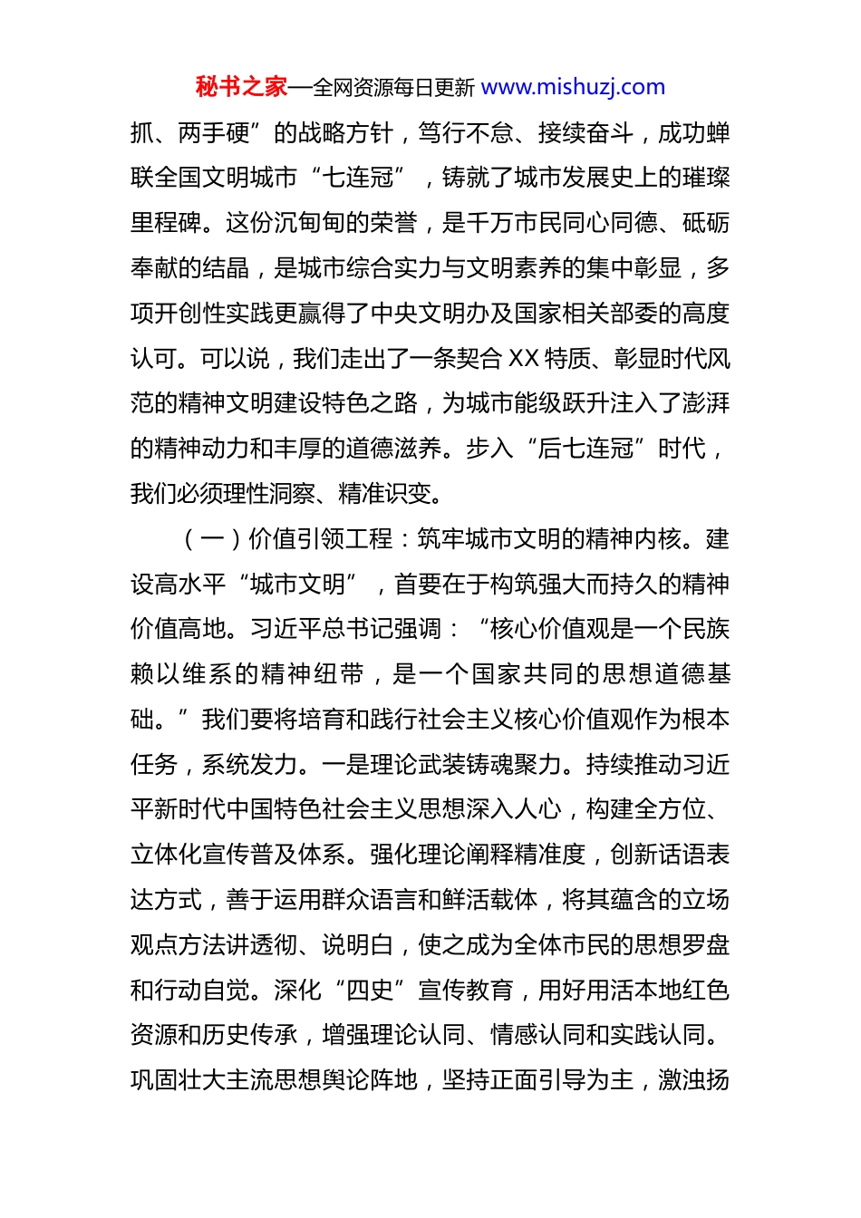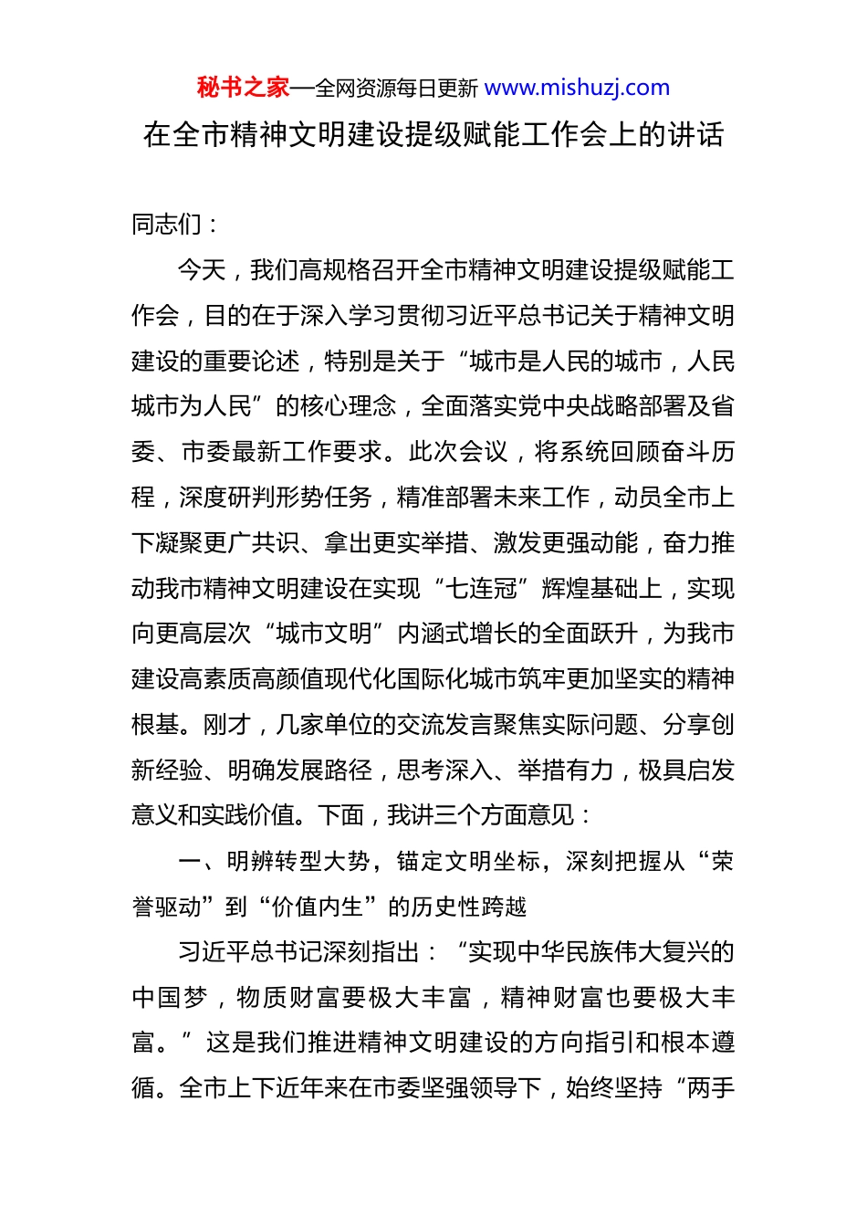 秘书之家—全网资源每日更新 www.mishuzj.com在全市精神文明建设提级赋能工作会上的讲话 同志们:今天,我们高规格召开全市精神文明建设提级赋能工作会,目的在于深入学习贯彻习近平总书记关于精神文明建设的重要论述,特别是关于“城市是人民的城市,人民城市为人民”的核心理念,全面落实党中央战略部署及省委、市委最新工作要求。此次会议,将系统回顾奋斗历程,深度研判形势任务,精准部署未来工作,动员全市上下凝聚更广共识、拿出更实举措、激发更强动能,奋力推动我市精神文明建设在实现“七连冠”辉煌基础上,实现向更高层次“城市文明”内涵式增长的全面跃升,为我市建设高素质高颜值现代化国际化城市筑牢更加坚实的精神根基。刚才,几家单位的交流发言聚焦实际问题、分享创新经验、明确发展路径,思考深入、举措有力,极具启发意义和实践价值。下面,我讲三个方面意见:一、明辨转型大势,锚定文明坐标,深刻把握从“荣誉驱动”到“价值内生”的历史性跨越习近平总书记深刻指出:“实现中华民族伟大复兴的中国梦,物质财富要极大丰富,精神财富也要极大丰富。”这是我们推进精神文明建设的方向指引和根本遵循。全市上下近年来在市委坚强领导下,始终坚持“两手秘书之家—全网资源每日更新 www.mishuzj.com抓、两手硬”的战略方针,笃行不怠、接续奋斗,成功蝉联全国文明城市“七连冠”,铸就了城市发展史上的璀璨里程碑。这份沉甸甸的荣誉,是千万市民同心同德、砥砺奉献的结晶,是城市综合实力与文明素养的集中彰显,多项开创性实践更赢得了中央文明办及国家相关部委的高度认可。可以说,我们走出了一条契合 XX 特质、彰显时代风范的精神文明建设特色之路,为城市能级跃升注入了澎湃的精神动力和丰厚的道德滋养。步入“后七连冠”时代,我们必须理性洞察、精准识变。(一)价值引领工程:筑牢城市文明的精神内核。建设高水平“城市文明”,首要在于构筑强大而持久的精神价值高地。习近平总书记强调:“核心价值观是一个民族赖以维系的精神纽带,是一个国家共同的思想道德基础。”我们要将培育和践行社会主义核心价值观作为根本任务,系统发力。一是理论武装铸魂聚力。持续推动习近平新时代中国特色社会主义思想深入人心,构建全方位、立体化宣传普及体系。强化理论阐释精准度,创新话语表达方式,善于运用群众语言和鲜活载体,将其蕴含的立场观点方法讲透彻、说明白,使之成为全体市民的思想罗盘和行动自觉。深化“四史”宣传教育,用好用活本地红色资源和历史传承,增强理论认同、情感认同和实践认同。巩固壮大主流思想舆论阵地,坚持正面引导为主,激浊扬秘书之家—全网资源每日更新 www.mishuzj.com清,唱响主旋律,营造正气充盈、昂扬向上的社会氛围,打牢全市人民团结奋斗的共同思想基础。二是道德建设成风化人。深入实施公民道德建设工程,大力推进社会公德、职业道德、家庭美德、个人品德建设。要创新开展道德模范、身边好人等先进典型选树宣传,放大榜样感召力,弘扬真善美,激发见贤思齐的社会风尚。将道德要求有机融入市民公约、村规民约、行业规范、学生守则,强化规则意识与契约精神。健全诚信建设长效机制,完善守信联合激励和失信联合惩戒机制,营造守信光荣、失信可耻的浓厚氛围,提升全社会道德水准和信用水平。三是实践养成塑造新人。健全志愿服务制度体系和工作机制,推动“爱心 XX”品牌提档升级,推进志愿服务制度化、规范化、专业化、常态化。广泛开展形式多样的群众性精神文明创建活动,深化文明单位、文明村镇、文明家庭、文明校园创建内涵。聚焦市民文明行为习惯养成,强化法律法规对不文明行为的刚性约束,辅之以宣传引导和柔性治理,引导市民从点滴做起,知行合一,在参与实践中实现自我教育、自我提升,培育担当民族复兴大任的时代新人。(二)城乡善治图谱:破解融合发展关键瓶颈。城乡精神文明发展的不平衡不充分,是制约我市迈向高品质“城市文明”的主要瓶颈。城中村现代化治理作为城乡融秘书之家—全网资源每日更新 www.mishuzj.com合的关键点和城乡文明的交汇点,必须作为攻坚重点来抓。一是深化治理体系再造。坚持高位推动,...