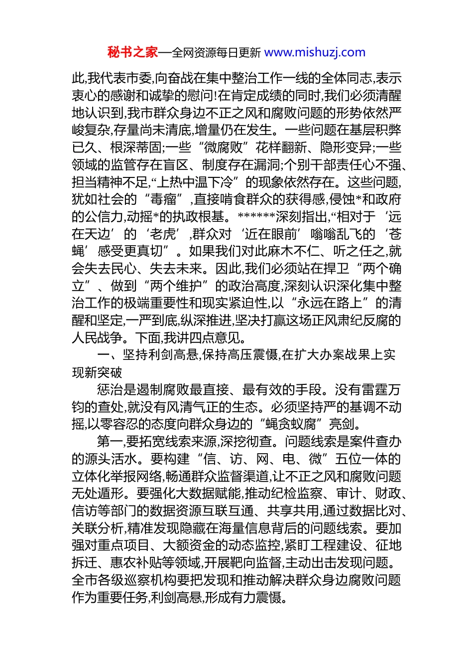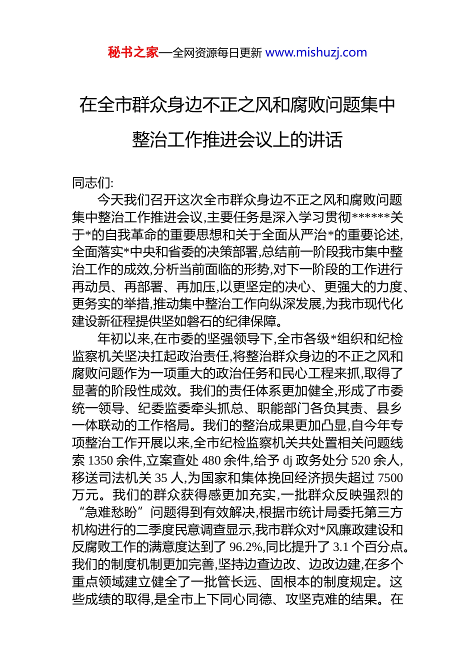 秘书之家—全网资源每日更新 www.mishuzj.com在全市群众身边不正之风和腐败问题集中整治工作推进会议上的讲话同志们:今天我们召开这次全市群众身边不正之风和腐败问题集中整治工作推进会议,主要任务是深入学习贯彻******关于*的自我革命的重要思想和关于全面从严治*的重要论述,全面落实*中央和省委的决策部署,总结前一阶段我市集中整治工作的成效,分析当前面临的形势,对下一阶段的工作进行再动员、再部署、再加压,以更坚定的决心、更强大的力度、更务实的举措,推动集中整治工作向纵深发展,为我市现代化建设新征程提供坚如磐石的纪律保障。年初以来,在市委的坚强领导下,全市各级*组织和纪检监察机关坚决扛起政治责任,将整治群众身边的不正之风和腐败问题作为一项重大的政治任务和民心工程来抓,取得了显著的阶段性成效。我们的责任体系更加健全,形成了市委统一领导、纪委监委牵头抓总、职能部门各负其责、县乡一体联动的工作格局。我们的整治成果更加凸显,自今年专项整治工作开展以来,全市纪检监察机关共处置相关问题线索 1350 余件,立案查处 480 余件,给予 dj 政务处分 520 余人,移送司法机关 35 人,为国家和集体挽回经济损失超过 7500万元。我们的群众获得感更加充实,一批群众反映强烈的“急难愁盼”问题得到有效解决,根据市统计局委托第三方机构进行的二季度民意调查显示,我市群众对*风廉政建设和反腐败工作的满意度达到了 96.2%,同比提升了 3.1 个百分点。我们的制度机制更加完善,坚持边查边改、边改边建,在多个重点领域建立健全了一批管长远、固根本的制度规定。这些成绩的取得,是全市上下同心同德、攻坚克难的结果。在秘书之家—全网资源每日更新 www.mishuzj.com此,我代表市委,向奋战在集中整治工作一线的全体同志,表示衷心的感谢和诚挚的慰问!在肯定成绩的同时,我们必须清醒地认识到,我市群众身边不正之风和腐败问题的形势依然严峻复杂,存量尚未清底,增量仍在发生。一些问题在基层积弊已久、根深蒂固;一些“微腐败”花样翻新、隐形变异;一些领域的监管存在盲区、制度存在漏洞;个别干部责任心不强、担当精神不足,“上热中温下冷”的现象依然存在。这些问题,犹如社会的“毒瘤”,直接啃食群众的获得感,侵蚀*和政府的公信力,动摇*的执政根基。******深刻指出,“相对于‘远在天边’的‘老虎’,群众对‘近在眼前’嗡嗡乱飞的‘苍蝇’感受更真切”。如果我们对此麻木不仁、听之任之,就会失去民心、失去未来。因此,我们必须站在捍卫“两个确立”、做到“两个维护”的政治高度,深刻认识深化集中整治工作的极端重要性和现实紧迫性,以“永远在路上”的清醒和坚定,一严到底,纵深推进,坚决打赢这场正风肃纪反腐的人民战争。下面,我讲四点意见。一、坚持利剑高悬,保持高压震慑,在扩大办案战果上实现新突破惩治是遏制腐败最直接、最有效的手段。没有雷霆万钧的查处,就没有风清气正的生态。必须坚持严的基调不动摇,以零容忍的态度向群众身边的“蝇贪蚁腐”亮剑。第一,要拓宽线索来源,深挖彻查。问题线索是案件查办的源头活水。要构建“信、访、网、电、微”五位一体的立体化举报网络,畅通群众监督渠道,让不正之风和腐败问题无处遁形。要强化大数据赋能,推动纪检监察、审计、财政、信访等部门的数据资源互联互通、共享共用,通过数据比对、关联分析,精准发现隐藏在海量信息背后的问题线索。要加强对重点项目、大额资金的动态监控,紧盯工程建设、征地拆迁、惠农补贴等领域,开展靶向监督,主动出击发现问题。全市各级巡察机构要把发现和推动解决群众身边腐败问题作为重要任务,利剑高悬,形成有力震慑。秘书之家—全网资源每日更新 www.mishuzj.com第二,要狠抓案件查办,严惩不贷。对群众反映强烈、社会影响恶劣的案件,必须重拳出击、快查快结。市纪委监委要发挥好牵头抓总作用,对重大复杂案件实行提级办理或直查直办,排除干扰阻力,确保一查到底。要聚焦乡村振兴领域的项目资金、教育医疗领域的乱收费、社会保障领域的优亲厚友、食品药品安全领域的监管失守、执法司法领域的不公不廉等突出问题,集中力量突破一批典型案件。前段时间,我们严肃查处了市 x 局下属单位原负责人 x 在...