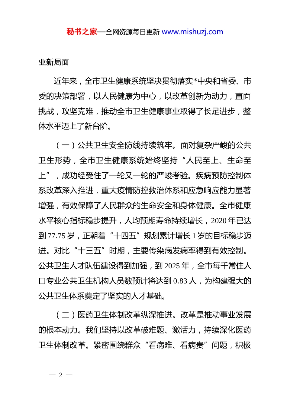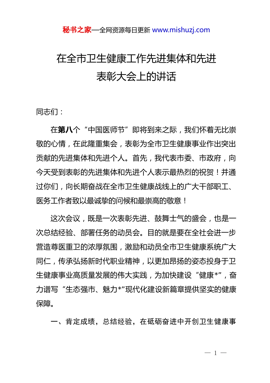 秘书之家—全网资源每日更新 www.mishuzj.com在全市卫生健康工作先进集体和先进表彰大会上的讲话同志们:在第八个“中国医师节”即将到来之际,我们怀着无比崇敬的心情,在此隆重集会,表彰为全市卫生健康事业作出突出贡献的先进集体和先进个人。首先,我代表市委、市政府,向今天受到表彰的先进集体和先进个人表示最热烈的祝贺!并通过你们,向长期奋战在全市卫生健康战线上的广大干部职工、医务工作者致以最诚挚的问候和最崇高的敬意!这次会议,既是一次表彰先进、鼓舞士气的盛会,也是一次总结经验、部署任务的动员会。目的就是要在全社会进一步营造尊医重卫的浓厚氛围,激励和动员全市卫生健康系统广大同仁,传承弘扬新时代职业精神,以更加昂扬的姿态投身于卫生健康事业高质量发展的伟大实践,为加快建设“健康*”,奋力谱写“生态强市、魅力*”现代化建设新篇章提供坚实的健康保障。一、肯定成绩,总结经验,在砥砺奋进中开创卫生健康事— 1 —秘书之家—全网资源每日更新 www.mishuzj.com业新局面近年来,全市卫生健康系统坚决贯彻落实*中央和省委、市委的决策部署,以人民健康为中心,以改革创新为动力,直面挑战,攻坚克难,推动全市卫生健康事业取得了长足进步,整体水平迈上了新台阶。(一)公共卫生安全防线持续筑牢。面对复杂严峻的公共卫生形势,全市卫生健康系统始终坚持“人民至上、生命至上”,成功经受住了一轮又一轮的严峻考验。疾病预防控制体系改革深入推进,重大疫情防控救治体系和应急响应能力显著增强,有效保障了人民群众的生命安全和身体健康。全市健康水平核心指标稳步提升,人均预期寿命持续增长,2020 年已达到 77.75 岁,正朝着“十四五”规划累计增长 1 岁的目标稳步迈进。对比“十三五”时期,主要传染病发病率得到有效控制。公共卫生人才队伍建设得到加强,到 2025 年,全市每千常住人口专业公共卫生机构人员数预计将达到 0.83 人,为构建强大的公共卫生体系奠定了坚实的人才基础。(二)医药卫生体制改革纵深推进。改革是推动事业发展的根本动力。我们坚持以改革破难题、激活力,持续深化医药卫生体制改革。紧密围绕群众“看病难、看病贵”问题,积极— 2 —秘书之家—全网资源每日更新 www.mishuzj.com推动“三医”协同发展和治理,公立医院综合改革不断深化,现代医院管理制度逐步建立。分级诊疗体系日益完善,基层医疗卫生服务能力得到实质性提升,乡村一体化改革成果得到巩固,乡镇卫生院和社区卫生服务中心作为健康“守门人”的能力显著增强。我们积极融入区域协同发展大局,加强与*地区高端医疗资源的共建共享,让广大市民在家门口就能享受到更加优质的医疗服务。(三)健康产业融合发展成效显著。我们立足市情,充分挖掘和利用独特的生态与资源优势,将健康事业与经济发展紧密结合,探索出一条富有*特色的健康产业发展新路。一是中医药传承创新迈出坚实步伐。我们深入贯彻落实中医药传承创新发展的各项部署,召开了全市中医药传承创新发展大会,系统谋划产业未来。“基层中医药综合实力提档行动”扎实开展,中医药服务网络体系基本形成。截至 2023 年,全市已有 9 个县(市、区)达到创建全国基层中医药“示范市(县)”标准,新增了一批国家级和省级中医药优势专科,建成 1000 个村卫生室“中医阁”,市中医院也成功通过国家级规培基地验收。我们立足*道地药材优势,着力打造中药材良种繁育种植基地,推动中医药全产业链发展,叫响了“中药保健、食药同源”的特— 3 —秘书之家—全网资源每日更新 www.mishuzj.com色品牌。二是温泉康养产业实现突破性增长。我们抢抓消费升级和健康需求增长的重大机遇,将温泉康养产业作为推动高质量发展的战略支点,大力实施“温泉+”战略。通过高标准编制规划、成立工作专班、出台扶持政策,成功吸引了一批重大项目落地。2023 年,全市共谋划实施温泉旅游康养产业项目 41 个,总投资高达 429.27 亿元;全年接待温泉康养游客近 200 万人次,实现旅游收入 16.55 亿元,温泉经济真正成了拉动我市经济增长的新引擎。“皇家避暑地·热河温泉城”的品牌影响力日益扩大,...