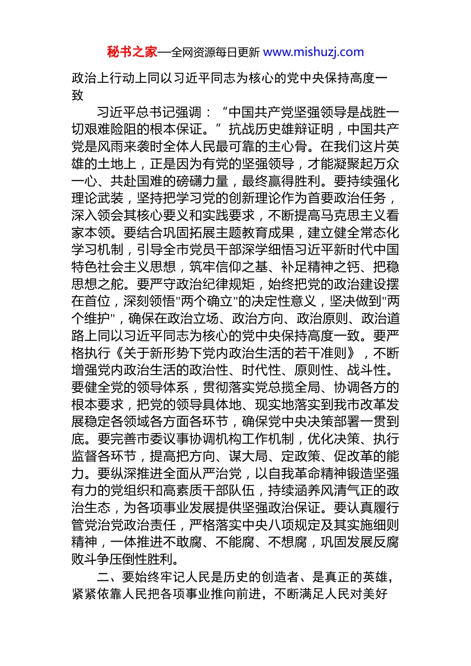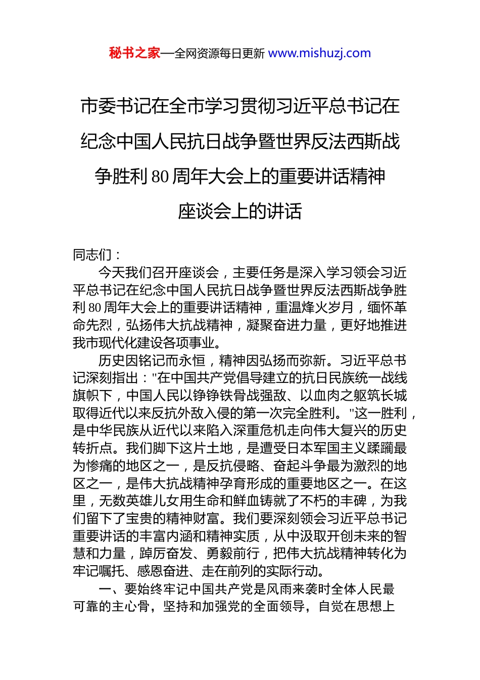 秘书之家—全网资源每日更新 www.mishuzj.com市委书记在全市学习贯彻习近平总书记在纪念中国人民抗日战争暨世界反法西斯战争胜利 80 周年大会上的重要讲话精神座谈会上的讲话同志们:今天我们召开座谈会,主要任务是深入学习领会习近平总书记在纪念中国人民抗日战争暨世界反法西斯战争胜利 80 周年大会上的重要讲话精神,重温烽火岁月,缅怀革命先烈,弘扬伟大抗战精神,凝聚奋进力量,更好地推进我市现代化建设各项事业。历史因铭记而永恒,精神因弘扬而弥新。习近平总书记深刻指出:"在中国共产党倡导建立的抗日民族统一战线旗帜下,中国人民以铮铮铁骨战强敌、以血肉之躯筑长城取得近代以来反抗外敌入侵的第一次完全胜利。"这一胜利,是中华民族从近代以来陷入深重危机走向伟大复兴的历史转折点。我们脚下这片土地,是遭受日本军国主义蹂躏最为惨痛的地区之一,是反抗侵略、奋起斗争最为激烈的地区之一,是伟大抗战精神孕育形成的重要地区之一。在这里,无数英雄儿女用生命和鲜血铸就了不朽的丰碑,为我们留下了宝贵的精神财富。我们要深刻领会习近平总书记重要讲话的丰富内涵和精神实质,从中汲取开创未来的智慧和力量,踔厉奋发、勇毅前行,把伟大抗战精神转化为牢记嘱托、感恩奋进、走在前列的实际行动。一、要始终牢记中国共产党是风雨来袭时全体人民最可靠的主心骨,坚持和加强党的全面领导,自觉在思想上秘书之家—全网资源每日更新 www.mishuzj.com政治上行动上同以习近平同志为核心的党中央保持高度一致习近平总书记强调:“中国共产党坚强领导是战胜一切艰难险阻的根本保证。”抗战历史雄辩证明,中国共产党是风雨来袭时全体人民最可靠的主心骨。在我们这片英雄的土地上,正是因为有党的坚强领导,才能凝聚起万众一心、共赴国难的磅礴力量,最终赢得胜利。要持续强化理论武装,坚持把学习党的创新理论作为首要政治任务,深入领会其核心要义和实践要求,不断提高马克思主义看家本领。要结合巩固拓展主题教育成果,建立健全常态化学习机制,引导全市党员干部深学细悟习近平新时代中国特色社会主义思想,筑牢信仰之基、补足精神之钙、把稳思想之舵。要严守政治纪律规矩,始终把党的政治建设摆在首位,深刻领悟"两个确立"的决定性意义,坚决做到"两个维护",确保在政治立场、政治方向、政治原则、政治道路上同以习近平同志为核心的党中央保持高度一致。要严格执行《关于新形势下党内政治生活的若干准则》,不断增强党内政治生活的政治性、时代性、原则性、战斗性。要健全党的领导体系,贯彻落实党总揽全局、协调各方的根本要求,把党的领导具体地、现实地落实到我市改革发展稳定各领域各方面各环节,确保党中央决策部署一贯到底。要完善市委议事协调机构工作机制,优化决策、执行监督各环节,提高把方向、谋大局、定政策、促改革的能力。要纵深推进全面从严治党,以自我革命精神锻造坚强有力的党组织和高素质干部队伍,持续涵养风清气正的政治生态,为各项事业发展提供坚强政治保证。要认真履行管党治党政治责任,严格落实中央八项规定及其实施细则精神,一体推进不敢腐、不能腐、不想腐,巩固发展反腐败斗争压倒性胜利。二、要始终牢记人民是历史的创造者、是真正的英雄,紧紧依靠人民把各项事业推向前进,不断满足人民对美好秘书之家—全网资源每日更新 www.mishuzj.com生活的向往,用现代化建设成果回报人民、告慰历史习近平总书记深刻指出:“人民是历史的创造者、是真正的英雄。”抗战的伟大胜利,是人民战争的胜利,彰显了人民群众的巨大力量和伟大创造。我们必须始终坚持人民至上,一切为了人民、一切依靠人民。要牢固树立正确政绩观,坚持问计于民、问需于民,把群众满意作为衡量一切工作的根本标准,用心用情用力解决好群众急难愁盼问题,扎实推进共同富裕。要聚焦"一老一小一青壮",着力办好就业、教育、医疗、养老、托育等民生实事,让人民群众的获得感成色更足、幸福感更可持续、安全感更有保障。要尊重人民首创精神,畅通群众参与社会治理的渠道,搭建更多平台载体,激发人民群众的积极性、主动性创造性,汇聚起现代化建设的磅礴力量。要完善基层民主...