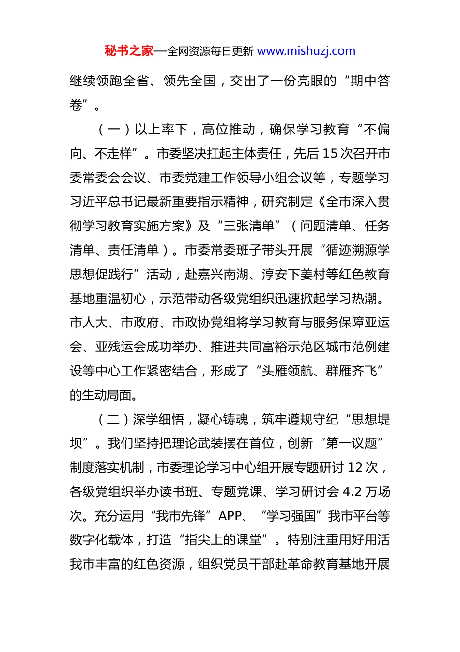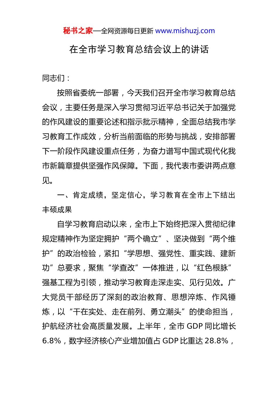秘书之家—全网资源每日更新 www.mishuzj.com在全市学习教育总结会议上的讲话 同志们:按照省委统一部署,今天我们召开全市学习教育总结会议,主要任务是深入学习贯彻习近平总书记关于加强党的作风建设的重要论述和指示批示精神,全面总结我市学习教育工作成效,分析当前面临的形势与挑战,安排部署下一阶段作风建设重点任务,为奋力谱写中国式现代化我市新篇章提供坚强作风保障。下面,我代表市委讲两点意见。一、肯定成绩,坚定信心,学习教育在全市上下结出丰硕成果自学习教育启动以来,全市上下始终把深入贯彻纪律规定精神作为坚定拥护“两个确立”、坚决做到“两个维护”的政治检验,紧扣“学思想、强党性、重实践、建新功”总要求,聚焦“学查改”一体推进,以“红色根脉”强基工程为引领,推动学习教育走深走实、见行见效。广大党员干部经历了深刻的政治教育、思想淬炼、作风锤炼,以“干在实处、走在前列、勇立潮头”的使命担当,护航经济社会高质量发展。上半年,全市 GDP 同比增长6.8%,数字经济核心产业增加值占 GDP 比重达 28.8%,秘书之家—全网资源每日更新 www.mishuzj.com继续领跑全省、领先全国,交出了一份亮眼的“期中答卷”。(一)以上率下,高位推动,确保学习教育“不偏向、不走样”。市委坚决扛起主体责任,先后 15 次召开市委常委会会议、市委党建工作领导小组会议等,专题学习习近平总书记最新重要指示精神,研究制定《全市深入贯彻学习教育实施方案》及“三张清单”(问题清单、任务清单、责任清单)。市委常委班子带头开展“循迹溯源学思想促践行”活动,赴嘉兴南湖、淳安下姜村等红色教育基地重温初心,示范带动各级党组织迅速掀起学习热潮。市人大、市政府、市政协党组将学习教育与服务保障亚运会、亚残运会成功举办、推进共同富裕示范区城市范例建设等中心工作紧密结合,形成了“头雁领航、群雁齐飞”的生动局面。(二)深学细悟,凝心铸魂,筑牢遵规守纪“思想堤坝”。我们坚持把理论武装摆在首位,创新“第一议题”制度落实机制,市委理论学习中心组开展专题研讨 12 次,各级党组织举办读书班、专题党课、学习研讨会 4.2 万场次。充分运用“我市先锋”APP、“学习强国”我市平台等数字化载体,打造“指尖上的课堂”。特别注重用好用活我市丰富的红色资源,组织党员干部赴革命教育基地开展秘书之家—全网资源每日更新 www.mishuzj.com沉浸式学习 3800 余场次。针对年轻干部群体,实施“青廉工程”,开设“青廉课堂”2300 余场,编印《年轻干部廉洁从政警示录》,引导青年一代扣好“第一粒扣子”。(三)刀刃向内,真查实改,解决突出问题“见真章、求实效”。我们坚持问题导向,聚焦省委部署的“三项集中整治”,结合我市实际延伸整治“文山会海”、“指尖上的形式主义”等 6 类突出问题。市委常委会带头查摆问题 32 项,制定整改措施 89 条。全市各级党组织和党员干部深入开展“六查六看”,建立问题台账,实行销号管理。创新推出“民情直通车”、“企业服务日”等机制,通过“民呼我为”统一平台收集群众诉求 8.7 万件,办结率达 98.6%。针对“停车难”、“入学难”、“就医挤”等民生痛点,实施“民生实事攻坚行动”,新增公共停车泊位 5.2 万个,新改扩建中小学、幼儿园 56 所,建成“15 分钟医疗圈”服务点 1200 余个,群众获得感显著增强。(四)开门纳谏,问计于民,以群众满意度“校准风向标”。我们始终把群众满意作为根本标准,深入践行“四下基层”优良传统,市四套班子领导带头下基层调研230 余次,解决实际问题 460 余个。创新开展“媒体问政”、“公述民评”活动,邀请“两代表一委员”、企业秘书之家—全网资源每日更新 www.mishuzj.com家代表、市民观察员等参与整改成效评议。在全市推广“社区议事厅”、“小区微治理”等做法,推动“问题解决在基层、矛盾化解在萌芽”。针对企业反映强烈的审批流程繁琐问题,深化“最多跑一次”改革,推行“一业一证”、“证照分离”等举措,企业开办时间压缩至 0.5 个工作日,政务服务事项网上可办率达 99.8%,营商环境评价连续多年位居全国前列。(...