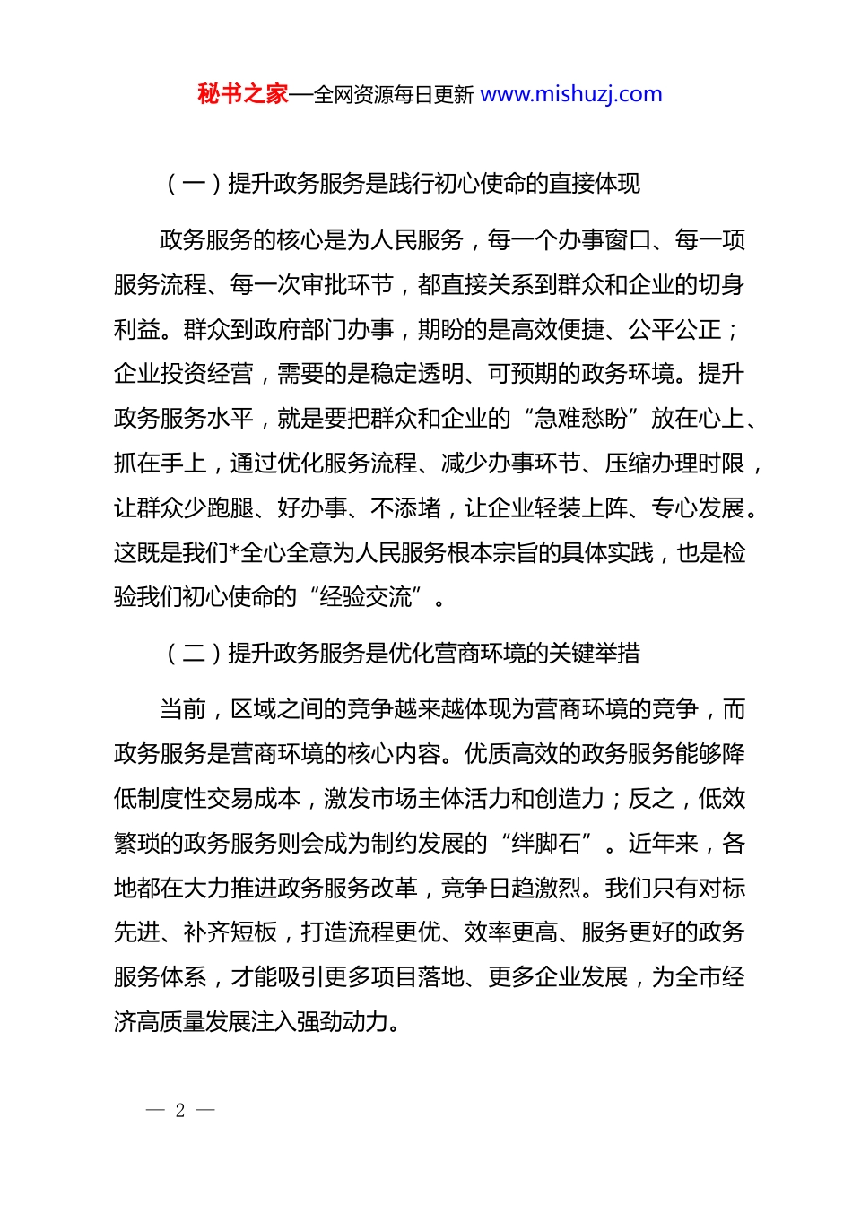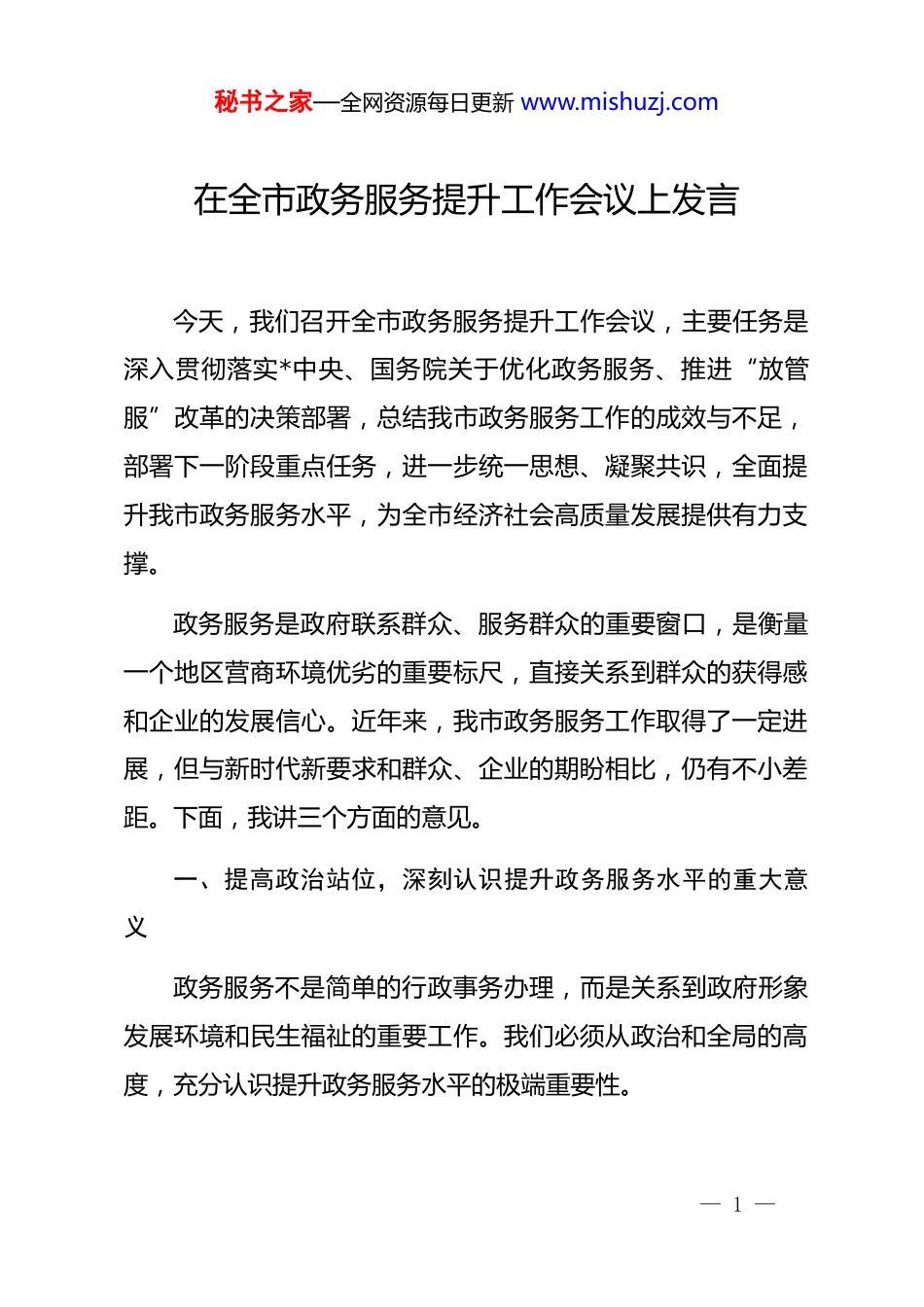 秘书之家—全网资源每日更新 www.mishuzj.com在全市政务服务提升工作会议上发言今天,我们召开全市政务服务提升工作会议,主要任务是深入贯彻落实*中央、国务院关于优化政务服务、推进“放管服”改革的决策部署,总结我市政务服务工作的成效与不足,部署下一阶段重点任务,进一步统一思想、凝聚共识,全面提升我市政务服务水平,为全市经济社会高质量发展提供有力支撑。政务服务是政府联系群众、服务群众的重要窗口,是衡量一个地区营商环境优劣的重要标尺,直接关系到群众的获得感和企业的发展信心。近年来,我市政务服务工作取得了一定进展,但与新时代新要求和群众、企业的期盼相比,仍有不小差距。下面,我讲三个方面的意见。一、提高政治站位,深刻认识提升政务服务水平的重大意义政务服务不是简单的行政事务办理,而是关系到政府形象发展环境和民生福祉的重要工作。我们必须从政治和全局的高度,充分认识提升政务服务水平的极端重要性。— 1 —秘书之家—全网资源每日更新 www.mishuzj.com(一)提升政务服务是践行初心使命的直接体现政务服务的核心是为人民服务,每一个办事窗口、每一项服务流程、每一次审批环节,都直接关系到群众和企业的切身利益。群众到政府部门办事,期盼的是高效便捷、公平公正;企业投资经营,需要的是稳定透明、可预期的政务环境。提升政务服务水平,就是要把群众和企业的“急难愁盼”放在心上、抓在手上,通过优化服务流程、减少办事环节、压缩办理时限,让群众少跑腿、好办事、不添堵,让企业轻装上阵、专心发展。这既是我们*全心全意为人民服务根本宗旨的具体实践,也是检验我们初心使命的“经验交流”。(二)提升政务服务是优化营商环境的关键举措当前,区域之间的竞争越来越体现为营商环境的竞争,而政务服务是营商环境的核心内容。优质高效的政务服务能够降低制度性交易成本,激发市场主体活力和创造力;反之,低效繁琐的政务服务则会成为制约发展的“绊脚石”。近年来,各地都在大力推进政务服务改革,竞争日趋激烈。我们只有对标先进、补齐短板,打造流程更优、效率更高、服务更好的政务服务体系,才能吸引更多项目落地、更多企业发展,为全市经济高质量发展注入强劲动力。— 2 —秘书之家—全网资源每日更新 www.mishuzj.com(三)提升政务服务是推进治理体系和治理能力现代化的重要途径政务服务水平是政府治理能力的集中体现。通过运用现代信息技术手段,推动政务服务数字化、智能化转型,能够打破部门壁垒、数据孤岛,实现跨部门、跨层级、跨区域协同治理,提高政府决策的科学性和精准性。同时,规范政务服务行为,健全监督考核机制,能够促进政府职能转变,提升行政效能,推动政府治理更加规范、透明、高效,是推进国家治理体系和治理能力现代化在我市的生动实践。二、正视问题短板,清醒把握我市政务服务工作的现状与差距近年来,我市持续推进“放管服”改革,政务服务体系不断完善,服务效能有所提升,“一网通办”“一窗受理”等改革取得一定成效。但对照先进地区标准和群众、企业期盼,我市政务服务工作仍存在不少突出问题,必须引起高度重视。(一)服务流程仍需优化,“办事难”问题尚未根本解决一是审批环节繁琐。部分事项审批环节过多、材料要求过细,一些不必要的证明、盖章仍然存在,“奇葩证明”“循环— 3 —秘书之家—全网资源每日更新 www.mishuzj.com证明”时有发生。例如,有的企业办理经营许可,需要跑多个部门,提交十几份材料,审批时限长达数月。二是部门协同不够。部门之间职责交叉、权责不清,数据共享不充分,导致企业和群众办事需要在多个部门之间来回奔波。比如,不动产登记涉及国土、住建、税务等多个部门,由于信息不共享,群众需要重复提交材料,办理时间较长。三是基层服务能力薄弱。乡镇(街道)、村(社区)政务服务站点建设滞后,人员配备不足、业务能力不强,一些高频事项未能实现就近办理,群众“最后一公里”问题仍然突出。(二)数字化转型滞后,“智慧政务”水平有待提升一是线上服务功能不完善。政务服务平台存在功能单一、操作复杂、稳定性差等问题,部分事项线上受理后仍需线下提...
