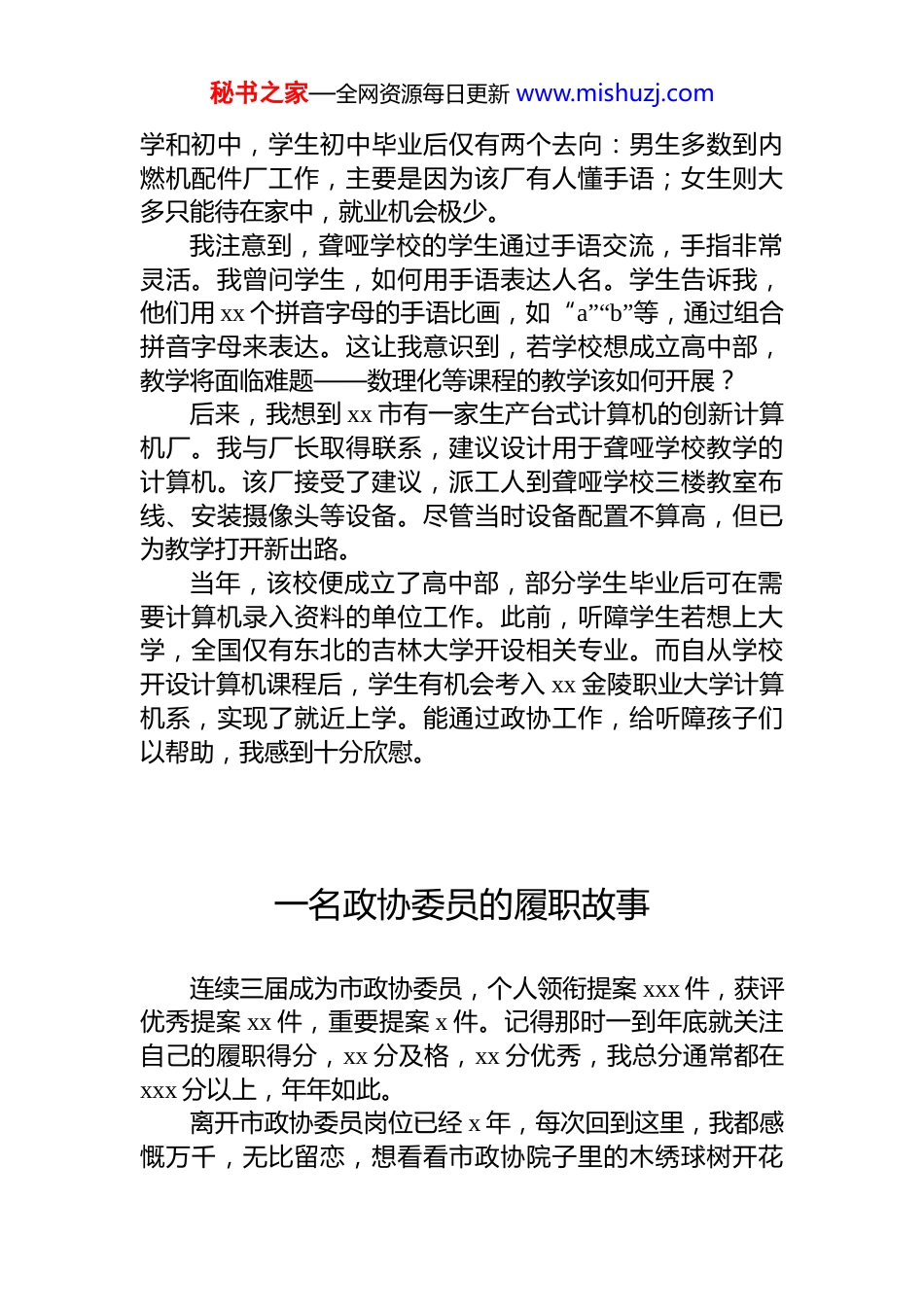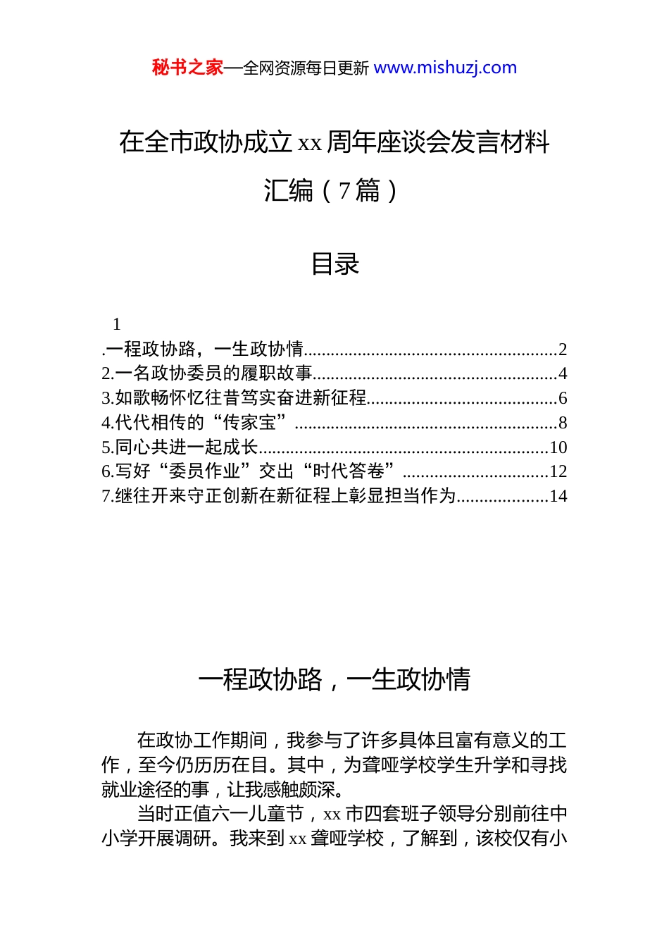 秘书之家—全网资源每日更新 www.mishuzj.com在全市政协成立 xx 周年座谈会发言材料汇编(7 篇)目录1.一程政协路,一生政协情........................................................22.一名政协委员的履职故事......................................................43.如歌畅怀忆往昔笃实奋进新征程..........................................64.代代相传的“传家宝”..........................................................85.同心共进一起成长................................................................106.写好“委员作业”交出“时代答卷”................................127.继往开来守正创新在新征程上彰显担当作为....................14一程政协路,一生政协情在政协工作期间,我参与了许多具体且富有意义的工作,至今仍历历在目。其中,为聋哑学校学生升学和寻找就业途径的事,让我感触颇深。当时正值六一儿童节,xx 市四套班子领导分别前往中小学开展调研。我来到 xx 聋哑学校,了解到,该校仅有小秘书之家—全网资源每日更新 www.mishuzj.com学和初中,学生初中毕业后仅有两个去向:男生多数到内燃机配件厂工作,主要是因为该厂有人懂手语;女生则大多只能待在家中,就业机会极少。我注意到,聋哑学校的学生通过手语交流,手指非常灵活。我曾问学生,如何用手语表达人名。学生告诉我,他们用 xx 个拼音字母的手语比画,如“a”“b”等,通过组合拼音字母来表达。这让我意识到,若学校想成立高中部,教学将面临难题——数理化等课程的教学该如何开展?后来,我想到 xx 市有一家生产台式计算机的创新计算机厂。我与厂长取得联系,建议设计用于聋哑学校教学的计算机。该厂接受了建议,派工人到聋哑学校三楼教室布线、安装摄像头等设备。尽管当时设备配置不算高,但已为教学打开新出路。当年,该校便成立了高中部,部分学生毕业后可在需要计算机录入资料的单位工作。此前,听障学生若想上大学,全国仅有东北的吉林大学开设相关专业。而自从学校开设计算机课程后,学生有机会考入 xx 金陵职业大学计算机系,实现了就近上学。能通过政协工作,给听障孩子们以帮助,我感到十分欣慰。一名政协委员的履职故事连续三届成为市政协委员,个人领衔提案 xxx 件,获评优秀提案 xx 件,重要提案 x 件。记得那时一到年底就关注自己的履职得分,xx 分及格,xx 分优秀,我总分通常都在xxx 分以上,年年如此。离开市政协委员岗位已经 x 年,每次回到这里,我都感慨万千,无比留恋,想看看市政协院子里的木绣球树开花秘书之家—全网资源每日更新 www.mishuzj.com了没有,看看议政堂里温暖的灯光下,委员们都在讨论什么议题。作为一名老委员,我最大的感悟是,委员履职要立足本职工作,筑牢建言根基。委员的建言献策要具备专业性准确性、可行性。因此学习要一以贯之,全面提高自身素质;调研要沉得住气,静得下心,全面掌握真实情况。撰写提案要秉持求真务实、精益求精的原则。在 xx 年的政协委员生涯中,有两封信让我印象深刻。一封信是 xxxx 年元月收到的。那天很冷,有三位陌生的老人来到医院(本人工作单位)找我,他们从媒体报道上看到我提交的“二次供水设施改造”政协提案,特意写了一封群众来信送给我。信中提到,他们居住的 xx 花园小区 xxx 多户居民因水箱老化,常年不能喝上干净的水,希望政协委员能关注到他们的困难。当天中午,我就去实地察看了小区供水情况,并主动加入小区二次改水的微信群和业主交流。经过深入调研,我很快撰写了两篇社情民意信息,呼吁相关部门关注。经过一年的努力,小区改水成功小区居民喝上了清洁水源。这个小区的居民后来写了一首藏头诗送给我,还说喝到干净水比在家门口扩建了八车道还畅快,感谢*,感谢政府,感谢政协。第二封信是 20xx 年底,当时我生病发烧在家休息,听见敲门,原来是收到一份快递,拆开一看,真的是意外惊喜,犹如一张病中良方。原来这是 xx 纪念馆写给我的感谢信,感谢我 xx 年前的一件政协提案。那是我 20xx 年写的提案,建议 xx 纪念馆扩建搬迁。提案中建议...