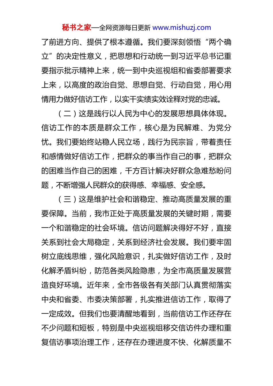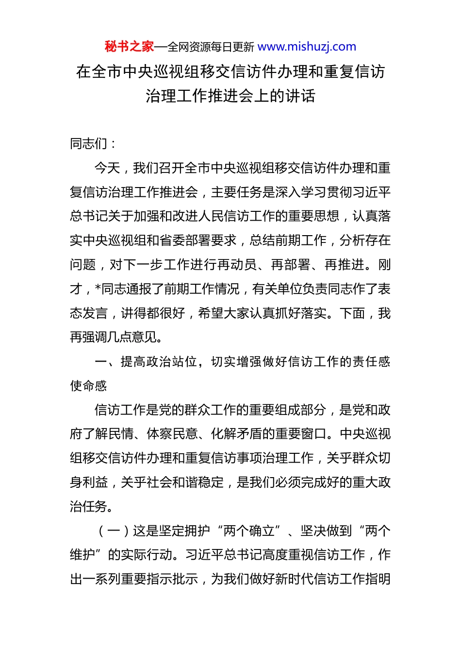 秘书之家—全网资源每日更新 www.mishuzj.com在全市中央巡视组移交信访件办理和重复信访治理工作推进会上的讲话 同志们:今天,我们召开全市中央巡视组移交信访件办理和重复信访治理工作推进会,主要任务是深入学习贯彻习近平总书记关于加强和改进人民信访工作的重要思想,认真落实中央巡视组和省委部署要求,总结前期工作,分析存在问题,对下一步工作进行再动员、再部署、再推进。刚才,*同志通报了前期工作情况,有关单位负责同志作了表态发言,讲得都很好,希望大家认真抓好落实。下面,我再强调几点意见。一、提高政治站位,切实增强做好信访工作的责任感使命感信访工作是党的群众工作的重要组成部分,是党和政府了解民情、体察民意、化解矛盾的重要窗口。中央巡视组移交信访件办理和重复信访事项治理工作,关乎群众切身利益,关乎社会和谐稳定,是我们必须完成好的重大政治任务。(一)这是坚定拥护“两个确立”、坚决做到“两个维护”的实际行动。习近平总书记高度重视信访工作,作出一系列重要指示批示,为我们做好新时代信访工作指明秘书之家—全网资源每日更新 www.mishuzj.com了前进方向、提供了根本遵循。我们要深刻领悟“两个确立”的决定性意义,把思想和行动统一到习近平总书记重要指示批示精神上来,统一到中央巡视组和省委部署要求上来,以高度的政治自觉、思想自觉、行动自觉,用心用情用力做好信访工作,以实干实绩实效诠释对党的忠诚。(二)这是践行以人民为中心的发展思想具体体现。信访工作的本质是群众工作,核心是为民解难、为党分忧。我们要始终站稳人民立场,践行为民宗旨,带着责任和感情做好信访工作,把群众的事当作自己的事,把群众的困难当作自己的困难,千方百计解决好群众急难愁盼问题,不断增强人民群众的获得感、幸福感、安全感。(三)这是维护社会和谐稳定、推动高质量发展的重要保障。当前,我市正处于高质量发展的关键时期,需要一个和谐稳定的社会环境。信访问题解决得好不好,直接关系到社会大局稳定,关系到经济社会发展。我们要牢固树立底线思维,强化风险意识,扎实做好信访工作,及时化解矛盾纠纷,防范各类风险隐患,为全市高质量发展营造良好环境。近年来,全市各级各有关部门认真贯彻落实中央和省委、市委决策部署,扎实推进信访工作,取得了一定成效。但我们也要清醒地看到,当前信访工作还存在不少问题和短板,特别是中央巡视组移交信访件办理和重复信访事项治理工作,还存在办理进度不快、化解质量不秘书之家—全网资源每日更新 www.mishuzj.com高、工作合力不强等问题。对此,我们要高度重视,采取有效措施,切实加以解决。二、坚持问题导向,全力推动信访事项高质高效解决做好中央巡视组移交信访件办理和重复信访事项治理工作,关键是要坚持问题导向,聚焦重点难点,采取有力措施,推动信访事项高质高效解决。(一)要在提高办理效率上下功夫。坚持效率与质量并重,按照“谁主管、谁负责”的原则,压实办理责任,明确办理时限,强化跟踪督办,确保信访件在规定时间内高质量办结。要坚持“一案一策”,因案施策,精准发力,对情况复杂、涉及面广的信访件,要加强协调联动,形成工作合力,加快办理进度。(二)要在提升化解质量上下功夫。突出群众满意标准,把解决群众合理诉求作为工作的出发点和落脚点,认真落实“四下基层”制度,常态化开展“走找想促”,深入基层、深入群众,面对面听取群众意见,心贴心做好群众工作,真正把问题解决在群众家门口。要坚持依法依规,运用法治思维和法治方式解决信访问题,做到事实清楚、证据确凿、定性准确、处理恰当,推动“事心双解”。(三)要在强化源头治理上下功夫。坚持和发展新时代“枫桥经验”,强化基层基础工作,充分发挥基层党组秘书之家—全网资源每日更新 www.mishuzj.com织和党员干部的作用,及时发现和化解矛盾纠纷,把问题解决在萌芽状态、化解在基层。要落实首办责任制,对初信初访事项,要第一时间受理、第一时间办理、第一时间反馈,做到件件有着落、事事有回音,防止初信初访转化为重复信访。(四)要在完善长效机制上下功夫。坚持标本兼治,统筹好“当下改”...