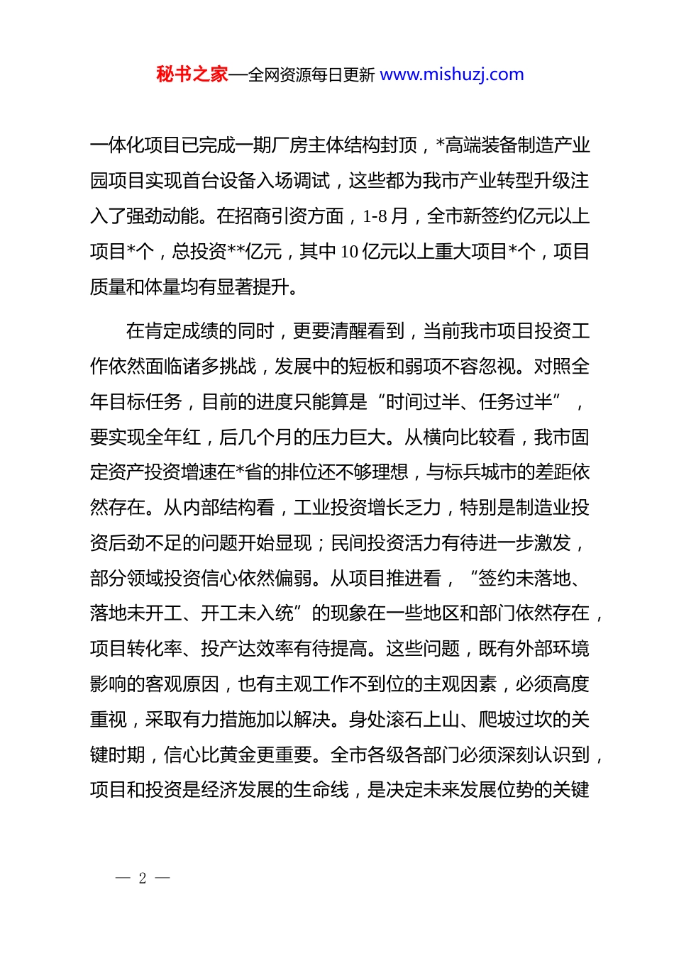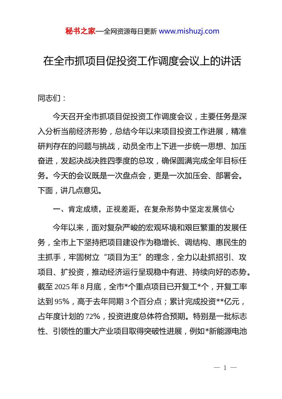 秘书之家—全网资源每日更新 www.mishuzj.com在全市抓项目促投资工作调度会议上的讲话同志们:今天召开全市抓项目促投资工作调度会议,主要任务是深入分析当前经济形势,总结今年以来项目投资工作进展,精准研判存在的问题与挑战,动员全市上下进一步统一思想、加压奋进,发起决战决胜四季度的总攻,确保圆满完成全年目标任务。今天的会议既是一次盘点会,更是一次加压会、部署会。下面,讲几点意见。一、肯定成绩,正视差距,在复杂形势中坚定发展信心今年以来,面对复杂严峻的宏观环境和艰巨繁重的发展任务,全市上下坚持把项目建设作为稳增长、调结构、惠民生的主抓手,牢固树立“项目为王”的理念,全力以赴抓招引、攻项目、扩投资,推动经济运行呈现稳中有进、持续向好的态势。截至 2025 年 8 月底,全市*个重点项目已开复工*个,开复工率达到 95%,高于去年同期 3 个百分点;累计完成投资**亿元,占年度计划的 72%,投资进度总体符合预期。特别是一批标志性、引领性的重大产业项目取得突破性进展,例如*新能源电池— 1 —秘书之家—全网资源每日更新 www.mishuzj.com一体化项目已完成一期厂房主体结构封顶,*高端装备制造产业园项目实现首台设备入场调试,这些都为我市产业转型升级注入了强劲动能。在招商引资方面,1-8 月,全市新签约亿元以上项目*个,总投资**亿元,其中 10 亿元以上重大项目*个,项目质量和体量均有显著提升。在肯定成绩的同时,更要清醒看到,当前我市项目投资工作依然面临诸多挑战,发展中的短板和弱项不容忽视。对照全年目标任务,目前的进度只能算是“时间过半、任务过半”,要实现全年红,后几个月的压力巨大。从横向比较看,我市固定资产投资增速在*省的排位还不够理想,与标兵城市的差距依然存在。从内部结构看,工业投资增长乏力,特别是制造业投资后劲不足的问题开始显现;民间投资活力有待进一步激发,部分领域投资信心依然偏弱。从项目推进看,“签约未落地、落地未开工、开工未入统”的现象在一些地区和部门依然存在,项目转化率、投产达效率有待提高。这些问题,既有外部环境影响的客观原因,也有主观工作不到位的主观因素,必须高度重视,采取有力措施加以解决。身处滚石上山、爬坡过坎的关键时期,信心比黄金更重要。全市各级各部门必须深刻认识到,项目和投资是经济发展的生命线,是决定未来发展位势的关键— 2 —秘书之家—全网资源每日更新 www.mishuzj.com变量。抓项目就是抓发展,谋投资就是谋未来。越是形势复杂,越要保持战略定力,把全部精力集中到抓项目、促投资上来,以项目建设的确定性有效应对外部环境的不确定性,牢牢掌握经济工作的主动权。二、直面问题精准施策在攻坚克难中破解发展瓶颈问题是时代的声音,也是工作的导向。只有敢于直面问题善于解决问题,才能推动工作不断向前。当前项目投资工作中存在的突出问题,主要体现在以下几个方面。第一,思想认识存在“温差”。部分单位和干部对抓项目促投资的极端重要性和紧迫性认识不足,存在一定的“温水煮青蛙”心态。有的认为宏观经济下行压力大,项目不好招、投资不好扩是普遍现象,产生了“等一等、看一看”的消极懈怠情绪。有的在项目谋划上视野不宽、研究不深,满足于现有的一亩三分地,缺乏“无中生有、有中生优”的创新思维和魄力,导致谋划生成的项目质量不高,缺乏吸引力。还有的在工作推进中,习惯于当“二传手”,满足于开会发文,缺乏深入一线、靠前指挥、一抓到底的拼劲和韧劲。这种思想上的温差,是导致工作力度层层递减、政策效能打折扣的根本原因。— 3 —秘书之家—全网资源每日更新 www.mishuzj.com第二,项目推进存在“落差”。项目从签约到落地、从开工到投产,环环相扣,一个环节卡壳,就会影响整个链条。当前,项目推进的“落差”现象较为突出。一是前期工作慢。部分项目签约后,迟迟无法完成规划选址、用地预审、环评安评等前期手续,一拖就是几个月甚至一两年,错失了最佳建设时机。究其原因,既有审批流程繁琐的问题,也有项目单位自身准备不充分、相关部门服务不到位的问题。二是建设进度慢。一些已经开工的项目,现场塔吊...