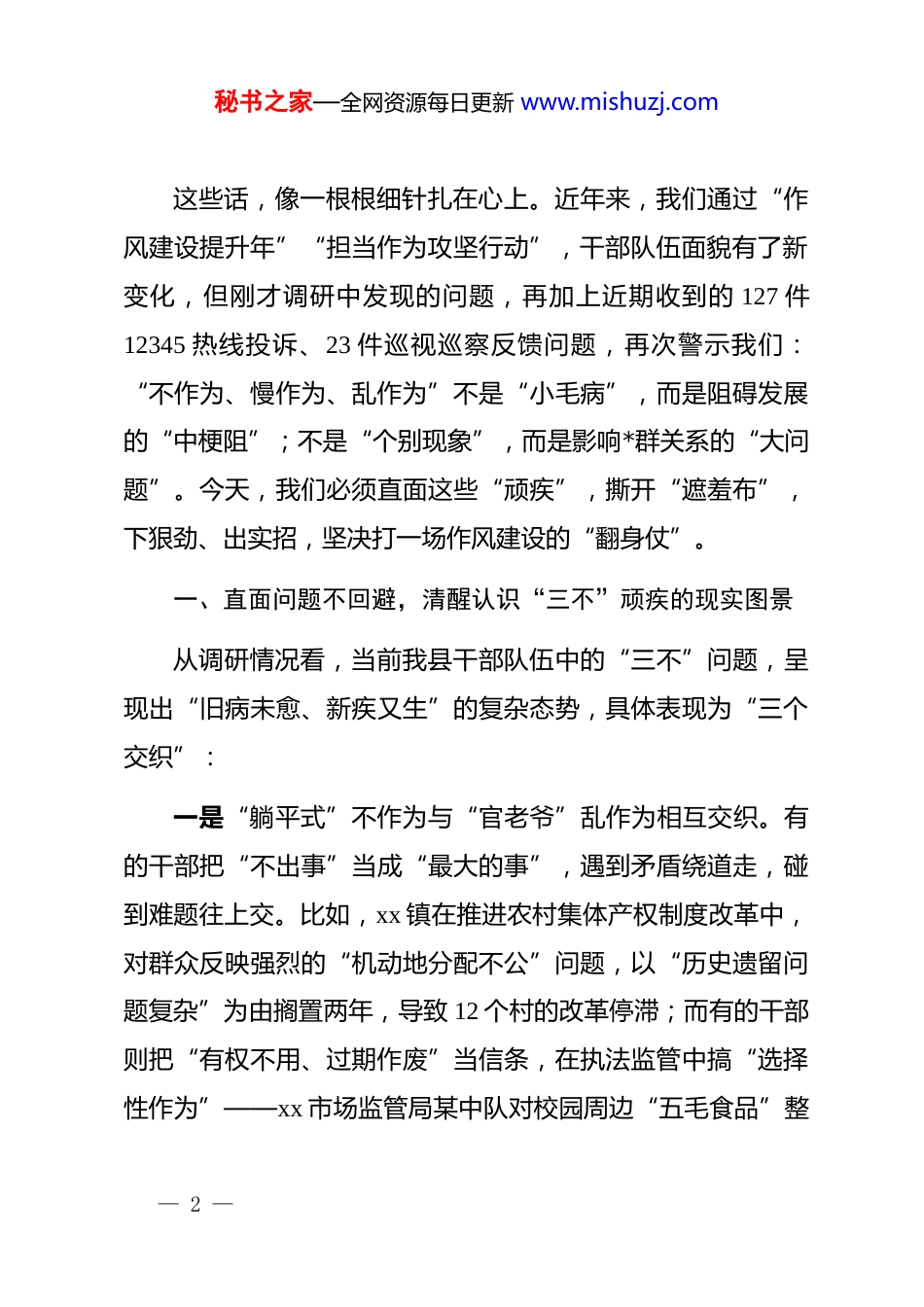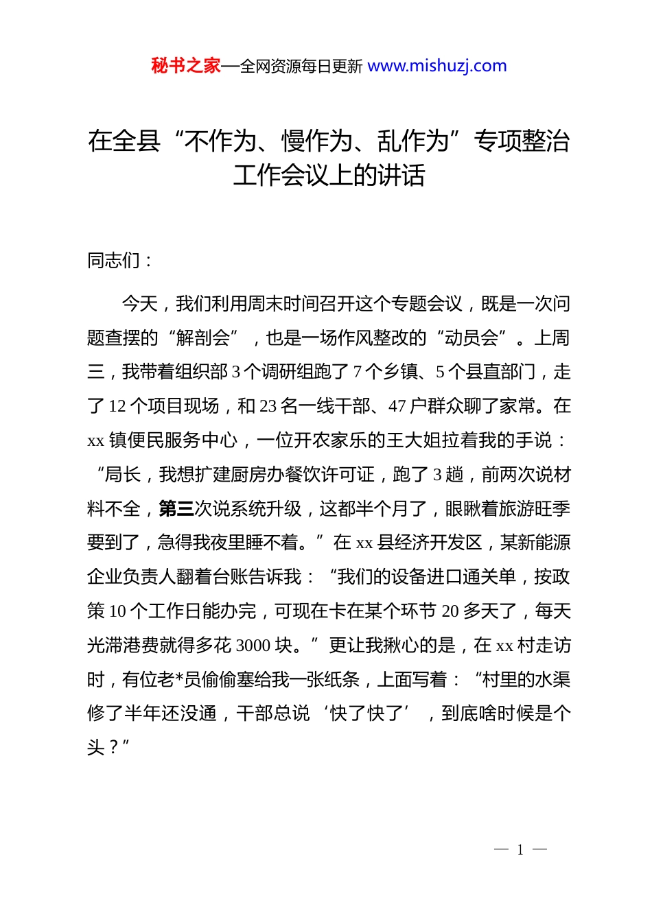 秘书之家—全网资源每日更新 www.mishuzj.com在全县“不作为、慢作为、乱作为”专项整治工作会议上的讲话同志们:今天,我们利用周末时间召开这个专题会议,既是一次问题查摆的“解剖会”,也是一场作风整改的“动员会”。上周三,我带着组织部 3 个调研组跑了 7 个乡镇、5 个县直部门,走了 12 个项目现场,和 23 名一线干部、47 户群众聊了家常。在xx 镇便民服务中心,一位开农家乐的王大姐拉着我的手说:“局长,我想扩建厨房办餐饮许可证,跑了 3 趟,前两次说材料不全,第三次说系统升级,这都半个月了,眼瞅着旅游旺季要到了,急得我夜里睡不着。”在 xx 县经济开发区,某新能源企业负责人翻着台账告诉我:“我们的设备进口通关单,按政策 10 个工作日能办完,可现在卡在某个环节 20 多天了,每天光滞港费就得多花 3000 块。”更让我揪心的是,在 xx 村走访时,有位老*员偷偷塞给我一张纸条,上面写着:“村里的水渠修了半年还没通,干部总说‘快了快了’,到底啥时候是个头?”— 1 —秘书之家—全网资源每日更新 www.mishuzj.com这些话,像一根根细针扎在心上。近年来,我们通过“作风建设提升年”“担当作为攻坚行动”,干部队伍面貌有了新变化,但刚才调研中发现的问题,再加上近期收到的 127 件12345 热线投诉、23 件巡视巡察反馈问题,再次警示我们:“不作为、慢作为、乱作为”不是“小毛病”,而是阻碍发展的“中梗阻”;不是“个别现象”,而是影响*群关系的“大问题”。今天,我们必须直面这些“顽疾”,撕开“遮羞布”,下狠劲、出实招,坚决打一场作风建设的“翻身仗”。一、直面问题不回避,清醒认识“三不”顽疾的现实图景从调研情况看,当前我县干部队伍中的“三不”问题,呈现出“旧病未愈、新疾又生”的复杂态势,具体表现为“三个交织”:一是“躺平式”不作为与“官老爷”乱作为相互交织。有的干部把“不出事”当成“最大的事”,遇到矛盾绕道走,碰到难题往上交。比如,xx 镇在推进农村集体产权制度改革中,对群众反映强烈的“机动地分配不公”问题,以“历史遗留问题复杂”为由搁置两年,导致 12 个村的改革停滞;而有的干部则把“有权不用、过期作废”当信条,在执法监管中搞“选择性作为”——xx 市场监管局某中队对校园周边“五毛食品”整— 2 —秘书之家—全网资源每日更新 www.mishuzj.com治,只查流动摊点不查固定门店,群众举报 3 次才突击检查,结果查处的 3 家门店里,有 2 家是队长的亲戚开的。二是“蜗牛式”慢作为与“机械式”乱作为相互交织。有的干部把“按程序办”当成“挡箭牌”,对急事难事“推拖绕”。比如,xx 县住建局办理某保障房项目施工许可,从立项到开工用了 14 个月,而同类项目在邻县仅需 6 个月,仔细一查,原来是工作人员把“施工图纸审核”环节重复了 3 次;还有的干部把“照抄照搬”当成“完成任务”,在制定惠民政策时,直接复制上级文件,不结合本地实际调整,导致 xx 镇的“种粮补贴”政策因“海拔高度限制”条款,让山区 3 个村的农户无法享受,群众意见很大。三是“变通式”乱作为与“人情式”不作为相互交织。有的干部把“灵活处理”变成“违规操作”,在项目审批、资金分配中搞“小圈子”。比如,xx 交通局在农村公路硬化项目中,未经公开招标就指定某企业施工,理由是“工期紧”,后来查实该企业法人是分管副局长的妻弟;而有的干部则把“熟人好办事”当成“工作方法”,对“有关系”的群众热情周到,对“没背景”的群众冷脸相对——xx 派出所户籍窗口,群众反映“中午下班时间不让办业务”“带齐材料还要跑三趟”,但熟— 3 —秘书之家—全网资源每日更新 www.mishuzj.com人介绍的“关系户”,10 分钟就能办完所有手续。这些问题,表面看是作风之弊,根子上是*性之痛。究其原因,主要有三个“没到位”:一是思想认识没到位,有的干部把“混日子”当成“职场哲学”,把“守摊子”当成“履职尽责”,缺乏“功成不必在我、功成必定有我”的担当;二是能力本领没到位,面对乡村振兴、社会治理、产业转型等新任务,有的干部还停留在“老办法不管用、...
