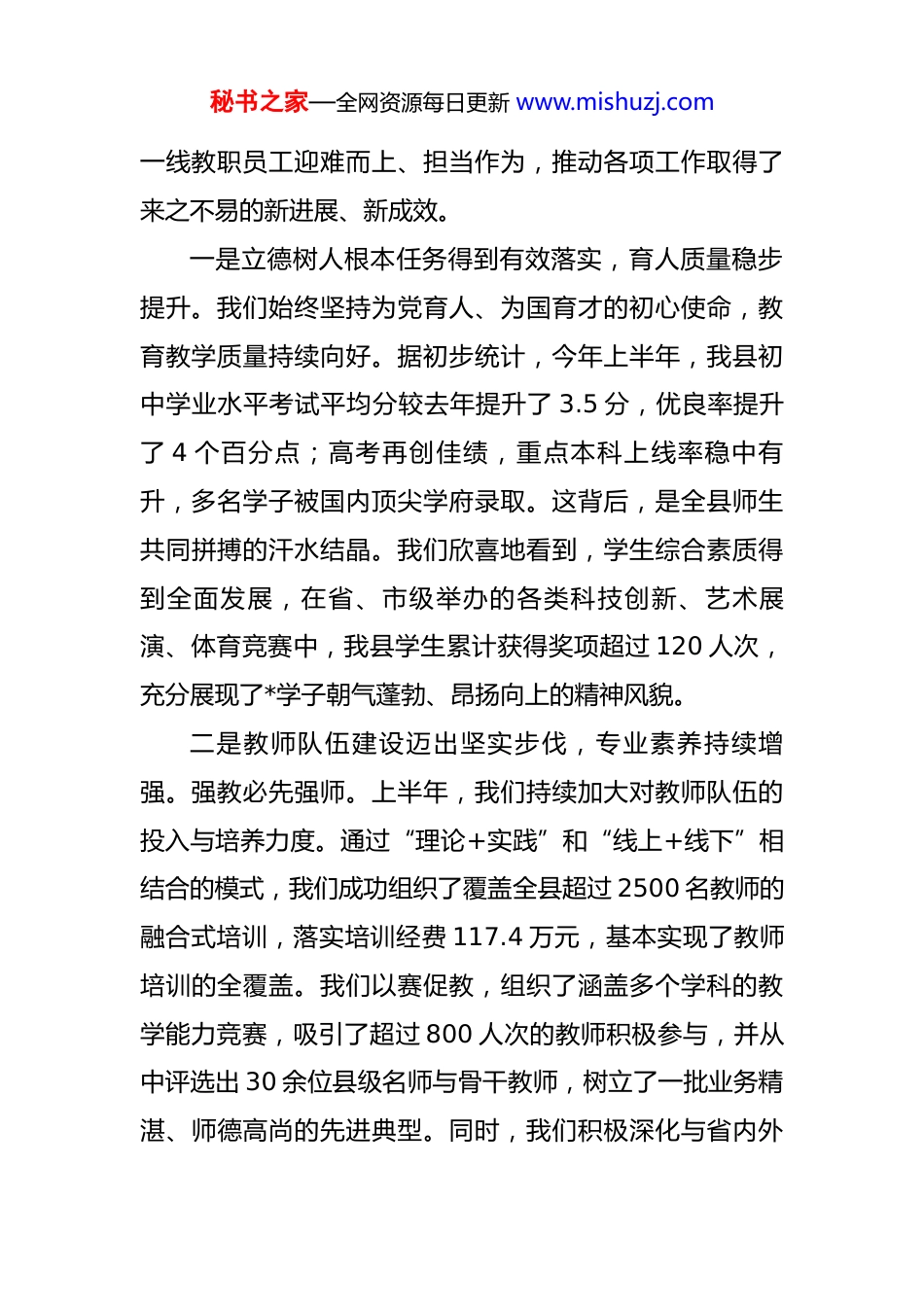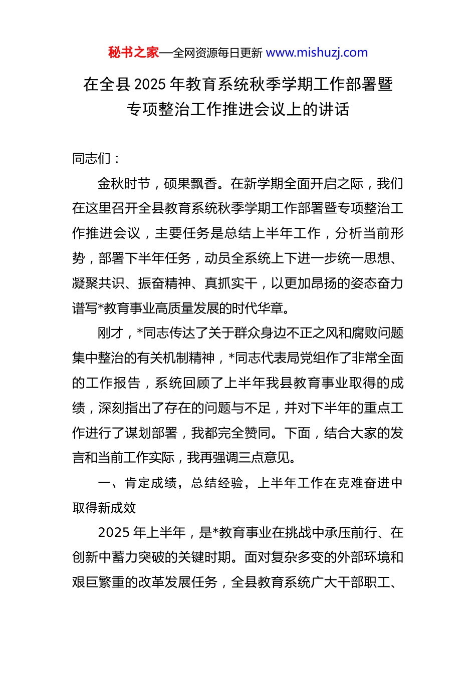 秘书之家—全网资源每日更新 www.mishuzj.com在全县 2025 年教育系统秋季学期工作部署暨专项整治工作推进会议上的讲话 同志们:金秋时节,硕果飘香。在新学期全面开启之际,我们在这里召开全县教育系统秋季学期工作部署暨专项整治工作推进会议,主要任务是总结上半年工作,分析当前形势,部署下半年任务,动员全系统上下进一步统一思想、凝聚共识、振奋精神、真抓实干,以更加昂扬的姿态奋力谱写*教育事业高质量发展的时代华章。刚才,*同志传达了关于群众身边不正之风和腐败问题集中整治的有关机制精神,*同志代表局党组作了非常全面的工作报告,系统回顾了上半年我县教育事业取得的成绩,深刻指出了存在的问题与不足,并对下半年的重点工作进行了谋划部署,我都完全赞同。下面,结合大家的发言和当前工作实际,我再强调三点意见。一、肯定成绩,总结经验,上半年工作在克难奋进中取得新成效2025 年上半年,是*教育事业在挑战中承压前行、在创新中蓄力突破的关键时期。面对复杂多变的外部环境和艰巨繁重的改革发展任务,全县教育系统广大干部职工、秘书之家—全网资源每日更新 www.mishuzj.com一线教职员工迎难而上、担当作为,推动各项工作取得了来之不易的新进展、新成效。一是立德树人根本任务得到有效落实,育人质量稳步提升。我们始终坚持为党育人、为国育才的初心使命,教育教学质量持续向好。据初步统计,今年上半年,我县初中学业水平考试平均分较去年提升了 3.5 分,优良率提升了 4 个百分点;高考再创佳绩,重点本科上线率稳中有升,多名学子被国内顶尖学府录取。这背后,是全县师生共同拼搏的汗水结晶。我们欣喜地看到,学生综合素质得到全面发展,在省、市级举办的各类科技创新、艺术展演、体育竞赛中,我县学生累计获得奖项超过 120 人次,充分展现了*学子朝气蓬勃、昂扬向上的精神风貌。二是教师队伍建设迈出坚实步伐,专业素养持续增强。强教必先强师。上半年,我们持续加大对教师队伍的投入与培养力度。通过“理论+实践”和“线上+线下”相结合的模式,我们成功组织了覆盖全县超过 2500 名教师的融合式培训,落实培训经费 117.4 万元,基本实现了教师培训的全覆盖。我们以赛促教,组织了涵盖多个学科的教学能力竞赛,吸引了超过 800 人次的教师积极参与,并从中评选出 30 余位县级名师与骨干教师,树立了一批业务精湛、师德高尚的先进典型。同时,我们积极深化与省内外秘书之家—全网资源每日更新 www.mishuzj.com高等院校的交流合作,挂牌成立了多个实习实训基地,为我县教育事业吸引和储备了一批优秀的后备人才,人才“蓄水池”功能日益凸显。三是教育改革创新呈现崭新气象,发展活力不断释放。我们坚持向改革要动力、向创新要活力。在思政课改革创新方面,部分学校进行了有益探索,例如,我了解到,*县实验中学成立了“思政先锋社团”,并建立了完善的思政教师准入与考评制度,有效激发了思政课的内生动力。在教育均衡发展方面,我们持续加大投入,上半年又有 3 所乡村学校的教学楼和食宿楼改扩建项目顺利竣工并投入使用,进一步缩小了城乡办学条件的差距。这些努力也得到了上级的认可,例如*县职业技术教育中心学校近期荣获的“中高职衔接贯通培养工作突出贡献奖”等荣誉,正是对我县教育系统锐意改革、追求卓越的最好肯定。这些成绩的取得,是县委、县政府坚强领导的结果,是社会各界关心支持的结果,更是全县三千多名教育工作者辛勤耕耘、无私奉献的结果。在此,我代表县政府,向在座的各位,并通过你们,向全县所有教育战线的同志们,致以最崇高的敬意和最诚挚的感谢!二、正视问题,保持清醒,深刻认识教育事业面临的新挑战秘书之家—全网资源每日更新 www.mishuzj.com在肯定成绩的同时,我们更要清醒地看到,对标新时代教育强国建设的宏伟目标,对照人民群众对“好教育”的殷切期盼,我县教育工作仍然存在一些不容忽视的短板和亟待解决的难题。第一,教育优质均衡发展的任务依然艰巨。城乡之间、校际之间的发展不平衡问题依然突出。一些城镇学校“大班额”现象尚未完全消除,而部分农村学校则面临生源萎缩、优质师资流失的困境...