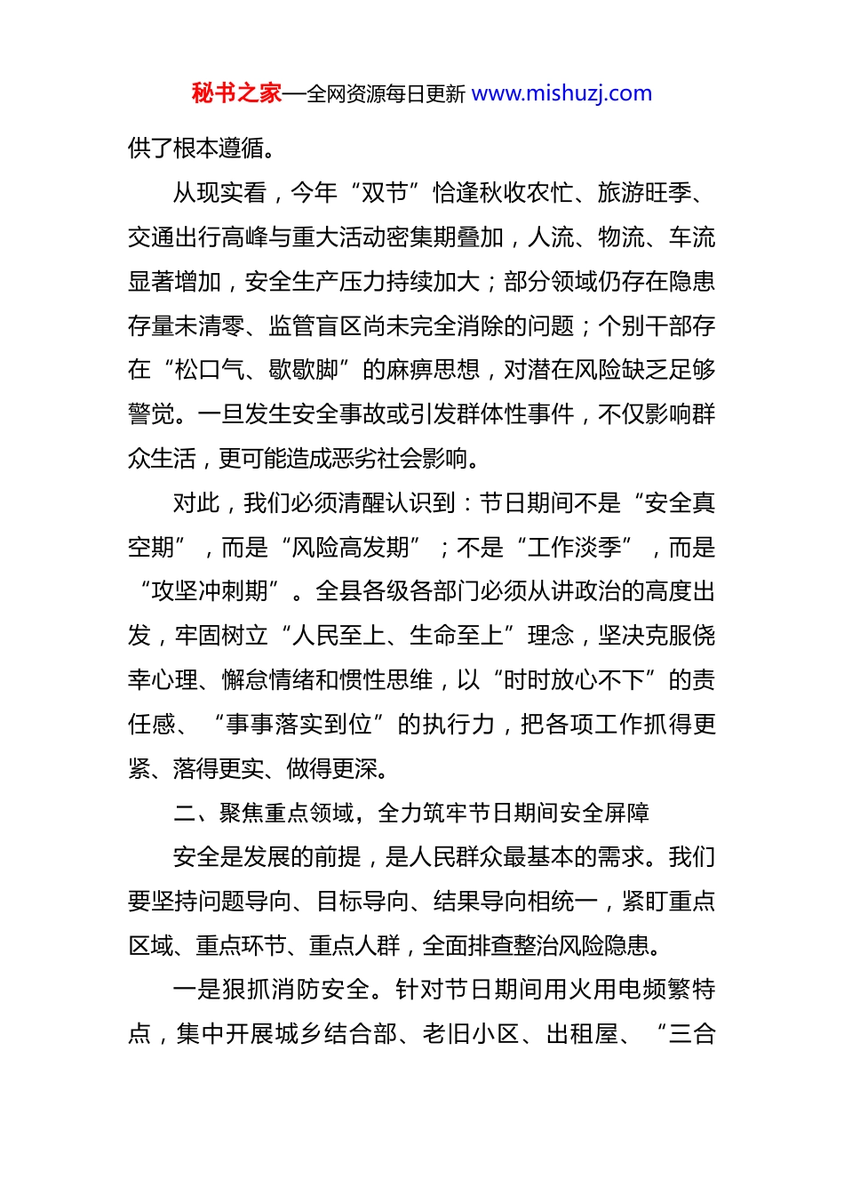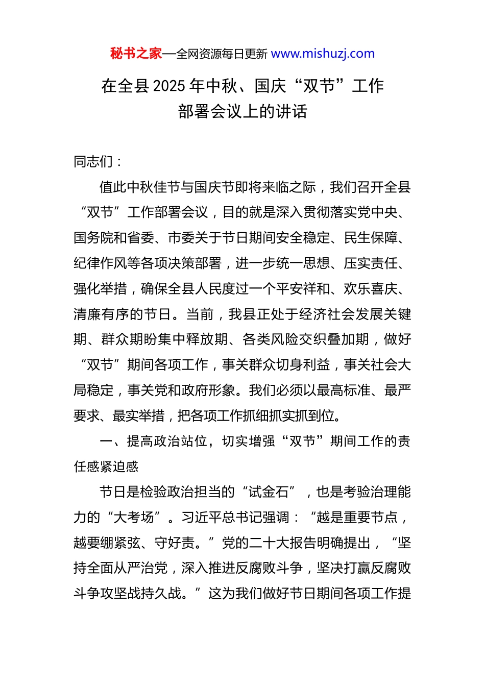 秘书之家—全网资源每日更新 www.mishuzj.com在全县 2025 年中秋、国庆“双节”工作部署会议上的讲话 同志们:值此中秋佳节与国庆节即将来临之际,我们召开全县“双节”工作部署会议,目的就是深入贯彻落实党中央、国务院和省委、市委关于节日期间安全稳定、民生保障、纪律作风等各项决策部署,进一步统一思想、压实责任、强化举措,确保全县人民度过一个平安祥和、欢乐喜庆、清廉有序的节日。当前,我县正处于经济社会发展关键期、群众期盼集中释放期、各类风险交织叠加期,做好“双节”期间各项工作,事关群众切身利益,事关社会大局稳定,事关党和政府形象。我们必须以最高标准、最严要求、最实举措,把各项工作抓细抓实抓到位。一、提高政治站位,切实增强“双节”期间工作的责任感紧迫感节日是检验政治担当的“试金石”,也是考验治理能力的“大考场”。习近平总书记强调:“越是重要节点,越要绷紧弦、守好责。”党的二十大报告明确提出,“坚持全面从严治党,深入推进反腐败斗争,坚决打赢反腐败斗争攻坚战持久战。”这为我们做好节日期间各项工作提秘书之家—全网资源每日更新 www.mishuzj.com供了根本遵循。从现实看,今年“双节”恰逢秋收农忙、旅游旺季、交通出行高峰与重大活动密集期叠加,人流、物流、车流显著增加,安全生产压力持续加大;部分领域仍存在隐患存量未清零、监管盲区尚未完全消除的问题;个别干部存在“松口气、歇歇脚”的麻痹思想,对潜在风险缺乏足够警觉。一旦发生安全事故或引发群体性事件,不仅影响群众生活,更可能造成恶劣社会影响。对此,我们必须清醒认识到:节日期间不是“安全真空期”,而是“风险高发期”;不是“工作淡季”,而是“攻坚冲刺期”。全县各级各部门必须从讲政治的高度出发,牢固树立“人民至上、生命至上”理念,坚决克服侥幸心理、懈怠情绪和惯性思维,以“时时放心不下”的责任感、“事事落实到位”的执行力,把各项工作抓得更紧、落得更实、做得更深。二、聚焦重点领域,全力筑牢节日期间安全屏障安全是发展的前提,是人民群众最基本的需求。我们要坚持问题导向、目标导向、结果导向相统一,紧盯重点区域、重点环节、重点人群,全面排查整治风险隐患。一是狠抓消防安全。针对节日期间用火用电频繁特点,集中开展城乡结合部、老旧小区、出租屋、“三合秘书之家—全网资源每日更新 www.mishuzj.com一”场所专项整治。重点检查消防设施是否完好有效、疏散通道是否畅通、电动自行车违规停放充电行为是否整治到位。住建、消防、公安等部门要联合行动,建立问题台账,实行销号管理。特别要加强敬老院、学校、医院、商场等人员密集场所的巡查频次,严防群死群伤事故。二是强化道路交通安全。交通运输部门要科学研判交通流量变化,合理调配警力资源,加强重点路段、重点时段执法管控。严厉打击超速超载、酒驾醉驾、疲劳驾驶、非法营运等违法行为。各乡镇要加强农村道路管理,落实“两站两员”职责,及时劝导纠正农用车载人、无证驾驶等危险行为。同时,要做好景区周边道路疏导预案,防止因游客激增引发拥堵或次生事故。三是深化建筑施工安全。住建部门要加大对在建工程的监督检查力度,严查深基坑、高支模、起重机械等危大工程专项方案执行情况。严禁盲目抢工期、赶进度,杜绝违规作业、违章指挥。对停工项目要加强现场巡查,防止因管理缺位导致意外发生。对于农村自建房,要严格落实审批备案制度,严控擅自加层、违规改建行为,确保结构安全。四是加强危化品及工贸企业安全。应急管理部门要组织对辖区内化工企业、加油站、液化气充装点等重点单位秘书之家—全网资源每日更新 www.mishuzj.com开展拉网式排查,督促企业落实安全管理制度,完善应急预案,加强值班值守。对涉及易燃易爆、有毒有害物质的企业,必须做到“人防、物防、技防”三到位。同时,要加强对粉尘涉爆、有限空间作业等高风险岗位的监管,严防中毒窒息、燃爆事故。五是保障食品药品与特种设备安全。市场监管部门要围绕节日消费热点,加大食品安全抽检频次,严查过期变质、假冒伪劣食品。加强对旅游景区餐饮服务单位的监督检查,严防群体性食物中毒事件。对...