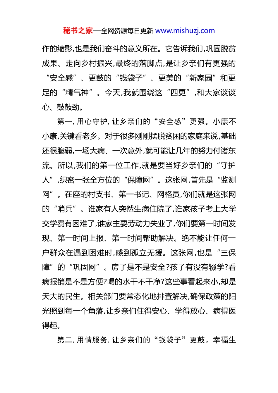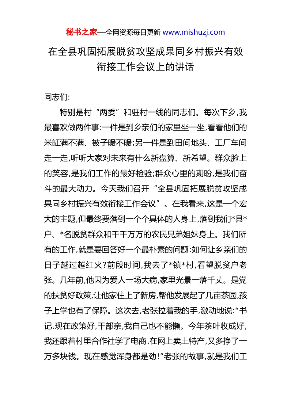 秘书之家—全网资源每日更新 www.mishuzj.com在全县巩固拓展脱贫攻坚成果同乡村振兴有效衔接工作会议上的讲话 同志们:特别是村“两委”和驻村一线的同志们。每次下乡,我最喜欢做两件事:一件是到乡亲们的家里坐一坐,看看他们的米缸满不满、被子暖不暖;另一件是到田间地头、工厂车间走一走,听听大家对未来有什么新盘算、新希望。群众脸上的笑容,是我们工作的最好检验;群众心里的期盼,是我们奋斗的最大动力。今天我们召开“全县巩固拓展脱贫攻坚成果同乡村振兴有效衔接工作会议”。在我看来,这是一个宏大的主题,但最终要落到一个个具体的人身上,落到我们*县*户、*名脱贫群众和千千万万的农民兄弟姐妹身上。我们所有的工作,就是要回答好一个最朴素的问题:如何让乡亲们的日子越过越红火?前段时间,我去了*镇*村,看望脱贫户老张。几年前,他因为爱人一场大病,家里光景一落千丈。是党的扶贫好政策,让他家住上了新房,帮他发展起了几亩茶园,孩子上学也有了保障。这次去,老张拉着我的手,激动地说:“书记,现在政策好,干部亲,我自己也不能懒。今年茶叶收成好,我还跟着村里合作社学了电商,在网上卖土特产,又多挣了一万多块钱。现在感觉浑身都是劲!”老张的故事,就是我们工秘书之家—全网资源每日更新 www.mishuzj.com作的缩影,也是我们奋斗的意义所在。它告诉我们,巩固脱贫成果、走向乡村振兴,最终的落脚点,是让乡亲们有更强的“安全感”、更鼓的“钱袋子”、更美的“新家园”和更足的“精气神”。今天,我就围绕这“四更”,和大家谈谈心、鼓鼓劲。第一,用心守护,让乡亲们的“安全感”更强。小康不小康,关键看老乡。对于很多刚刚摆脱贫困的家庭来说,基础还很脆弱,一场大病、一次意外,就可能让几年的努力付诸东流。所以,我们的第一位工作,就是要当好乡亲们的“守护人”,织密一张全方位的“保障网”。这张网,首先是“监测网”。在座的村支书、第一书记、网格员,你们就是这张网的“哨兵”。谁家有人突然生病住院了,谁家孩子考上大学交学费有困难了,谁家主要劳动力失业了,你们要第一时间发现、第一时间上报、第一时间帮助解决。绝不能让任何一户群众在遇到困难时,感到孤立无援。这张网,也是“三保障”的“巩固网”。房子是不是安全?孩子有没有辍学?看病报销是不是方便?喝的水干不干净?这些事看起来小,却是天大的民生。相关部门要常态化地排查解决,确保政策的阳光照到每一个角落,让乡亲们住得安心、学得放心、病得医得起。第二,用情服务,让乡亲们的“钱袋子”更鼓。幸福生秘书之家—全网资源每日更新 www.mishuzj.com活是奋斗出来的,但我们要为乡亲们的奋斗铺好路、搭好桥。让群众增收致富,是我们义不容辞的责任。要让产业更兴旺。我们县的茶叶、中药材是宝贝,要让这些宝贝变成乡亲们口袋里的真金白银。农业农村部门和各乡镇,不能只满足于把产业建起来,更要帮助乡亲们把产品卖出去、卖个好价钱。要多引进一些像*村那样的龙头企业,建一些农产品加工厂、冷链仓库,让合作社真正带动起千家万户。财政投下去的每一分钱,都要清清楚楚地算一笔“联农带农账”,确保大部分收益能落到农民手里。要让饭碗端得更稳。很多乡亲靠外出务工养家糊口,人社部门要当好“娘家人”,多组织一些“点对点”的劳务输出,多去外地看看我们的务工人员,帮他们解决困难、维护权益。对于留在村里的乡亲,要多想办法。村里的路要修了,河道要清了,能不能搞“以工代赈”,让大家在家门口挣钱?村里有手艺的妇女,能不能组织起来搞个手工作坊?办法总比困难多,关键看我们用不用心。第三,用力建设,让乡亲们的“新家园”更美。这些年,农村的路宽了,灯亮了,房子也漂亮了。但跟城里比,跟乡亲们的期盼比,还有差距。我们要像建设自己的家一样,把乡村建设得更美丽、更宜居。“厕所革命”、垃圾污水处理,这些事听起来不“高大上”,但直接关系到乡 C 亲们的生活品质。这件事,光靠干部干、政府投钱是长久不了的。要发动秘书之家—全网资源每日更新 www.mishuzj.com群众,把房前屋后打扫干净,评选“最美庭院”,用“积分超市”鼓励大家。当爱护环境成为每个人的自觉行动时,我们的乡村才能真正实现由内而外的美。还要多建一些让乡亲们能聚在一起、乐在一...
