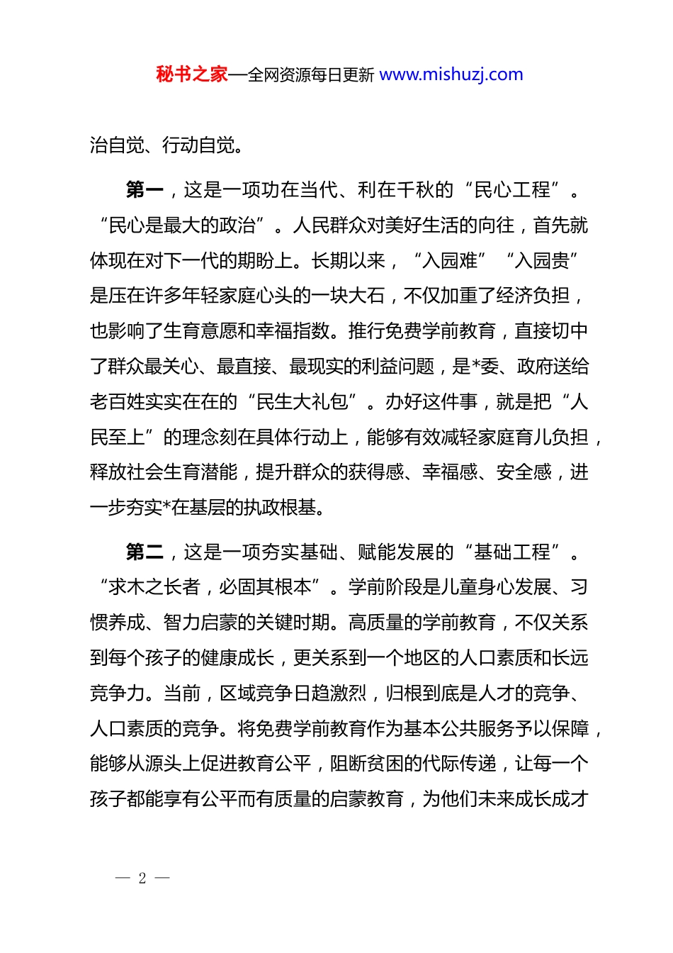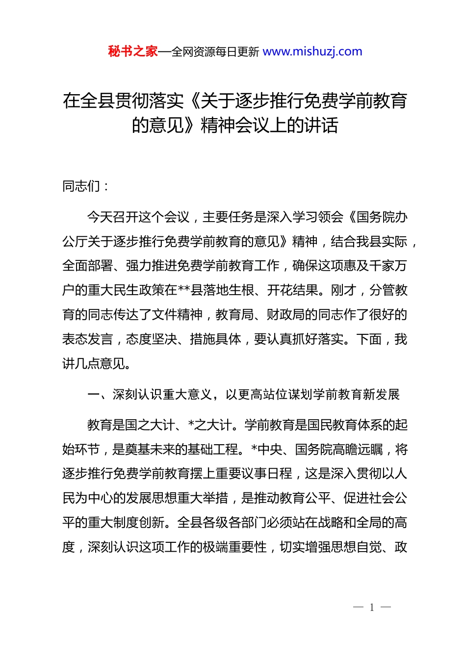秘书之家—全网资源每日更新 www.mishuzj.com在全县贯彻落实《关于逐步推行免费学前教育的意见》精神会议上的讲话同志们:今天召开这个会议,主要任务是深入学习领会《国务院办公厅关于逐步推行免费学前教育的意见》精神,结合我县实际,全面部署、强力推进免费学前教育工作,确保这项惠及千家万户的重大民生政策在**县落地生根、开花结果。刚才,分管教育的同志传达了文件精神,教育局、财政局的同志作了很好的表态发言,态度坚决、措施具体,要认真抓好落实。下面,我讲几点意见。一、深刻认识重大意义,以更高站位谋划学前教育新发展教育是国之大计、*之大计。学前教育是国民教育体系的起始环节,是奠基未来的基础工程。*中央、国务院高瞻远瞩,将逐步推行免费学前教育摆上重要议事日程,这是深入贯彻以人民为中心的发展思想重大举措,是推动教育公平、促进社会公平的重大制度创新。全县各级各部门必须站在战略和全局的高度,深刻认识这项工作的极端重要性,切实增强思想自觉、政— 1 —秘书之家—全网资源每日更新 www.mishuzj.com治自觉、行动自觉。第一,这是一项功在当代、利在千秋的“民心工程”。“民心是最大的政治”。人民群众对美好生活的向往,首先就体现在对下一代的期盼上。长期以来,“入园难”“入园贵”是压在许多年轻家庭心头的一块大石,不仅加重了经济负担,也影响了生育意愿和幸福指数。推行免费学前教育,直接切中了群众最关心、最直接、最现实的利益问题,是*委、政府送给老百姓实实在在的“民生大礼包”。办好这件事,就是把“人民至上”的理念刻在具体行动上,能够有效减轻家庭育儿负担,释放社会生育潜能,提升群众的获得感、幸福感、安全感,进一步夯实*在基层的执政根基。第二,这是一项夯实基础、赋能发展的“基础工程”。“求木之长者,必固其根本”。学前阶段是儿童身心发展、习惯养成、智力启蒙的关键时期。高质量的学前教育,不仅关系到每个孩子的健康成长,更关系到一个地区的人口素质和长远竞争力。当前,区域竞争日趋激烈,归根到底是人才的竞争、人口素质的竞争。将免费学前教育作为基本公共服务予以保障,能够从源头上促进教育公平,阻断贫困的代际传递,让每一个孩子都能享有公平而有质量的启蒙教育,为他们未来成长成才— 2 —秘书之家—全网资源每日更新 www.mishuzj.com打下坚实基础。这既是对**未来发展的人力资本投资,也是优化营商环境、吸引和留住人才的“强磁场”,必将为我县经济社会高质量发展注入源源不断的内生动力。第三,这是一项面向未来、决胜未来的“未来工程”。少年儿童是祖国的未来,是中华民族的希望。******反复强调,“要把下一代教育好、培养好,从请求讲政治的高度来认识”。今天的学前教育质量,决定着明天的人才质量;今天的幼苗,就是明天建设国家的栋梁。在**这片热土上,推动免费学前教育,就是要以对历史、对人民、对未来高度负责的态度,确保每一个**的孩子都能在人生的起跑线上获得平等的关爱和科学的引导。这不仅是在塑造单个的生命,更是在塑造**的未来。这项工作做得好不好,直接关系到我县能否培养出一代又一代德智体美劳全面发展的社会主义建设者和接班人,关系到县域发展的百年大计。二、科学研判当前形势,以更强自觉补齐学前教育短板近年来,县委、县政府始终坚持教育优先发展战略,持续加大投入,全县学前教育事业取得了长足进步。截至 2025 年上半年,全县学前三年毛入园率达到 93.5%,普惠性幼儿园覆盖率达到 88.7%,公办园在园幼儿占比达到 51.2%,基本形成了— 3 —秘书之家—全网资源每日更新 www.mishuzj.com广覆盖、保基本的学前教育公共服务体系。这些成绩的取得,是全县上下共同努力的结果,特别是广大教育工作者辛勤付出的结果,值得充分肯定。但同时,也要清醒地看到,对照人民群众的新期盼和高质量发展的新要求,我县学前教育发展不平衡不充分的问题依然突出,还存在不少亟待破解的短板和弱项。一是资源总量不足与结构失衡并存的矛盾依然突出。“一位难求”的现象在县城和中心镇依然存在,特别是优质公办园的学位更是“稀缺资源”。与此同时,部分乡镇、特别是偏远...