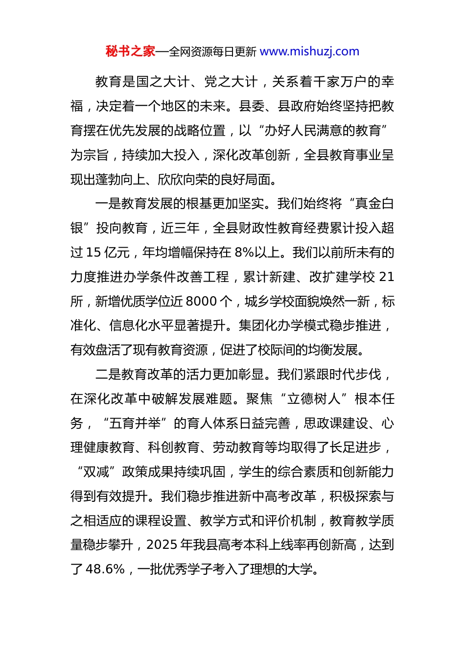 秘书之家—全网资源每日更新 www.mishuzj.com在全县教育工作暨第 41 个教师节庆祝大会上的讲话 同志们,老师们,朋友们:今天,我们怀着无比喜悦和崇敬的心情,隆重集会,共同庆祝第 41 个教师节,并对全县教育工作进行系统部署。在此,我谨代表县委、县政府,向辛勤耕耘在教育战线上的广大教师、教育工作者和离退休老教师,致以节日的祝贺和诚挚的问候!向长期以来关心、支持我县教育事业发展的社会各界人士,表示衷心的感谢!刚才,*深刻阐述了教育工作的极端重要性,全面总结了近年来我县教育事业取得的显著成就,并对未来一个时期如何办好人民满意的教育提出了明确要求和殷切期望。讲话站位高远、思想深刻、内涵丰富,为我们做好当前和今后一个时期的教育工作指明了前进方向、提供了根本遵循。全县上下要认真学习领会,坚决抓好贯彻落实。下面,根据会议安排,我再强调三点意见,主要是从政府层面,就如何把县委的决策部署转化为具体行动,谈一些想法和要求。一、肯定成绩,正视差距,在服务发展大局中进一步坚定教育优先的战略定力秘书之家—全网资源每日更新 www.mishuzj.com教育是国之大计、党之大计,关系着千家万户的幸福,决定着一个地区的未来。县委、县政府始终坚持把教育摆在优先发展的战略位置,以“办好人民满意的教育”为宗旨,持续加大投入,深化改革创新,全县教育事业呈现出蓬勃向上、欣欣向荣的良好局面。一是教育发展的根基更加坚实。我们始终将“真金白银”投向教育,近三年,全县财政性教育经费累计投入超过 15 亿元,年均增幅保持在 8%以上。我们以前所未有的力度推进办学条件改善工程,累计新建、改扩建学校 21所,新增优质学位近 8000 个,城乡学校面貌焕然一新,标准化、信息化水平显著提升。集团化办学模式稳步推进,有效盘活了现有教育资源,促进了校际间的均衡发展。二是教育改革的活力更加彰显。我们紧跟时代步伐,在深化改革中破解发展难题。聚焦“立德树人”根本任务,“五育并举”的育人体系日益完善,思政课建设、心理健康教育、科创教育、劳动教育等均取得了长足进步,“双减”政策成果持续巩固,学生的综合素质和创新能力得到有效提升。我们稳步推进新中高考改革,积极探索与之相适应的课程设置、教学方式和评价机制,教育教学质量稳步攀升,2025 年我县高考本科上线率再创新高,达到了 48.6%,一批优秀学子考入了理想的大学。秘书之家—全网资源每日更新 www.mishuzj.com三是教师队伍的形象更加闪亮。我们始终把教师作为教育发展的第一资源,大力实施强师兴教工程。教师的政治地位、社会地位、职业地位不断提高,教师平均工资收入水平增幅连续三年超过 10%,乡村教师生活补助标准稳步提升。我们建立健全了骨干教师培养体系,近三年共培养县级以上名师、学科带头人近 200 名。广大教师以德立身、以德立学、以德施教,涌现出一大批爱岗敬业、无私奉献的先进典型,赢得了全社会的广泛赞誉。在肯定成绩的同时,我们也要清醒地认识到,对标经济社会高质量发展的新要求,对标人民群众对“上好学”的新期盼,我县教育工作仍面临一些不容忽视的挑战。主要体现在:优质教育资源供给与人民群众日益增长的需求之间仍有差距,城乡、校际之间的发展还不均衡;教师队伍的整体素质和专业能力有待进一步提升,特别是结构性、区域性缺编问题依然存在;教育评价改革、“五唯”倾向破除等深层次改革任务依然艰巨;学生的全面发展,特别是心理健康和创新实践能力的培养,还需要我们投入更多的心力。对此,我们必须高度重视,以更大的决心、更实的举措,切实加以解决。二、聚焦关键,精准发力,在深化改革创新中奋力开创教育高质量发展新局面秘书之家—全网资源每日更新 www.mishuzj.com推动教育高质量发展,是一项系统工程,必须纲举目张,抓住关键。政府各部门和全县教育系统要紧紧围绕*书记提出的目标要求,聚焦重点领域和薄弱环节,以钉钉子精神推动各项任务落地见-效。第一,要以优化资源配置为基础,着力构建更加公平的教育体系。公平是教育的生命线。我们要把促进教育公平作为政府的基本职责,让每个孩子都能享有公平而有质量的教育...