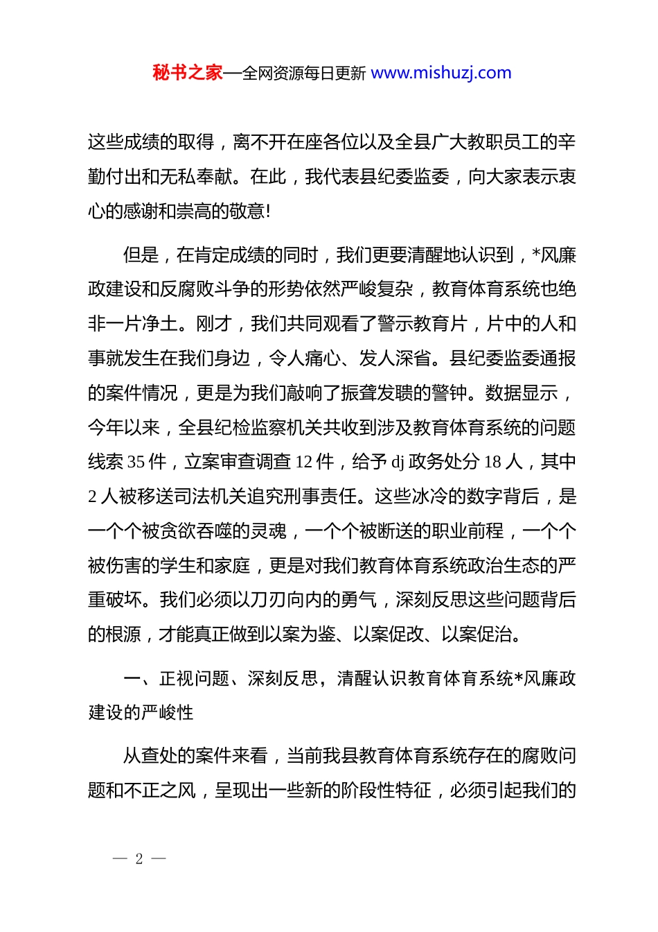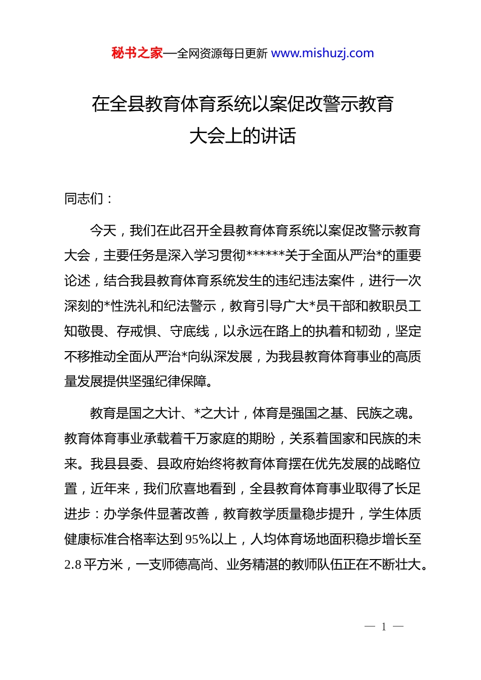 秘书之家—全网资源每日更新 www.mishuzj.com在全县教育体育系统以案促改警示教育大会上的讲话同志们:今天,我们在此召开全县教育体育系统以案促改警示教育大会,主要任务是深入学习贯彻******关于全面从严治*的重要论述,结合我县教育体育系统发生的违纪违法案件,进行一次深刻的*性洗礼和纪法警示,教育引导广大*员干部和教职员工知敬畏、存戒惧、守底线,以永远在路上的执着和韧劲,坚定不移推动全面从严治*向纵深发展,为我县教育体育事业的高质量发展提供坚强纪律保障。教育是国之大计、*之大计,体育是强国之基、民族之魂。教育体育事业承载着千万家庭的期盼,关系着国家和民族的未来。我县县委、县政府始终将教育体育摆在优先发展的战略位置,近年来,我们欣喜地看到,全县教育体育事业取得了长足进步:办学条件显著改善,教育教学质量稳步提升,学生体质健康标准合格率达到 95%以上,人均体育场地面积稳步增长至2.8 平方米,一支师德高尚、业务精湛的教师队伍正在不断壮大。— 1 —秘书之家—全网资源每日更新 www.mishuzj.com这些成绩的取得,离不开在座各位以及全县广大教职员工的辛勤付出和无私奉献。在此,我代表县纪委监委,向大家表示衷心的感谢和崇高的敬意!但是,在肯定成绩的同时,我们更要清醒地认识到,*风廉政建设和反腐败斗争的形势依然严峻复杂,教育体育系统也绝非一片净土。刚才,我们共同观看了警示教育片,片中的人和事就发生在我们身边,令人痛心、发人深省。县纪委监委通报的案件情况,更是为我们敲响了振聋发聩的警钟。数据显示,今年以来,全县纪检监察机关共收到涉及教育体育系统的问题线索 35 件,立案审查调查 12 件,给予 dj 政务处分 18 人,其中2 人被移送司法机关追究刑事责任。这些冰冷的数字背后,是一个个被贪欲吞噬的灵魂,一个个被断送的职业前程,一个个被伤害的学生和家庭,更是对我们教育体育系统政治生态的严重破坏。我们必须以刀刃向内的勇气,深刻反思这些问题背后的根源,才能真正做到以案为鉴、以案促改、以案促治。一、正视问题、深刻反思,清醒认识教育体育系统*风廉政建设的严峻性从查处的案件来看,当前我县教育体育系统存在的腐败问题和不正之风,呈现出一些新的阶段性特征,必须引起我们的— 2 —秘书之家—全网资源每日更新 www.mishuzj.com高度警惕。第一,重点岗位“权力寻租”现象突出,呈现“小官大贪”特征。教育体育系统虽然看似“清水衙门”,但一些关键岗位,如学校校长、后勤总务、财务管理、招生采购等负责人,手中掌握着项目建设、物资采购、资金分配、人事安排等权力。一些干部在“温水煮青蛙”式的围猎中,逐渐丧失底线,将公权力异化为谋取私利的工具。从查处的案件看,有的校长在学校食堂食材采购、教辅资料征订、校服定制等环节,利用职权便利,与供应商内外勾结,虚报价格、收受回扣,将本该用于改善学生伙食、提升教学质量的经费,装进了自己的腰包。这种行为直接侵害了学生的切身利益,性质极其恶劣。第二,重点领域“利益输送”链条隐蔽,呈现“靠山吃山”特征。校园工程建设、设备采购、食堂承包等领域,资金密集、资源集中,是腐败问题的高发区。一些不法分子想方设法“傍”上学校领导,通过各种手段拉拢腐蚀,形成“利益共同体”。有的案件中,学校负责人将学校的维修改造工程、信息化设备采购项目,违规指定给自己的“关系户”,项目质量堪忧,采购价格虚高,给国家和学校造成重大经济损失。这种“靠校吃校”的行为,不仅滋生了腐败,更在校园内埋下了严— 3 —秘书之家—全网资源每日更新 www.mishuzj.com重的安全隐患。第三,师德师风“失范失守”问题频发,呈现“由风及腐”特征。教师是立教之本、兴教之源。绝大多数教师能够坚守“为*育人、为国育才”的初心使命,但仍有少数人忘记了为人师表的身份。有的教师违规组织或参与有偿补课,加重学生和家庭负担;有的教师在招生、评优、分班等环节收受学生家长的礼品礼金,破坏教育公平;更有甚者,出现了体罚、变相体罚甚至侵害学生的恶性事件。这些行为看似是作风问题,但背后折射的是价值观的扭曲和纪法意识的淡漠,是...