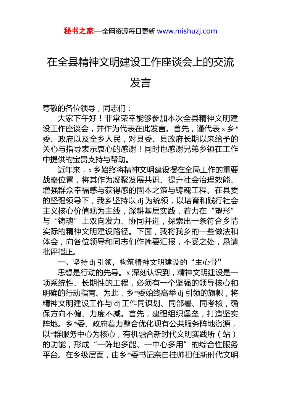 秘书之家—全网资源每日更新 www.mishuzj.com在全县精神文明建设工作座谈会上的交流发言尊敬的各位领导,同志们:大家下午好!非常荣幸能够参加本次全县精神文明建设工作座谈会,并作为代表在此发言。首先,谨代表 x 乡*委、政府以及全乡人民,对县委、县政府长期以来给予的关心与指导表示衷心的感谢!同时也感谢兄弟乡镇在工作中提供的宝贵支持与帮助。近年来,x 乡始终将精神文明建设摆在全局工作的重要战略位置,将其作为凝聚发展共识、提升社会治理效能、增强群众幸福感与获得感的固本之策与铸魂工程。在县委的坚强领导下,我乡坚持以 dj 为统领,以培育和践行社会主义核心价值观为主线,深耕基层实践,着力在“塑形”与“铸魂”上双向发力、协同并进,探索出一条符合乡情实际的精神文明建设路径。下面,我将我乡的一些做法和体会,向各位领导和同志们作简要汇报,不妥之处,恳请批评指正。一、坚持 dj 引领,构筑精神文明建设的“主心骨”思想是行动的先导。x 深刻认识到,精神文明建设是一项系统性、长期性的工程,必须有一个坚强的领导核心和明确的行动指南。为此,乡*委始终高举 dj 引领的旗帜,将精神文明建设工作与 dj 工作同谋划、同部署、同考核,确保方向不偏、力度不减。首先,建强组织堡垒,打造坚实阵地。乡*委、政府着力整合优化现有公共服务阵地资源,以*群服务中心为核心,有机融合新时代文明实践所(站)的功能,形成“一阵地多能、一中心多用”的综合性服务平台。在乡级层面,由乡*委书记亲自挂帅担任新时代文明秘书之家—全网资源每日更新 www.mishuzj.com实践所所长,统筹全乡文明实践活动;在村级层面,依托各村*群服务中心,规范建设新时代文明实践站,并纵向整合“草原书屋”、农家书屋、文化广场等资源,构建起横向到边、纵向到底的“15 分钟文明实践服务圈”,打通宣传群众、教育群众、关心群众、服务群众的“最后一公里”。其次,激活“头雁”效应,锻造过硬队伍。精神文明建设,关键在人。乡*委充分发挥*员干部的先锋模范作用,将精神文明建设成效纳入*员干部年度考核和评优评先的重要内容。通过“三会一课”、主题*日等形式,组织*员干部带头学习*的创新理论,带头参与志愿服务,带头践行文明新风。全乡 473 名*员均建立了联系户,既是政策宣传员,也是民情信息员、文明示范员。在他们的带动下,群众的主人翁意识被有效激发,一支由*员、退休干部、乡贤、致富能手、青年志愿者组成的文明实践志愿服务队日益壮大,成为推动乡风文明建设不可或缺的中坚力量。二、聚焦环境塑形,绘就宜居和美乡村的“新画卷”乡村之美,始于颜值。优美的人居环境是精神文明最直观的体现,也是提升群众生活品质的内在要求。x 乡将农村人居环境整治作为精神文明建设的突破口和着力点,持续发力,久久为功。一是系统治理,重塑乡村面貌。乡*委、政府以“两清两改两治理”工作为抓手制定了详尽的整治规划。截至2025 年 8 月,全乡累计整治人居环境点位超过 2000 处,集中拆除了影响村容村貌的残垣断壁 3.2 万平方米。在基础设施建设方面,投入资金建成了 5 座标准化农村污水处理设施,确保了农村生活垃圾收运体系覆盖所有行政村,使污水收集处理率达到了 80%以上。同时,稳步推进农村“厕所革命”,累计实施卫生厕所改造 915 户。通过一系列标本兼治的措施,道路街巷干净整洁,庭院内外清爽有序,昔日的“脏乱差”正在向“洁净美”转变。二是全民参与,构筑共建格局。乡*委、政府深知,环境整治不能仅靠政府“独秘书之家—全网资源每日更新 www.mishuzj.com唱”,必须发动群众“合唱”。为此,建立了“县级统筹乡为主抓、村为落实”的三级责任体系并创新性地推行了“镇、村、片”三级网格化管理责任机制将责任明确到人任务细化到片。通过“小手拉大手”“美丽庭院”创建等活动激发群众的参与热情。特别是发挥*员的带头作用,全乡 473 名*员累计开展义务劳动超过 900 次,直接带动了超过 4300 人次的群众自发参与到房前屋后的环境整治中来。这种“干部干、群众看”到“干群一起干”的转变,为人居环境的持续改善注入了源源不断的内生...