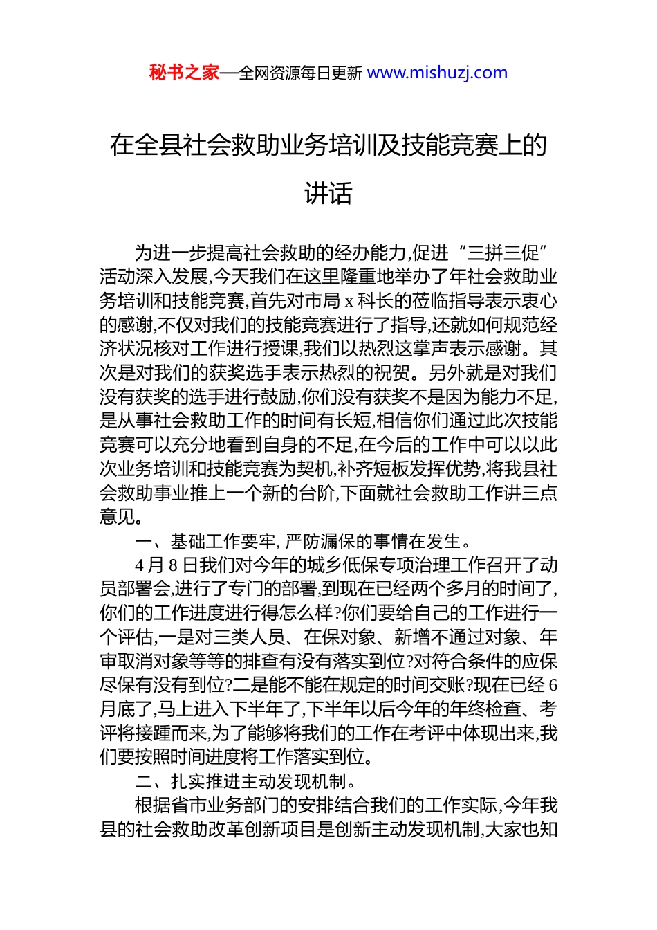 秘书之家—全网资源每日更新 www.mishuzj.com在全县社会救助业务培训及技能竞赛上的讲话为进一步提高社会救助的经办能力,促进“三拼三促”活动深入发展,今天我们在这里隆重地举办了年社会救助业务培训和技能竞赛,首先对市局 x 科长的莅临指导表示衷心的感谢,不仅对我们的技能竞赛进行了指导,还就如何规范经济状况核对工作进行授课,我们以热烈这掌声表示感谢。其次是对我们的获奖选手表示热烈的祝贺。另外就是对我们没有获奖的选手进行鼓励,你们没有获奖不是因为能力不足,是从事社会救助工作的时间有长短,相信你们通过此次技能竞赛可以充分地看到自身的不足,在今后的工作中可以以此次业务培训和技能竞赛为契机,补齐短板发挥优势,将我县社会救助事业推上一个新的台阶,下面就社会救助工作讲三点意见。一、基础工作要牢,严防漏保的事情在发生。4 月 8 日我们对今年的城乡低保专项治理工作召开了动员部署会,进行了专门的部署,到现在已经两个多月的时间了,你们的工作进度进行得怎么样?你们要给自己的工作进行一个评估,一是对三类人员、在保对象、新增不通过对象、年审取消对象等等的排查有没有落实到位?对符合条件的应保尽保有没有到位?二是能不能在规定的时间交账?现在已经 6月底了,马上进入下半年了,下半年以后今年的年终检查、考评将接踵而来,为了能够将我们的工作在考评中体现出来,我们要按照时间进度将工作落实到位。二、扎实推进主动发现机制。根据省市业务部门的安排结合我们的工作实际,今年我县的社会救助改革创新项目是创新主动发现机制,大家也知秘书之家—全网资源每日更新 www.mishuzj.com道我们率先在全省创造性的与水滴公司进行了合作,水滴公司无偿为我们提供户籍在全国各地的申请水滴筹的对象,为我们主动发现奠定了坚实的基础,那么当有这样的对象反馈回来以后,要请你们认真的核实,及时将符合条件地纳入保障范畴。三、有序推进城镇解困脱困工作城镇解困脱困工作在大家的共同努力下,我们去年进入了全省的先进行列,这和大家的努力是分不开的,但我们绝不能骄傲自满,俗话说打江山容易守江山难,不能去年拿了优秀今年就垫底了,我们基数小,工作量不大,要请大家在现行的政策条件下,用好用足政策,让困难群众有更多的依靠和温暖。一是要及时将符合条件的新增低保、特困等符合条件的对象纳入保障范畴。二是要持续落实结对帮扶,城镇解困脱困民政是责任主体,你们要督促、落实好帮扶干部进行每个月不少于一次的入户帮扶。三是随着工作人员的调整,对帮扶干部也要同步调整到位,前段时间因疫情我们也专题部署了结对帮扶工作,且对全县的情况进行来抽查,情况不是很乐观,帮扶干部工作调整以后没有及时安排新的帮扶干部进行补充帮扶,高桥一个帮扶干部都没有,这就是我们工作失职。所以这块工作不能松,要有序地推进。最后,我代表局*委感谢各位基层民政工作者多年的辛苦付出,祝大家工作顺利、家庭幸福!谢谢大家!