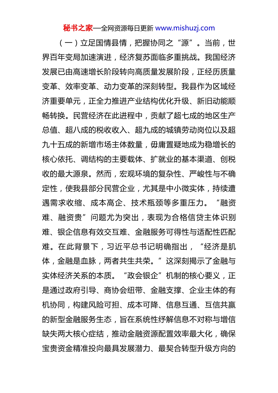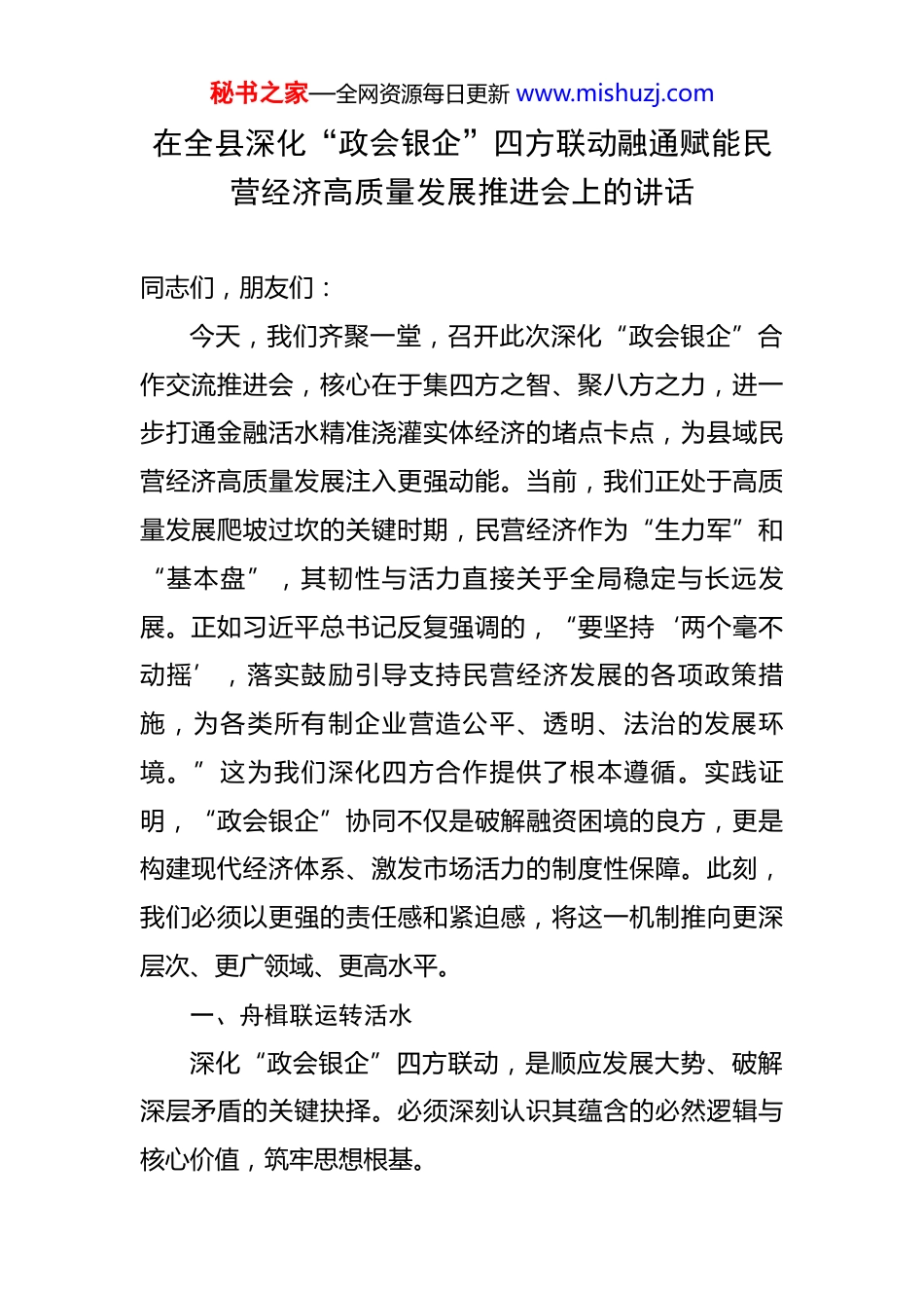 秘书之家—全网资源每日更新 www.mishuzj.com在全县深化“政会银企”四方联动融通赋能民营经济高质量发展推进会上的讲话 同志们,朋友们:今天,我们齐聚一堂,召开此次深化“政会银企”合作交流推进会,核心在于集四方之智、聚八方之力,进一步打通金融活水精准浇灌实体经济的堵点卡点,为县域民营经济高质量发展注入更强动能。当前,我们正处于高质量发展爬坡过坎的关键时期,民营经济作为“生力军”和“基本盘”,其韧性与活力直接关乎全局稳定与长远发展。正如习近平总书记反复强调的,“要坚持‘两个毫不动摇’,落实鼓励引导支持民营经济发展的各项政策措施,为各类所有制企业营造公平、透明、法治的发展环境。”这为我们深化四方合作提供了根本遵循。实践证明,“政会银企”协同不仅是破解融资困境的良方,更是构建现代经济体系、激发市场活力的制度性保障。此刻,我们必须以更强的责任感和紧迫感,将这一机制推向更深层次、更广领域、更高水平。一、舟楫联运转活水深化“政会银企”四方联动,是顺应发展大势、破解深层矛盾的关键抉择。必须深刻认识其蕴含的必然逻辑与核心价值,筑牢思想根基。秘书之家—全网资源每日更新 www.mishuzj.com(一)立足国情县情,把握协同之“源”。当前,世界百年变局加速演进,经济复苏面临多重挑战。我国经济发展已由高速增长阶段转向高质量发展阶段,正经历质量变革、效率变革、动力变革的深刻转型。我县作为区域经济重要单元,正全力推进产业结构优化升级、新旧动能顺畅转换。民营经济在此进程中,贡献了超七成的地区生产总值、超八成的税收收入、超九成的城镇劳动岗位以及超九十五成的新增市场主体数量,毋庸置疑地成为稳增长的核心依托、调结构的主要载体、扩就业的基本渠道、创税收的最大源泉。然而,宏观环境的复杂性、严峻性与不确定性,使我县部分民营企业,尤其是中小微实体,持续遭遇需求收缩、成本高企、技术瓶颈等多重压力。“融资难、融资贵”问题尤为突出,表现为合格信贷主体识别难、银企信息有效交互难、金融服务可得性与适配性匹配难。在此背景下,习近平总书记明确指出,“经济是肌体,金融是血脉,两者共生共荣。”这深刻揭示了金融与实体经济关系的本质。“政会银企”机制的核心要义,正是通过政府引导、商协会纽带、金融支撑、企业主体的有机协同,构建风险可担、成本可降、信息互通、互信共赢的新型金融服务生态,旨在系统性纾解信息不对称与增信缺失两大核心症结,推动金融资源配置效率最大化,确保宝贵资金精准投向最具发展潜力、最契合转型升级方向的秘书之家—全网资源每日更新 www.mishuzj.com实体领域。(二)明晰角色定位,厘清协同之“道”。四方联动绝非权宜之计的联谊活动,而是具有深厚制度内核的系统工程。其高效运转,依赖于各方职责的精准定位与协同效应的最大化释放。政府应担当“引导者”与“守护者”。核心在于优化顶层设计,构建公平稳定可预期的制度环境。要着力完善政策供给体系,强化财税奖补、风险补偿等政策的精准性与协同性;加快信用信息基础设施建设步伐,整合市场监管、税收缴纳、社会保障、公共事业缴费等多维数据,构建统一权威、动态更新的企业信用信息图谱,为金融机构精准“画像”、科学授信奠定数据基石;同时,应探索建立常态化的政府性资源(如财政存款)与金融机构支持实体经济绩效联动机制,引导金融活水更多流向民营小微领域。商协会应成为“粘合剂”与“传感器”。充分发挥扎根企业、贴近一线的天然优势。一要深度畅通诉求表达渠道,常态化开展行业性、区域化融资需求摸排,形成动态化、清单化需求数据库,实现从“被动响应”到“主动服务”的根本转变;二要高效传递政策信息,精准解读各级惠企政策与金融产品创新要点,缩短政策传导时滞,降低企业“认知成本”;三要积极推动行业自律与信用建设,倡导契约精神,协助开展信用评估初审,构建良好的区域金融生态氛围。金融机构应践行“供秘书之家—全网资源每日更新 www.mishuzj.com给者”与“伙伴”使命。深刻认识服务实体经济是其安身立命之本。关键在于破解“惧贷、慎贷、惜贷”思维,建立敢贷、愿贷的长效机制。要构...