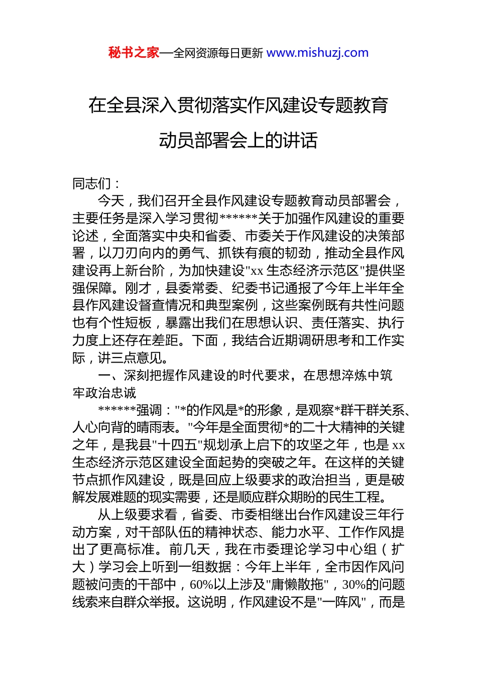 秘书之家—全网资源每日更新 www.mishuzj.com在全县深入贯彻落实作风建设专题教育动员部署会上的讲话 同志们:今天,我们召开全县作风建设专题教育动员部署会,主要任务是深入学习贯彻******关于加强作风建设的重要论述,全面落实中央和省委、市委关于作风建设的决策部署,以刀刃向内的勇气、抓铁有痕的韧劲,推动全县作风建设再上新台阶,为加快建设"xx 生态经济示范区"提供坚强保障。刚才,县委常委、纪委书记通报了今年上半年全县作风建设督查情况和典型案例,这些案例既有共性问题也有个性短板,暴露出我们在思想认识、责任落实、执行力度上还存在差距。下面,我结合近期调研思考和工作实际,讲三点意见。一、深刻把握作风建设的时代要求,在思想淬炼中筑牢政治忠诚******强调:"*的作风是*的形象,是观察*群干群关系、人心向背的晴雨表。"今年是全面贯彻*的二十大精神的关键之年,是我县"十四五"规划承上启下的攻坚之年,也是 xx生态经济示范区建设全面起势的突破之年。在这样的关键节点抓作风建设,既是回应上级要求的政治担当,更是破解发展难题的现实需要,还是顺应群众期盼的民生工程。从上级要求看,省委、市委相继出台作风建设三年行动方案,对干部队伍的精神状态、能力水平、工作作风提出了更高标准。前几天,我在市委理论学习中心组(扩大)学习会上听到一组数据:今年上半年,全市因作风问题被问责的干部中,60%以上涉及"庸懒散拖",30%的问题线索来自群众举报。这说明,作风建设不是"一阵风",而是秘书之家—全网资源每日更新 www.mishuzj.com需要常抓不懈的"持久战"。从发展需求看,我们正在推进的 xx 生态经济示范区建设,涉及产业转型、生态保护、城乡融合等 23 项重点任务,每一项都需要干部以"闯"的精神、"创"的劲头、"干"的作风去落实。但近期调研发现,有的干部面对新任务存在"本领恐慌":在招商引资中,习惯用老办法跑关系,对产业链招商、以商招商等新机制研究不深;在项目推进中,遇到土地指标、环评审批等难题就"绕道走",导致 xx 新能源项目落地周期比预期延长 2 个月;在基层治理中,对群众反映的"停车难""买菜远"等问题,存在"等上级文件""靠财政拨款"的依赖心理。这些问题如果不及时解决,不仅会影响项目进度,更会寒了群众的心。从群众期盼看,我们开展"我为群众办实事"实践活动两年多来,累计解决民生问题 1200 余件,群众满意度从 89%提升到 93%。但仍有群众通过"12345"热线反映:个别窗口单位"门好进、脸好看、事难办",办理准生证需要重复提交5 份材料;有的村(社区)干部下村"打卡式"走访,笔记本上记满了"走访记录",却没有解决 1 户危房改造问题;还有企业主反映,个别部门"选择性执法",对小微企业检查频次高,对大型企业却"睁一只眼闭一只眼"。这些"微腐败""软阻力",啃食的是群众的获得感,挥霍的是基层*组织的公信力。同志们,作风建设的核心是密切*同人民群众的血肉联系。我们坐在办公室里看报表、听汇报,不如到田间地头问需求、到车间码头解难题;开再多的会、发再多的文,不如把群众的"急难愁盼"清单变成"幸福账单"。希望大家始终牢记:我们是"答卷人",群众是"阅卷人",作风建设的成效最终要由群众来评判。二、聚焦四风顽疾精准发力,在动真碰硬中强化正风肃纪经过近年来的持续整治,我县作风建设取得了显著成秘书之家—全网资源每日更新 www.mishuzj.com效,但仍有一些四风问题改头换面、隐形变异。从上半年督查情况看,突出表现为三个交织:形式主义与官僚主义交织,享乐主义与奢靡之风交织,老问题与新变种交织。具体来说,有这么几种典型表现需要重点整治:一是数字留痕代替实绩留痕。有的干部把拍照打卡当工作,下村走访先找角度拍照片,填表格时重数量轻质量导致 xx 村的防返贫监测台账出现一人多档数据打架问题;有的部门把转发文件当落实,对上级要求的优化营商环境政策,仅仅在群里发个通知、在群里报个进度,没有结合实际制定具体措施,企业反映政策知晓率低、兑现难度大。二是躺平应付代替担当作为。个别干部存在多干多错、少干少错、不干不错的消极心态,对分管的招商引资工作只挂名不干事,...