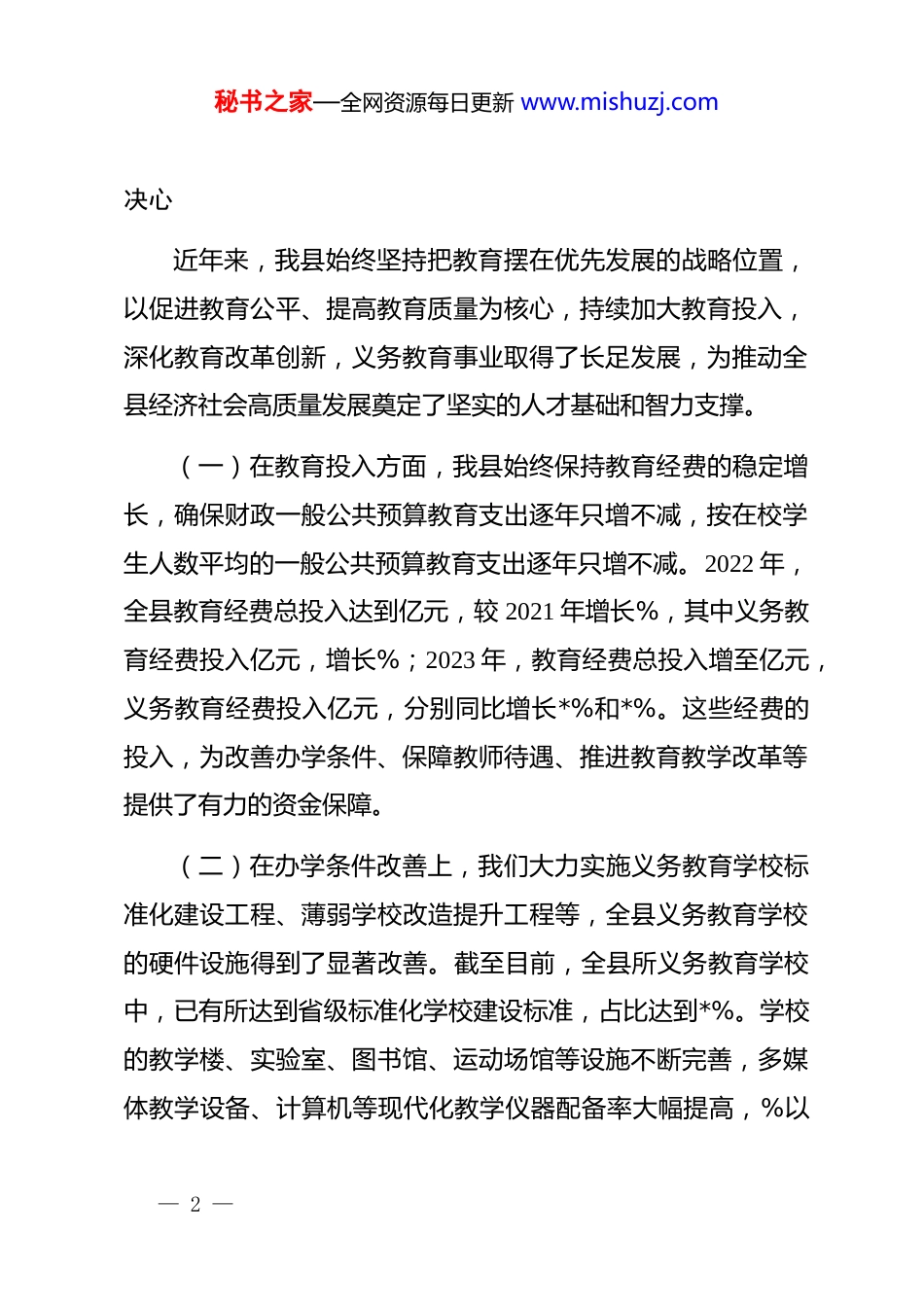 秘书之家—全网资源每日更新 www.mishuzj.com在全县推动义务教育优质均衡发展会议上的讲话同志们:现在开会,今天我们在这里召开全县推动义务教育优质均衡发展会议,主要任务是深入贯彻落实国家和省市关于教育改革发展的决策部署,总结我县义务教育发展取得的成绩,分析当前面临的形势与挑战,安排部署下一阶段推动义务教育优质均衡发展的重点工作,动员全县上下统一思想、凝心聚力,加快推进我县义务教育迈向更高质量、更趋均衡的新阶段。参加今天的会议有县委、县人大、县政府、县政协相关领导,各乡镇(街道)主要负责同志,县教育局班子成员及各股室负责人,各中小学校长、幼儿园园长等。刚才,县教育局、*镇、*街道分别作了汇报发言,既总结了各自在推动义务教育发展方面的做法和成效,也提出了下一步的工作思路,讲得都很好,我都同意,大家一定要落实好。下面,结合工作实际,我再讲几点意见。一、肯定成绩,坚定推动义务教育优质均衡发展的信心与— 1 —秘书之家—全网资源每日更新 www.mishuzj.com决心近年来,我县始终坚持把教育摆在优先发展的战略位置,以促进教育公平、提高教育质量为核心,持续加大教育投入,深化教育改革创新,义务教育事业取得了长足发展,为推动全县经济社会高质量发展奠定了坚实的人才基础和智力支撑。(一)在教育投入方面,我县始终保持教育经费的稳定增长,确保财政一般公共预算教育支出逐年只增不减,按在校学生人数平均的一般公共预算教育支出逐年只增不减。2022 年,全县教育经费总投入达到亿元,较 2021 年增长%,其中义务教育经费投入亿元,增长%;2023 年,教育经费总投入增至亿元,义务教育经费投入亿元,分别同比增长*%和*%。这些经费的投入,为改善办学条件、保障教师待遇、推进教育教学改革等提供了有力的资金保障。(二)在办学条件改善上,我们大力实施义务教育学校标准化建设工程、薄弱学校改造提升工程等,全县义务教育学校的硬件设施得到了显著改善。截至目前,全县所义务教育学校中,已有所达到省级标准化学校建设标准,占比达到*%。学校的教学楼、实验室、图书馆、运动场馆等设施不断完善,多媒体教学设备、计算机等现代化教学仪器配备率大幅提高,%以— 2 —秘书之家—全网资源每日更新 www.mishuzj.com上的班级实现了多媒体教学全覆盖,%的学校建成了校园网络,为开展现代化教育教学活动创造了良好条件。例如,镇中心小学,过去办学条件较为简陋,教室陈旧,教学设备不足。通过实施薄弱学校改造工程,投入资金万元,新建了教学楼栋、标准化操场*个,配备了全新的多媒体教学设备和实验仪器,学校面貌焕然一新,教学环境得到了极大改善。(三)在师资队伍建设方面,我们坚持把加强教师队伍建设作为提高教育质量的关键,不断完善教师招聘、培养、培训、激励机制。近年来,全县共新招聘义务教育阶段教师名,其中本科及以上学历占比达到%,有效补充了教师队伍力量。同时,加大教师培训力度,每年组织开展各类教师培训活动余次,培训教师余人次,教师的专业素养和教学能力得到了明显提升。我们还建立了城乡教师交流轮岗制度,每年安排*名城区优秀教师到农村学校支教,名农村教师到城区学校跟岗学习,促进了城乡师资力量的均衡配置。县第一中学的老师,是我县的骨干教师,连续三年到乡中学支教,不仅带去了先进的教学理念和教学方法,还帮助该校培养了一批青年教师,使该校的教学质量有了显著提高。(四)在教育质量提升上,我县始终坚持以教学为中心,— 3 —秘书之家—全网资源每日更新 www.mishuzj.com深化课程改革,加强教学管理,义务教育阶段学生的综合素质不断提升。全县义务教育阶段适龄儿童少年入学率始终保持在*%,巩固率达到*%以上。在全市中小学学业水平测试中,我县义务教育阶段学生的平均分、优秀率等指标均位居全市前列。同时,我们注重学生的全面发展,积极开展体育、艺术、科技等各类课外活动,培养学生的兴趣爱好和特长。县实验小学组建了多个学生社团,如机器人社团、舞蹈社团、书法社团等,学生在各类竞赛中屡获佳绩,其中机器人社团在全省中小学机器人大赛中获得一等奖项、二等奖*项。特别是...