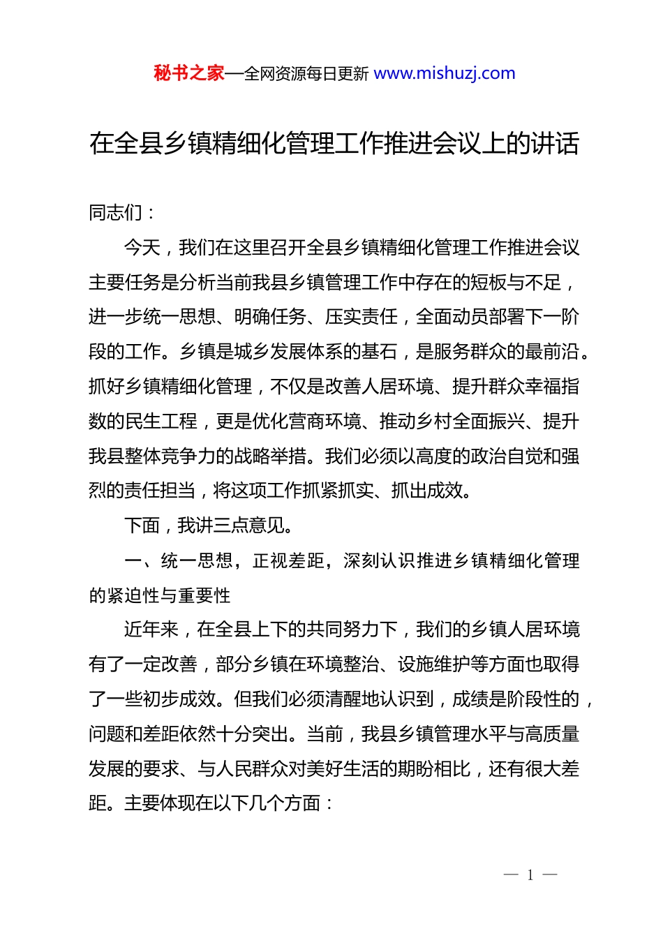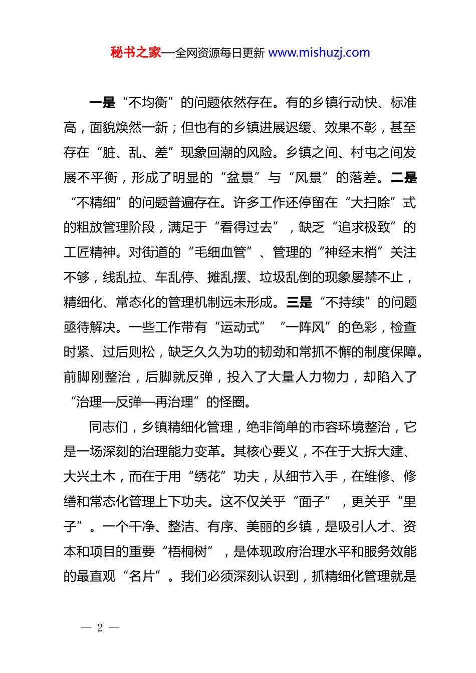 秘书之家—全网资源每日更新 www.mishuzj.com在全县乡镇精细化管理工作推进会议上的讲话同志们:今天,我们在这里召开全县乡镇精细化管理工作推进会议主要任务是分析当前我县乡镇管理工作中存在的短板与不足,进一步统一思想、明确任务、压实责任,全面动员部署下一阶段的工作。乡镇是城乡发展体系的基石,是服务群众的最前沿。抓好乡镇精细化管理,不仅是改善人居环境、提升群众幸福指数的民生工程,更是优化营商环境、推动乡村全面振兴、提升我县整体竞争力的战略举措。我们必须以高度的政治自觉和强烈的责任担当,将这项工作抓紧抓实、抓出成效。下面,我讲三点意见。一、统一思想,正视差距,深刻认识推进乡镇精细化管理的紧迫性与重要性近年来,在全县上下的共同努力下,我们的乡镇人居环境有了一定改善,部分乡镇在环境整治、设施维护等方面也取得了一些初步成效。但我们必须清醒地认识到,成绩是阶段性的,问题和差距依然十分突出。当前,我县乡镇管理水平与高质量发展的要求、与人民群众对美好生活的期盼相比,还有很大差距。主要体现在以下几个方面:— 1 —秘书之家—全网资源每日更新 www.mishuzj.com一是“不均衡”的问题依然存在。有的乡镇行动快、标准高,面貌焕然一新;但也有的乡镇进展迟缓、效果不彰,甚至存在“脏、乱、差”现象回潮的风险。乡镇之间、村屯之间发展不平衡,形成了明显的“盆景”与“风景”的落差。二是“不精细”的问题普遍存在。许多工作还停留在“大扫除”式的粗放管理阶段,满足于“看得过去”,缺乏“追求极致”的工匠精神。对街道的“毛细血管”、管理的“神经末梢”关注不够,线乱拉、车乱停、摊乱摆、垃圾乱倒的现象屡禁不止,精细化、常态化的管理机制远未形成。三是“不持续”的问题亟待解决。一些工作带有“运动式”“一阵风”的色彩,检查时紧、过后则松,缺乏久久为功的韧劲和常抓不懈的制度保障。前脚刚整治,后脚就反弹,投入了大量人力物力,却陷入了“治理—反弹—再治理”的怪圈。同志们,乡镇精细化管理,绝非简单的市容环境整治,它是一场深刻的治理能力变革。其核心要义,不在于大拆大建、大兴土木,而在于用“绣花”功夫,从细节入手,在维修、修缮和常态化管理上下功夫。这不仅关乎“面子”,更关乎“里子”。一个干净、整洁、有序、美丽的乡镇,是吸引人才、资本和项目的重要“梧桐树”,是体现政府治理水平和服务效能的最直观“名片”。我们必须深刻认识到,抓精细化管理就是— 2 —秘书之家—全网资源每日更新 www.mishuzj.com抓发展环境、抓民生福祉、抓治理现代化。全县各级各部门务必把思想和行动统一到县委、县政府的决策部署上来,以“等不起”的紧迫感、“慢不得”的危机感,坚决打好这场攻坚战和持久战。二、明确标准,聚焦重点,以“五个建设”和“五个规范”为抓手全面提升管理水平推进乡份精细化管理,必须要有明确的目标和看得见、摸得着的具体标准。空喊口号、大而化之是搞不好工作的。我们要紧紧围绕“五个建设”和“五个规范”这一核心任务,以点带面,整体推进,确保每一项工作都有章可循、有标可依。首先,要高质量推进“五个建设”,夯实精细化管理的硬件基础。第一,建设好“路边沟”。这看似小事,却直接关系到雨季排水和村容村貌。要按照统一标准进行系统性建设和改造,确保主次干道路边沟实现硬化处理,有条件的要加盖封闭。新建路边沟深度不低于 40 厘米,宽度不低于 30 厘米,采用混凝土或浆砌石结构,确保坚固耐用、排水通畅。要建立定期清淤制度,责任到人,确保沟内无垃圾、无淤积、无堵塞。第二,铺设好“路边石”。路边石是区分路面、人行道、绿化带的重要界线,是街道整洁有序的“标尺”。全县乡镇所— 3 —秘书之家—全网资源每日更新 www.mishuzj.com在地主要街道必须统一铺设路边石。材质建议选用高强度花岗岩或混凝土预制块,高度要统一露出地面 15 厘米,线条必须平直、顺滑、无破损。要将路边石铺设与人行道升级、盲道建设等工作统筹结合,一体推进。第三,铺设好“地面方砖”。破损、坑洼的人行道是乡镇管理的一大“痛点”。要对乡镇建成区内的主次干道人行道进...