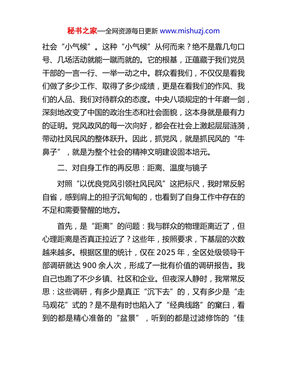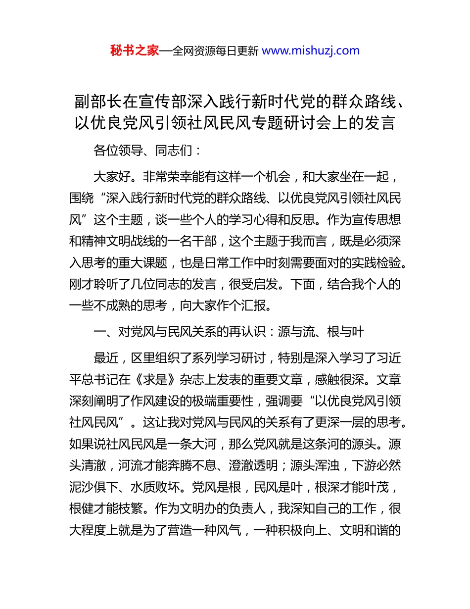 秘书之家—全网资源每日更新 www.mishuzj.com副部长在宣传部深入践行新时代党的群众路线、以优良党风引领社风民风专题研讨会上的发言各位领导、同志们:大家好。非常荣幸能有这样一个机会,和大家坐在一起,围绕“深入践行新时代党的群众路线、以优良党风引领社风民风”这个主题,谈一些个人的学习心得和反思。作为宣传思想和精神文明战线的一名干部,这个主题于我而言,既是必须深入思考的重大课题,也是日常工作中时刻需要面对的实践检验。刚才聆听了几位同志的发言,很受启发。下面,结合我个人的一些不成熟的思考,向大家作个汇报。一、对党风与民风关系的再认识:源与流、根与叶最近,区里组织了系列学习研讨,特别是深入学习了习近平总书记在《求是》杂志上发表的重要文章,感触很深。文章深刻阐明了作风建设的极端重要性,强调要“以优良党风引领社风民风”。这让我对党风与民风的关系有了更深一层的思考。如果说社风民风是一条大河,那么党风就是这条河的源头。源头清澈,河流才能奔腾不息、澄澈透明;源头浑浊,下游必然泥沙俱下、水质败坏。党风是根,民风是叶,根深才能叶茂,根健才能枝繁。作为文明办的负责人,我深知自己的工作,很大程度上就是为了营造一种风气,一种积极向上、文明和谐的秘书之家—全网资源每日更新 www.mishuzj.com社会“小气候”。这种“小气候”从何而来?绝不是靠几句口号、几场活动就能一蹴而就的。它的根基,正蕴藏于我们党员干部的一言一行、一举一动之中。群众看我们,不仅仅是看我们做了多少工作、取得了多少成绩,更是在看我们的作风、我们的人品、我们对待群众的态度。中央八项规定的十年磨一剑,深刻地改变了中国的政治生态和社会面貌,这本身就是最有力的证明。党风政风的每一次向好,都会在社会上激起层层涟漪,带动社风民风的整体跃升。因此,抓党风,就是抓民风的“牛鼻子”,就是为整个社会的精神文明建设固本培元。二、对自身工作的再反思:距离、温度与镜子对照“以优良党风引领社风民风”这把标尺,我时常反躬自省,感到肩上的担子沉甸甸的,也看到了自身工作中存在的不足和需要警醒的地方。首先,是“距离”的问题:我与群众的物理距离近了,但心理距离是否真正拉近了?这些年,按照要求,下基层的次数越来越多。根据区里的统计,仅在 2025 年,全区处级领导干部调研就达 900 余人次,形成了一批有价值的调研报告。我自己也跑了不少乡镇、社区和企业。但夜深人静时,我常常反思:这些调研,有多少是真正“沉下去”的,又有多少是“走马观花”式的?是不是有时也陷入了“经典线路”的窠臼,看到的都是精心准备的“盆景”,听到的都是过滤修饰的“佳秘书之家—全网资源每日更新 www.mishuzj.com音”?我们常说要拜群众为师,但如果听不到真话、摸不到实情,这个“老师”又从何拜起?再看我们的群众诉求解决机制。区里的 12345 热线,办结率常年在 97%以上,市场监管等部门的投诉办结率甚至超过 99%。这些数字无疑是亮眼的。但我也在想,一个诉求的“办结”,是否等同于群众的“满意”?一个问题的“解决”,是否真正打开了群众的“心结”?当我们的干部习惯于在办公室里通过电话和文件来处理问题时,是否也在无形中与群众隔了一层“玻璃门”?我们看到了问题,却感受不到问题背后的焦虑与期盼。这种距离感,恰恰是形式主义、官僚主义的温床,也是侵蚀党群干群关系的“隐形杀手”。其次,是“温度”的问题:我的工作是完成了任务,还是传递了党和政府的温暖?作为宣传干部,我们的工作常常与文字、会议、活动打交道。有时为了完成一项紧急任务,会连夜撰写材料、策划方案,追求的是“快”和“好”。但回过头看,一些工作是否也存在“重形式、轻内容”“重留痕、轻实效”的问题?比如,为了迎接检查,是不是也曾把大量精力花在整理台账、美化展板上,而忽略了工作本身的实际效果?我们组织的文化活动,比如“又跑又唱·*风光”这样的全民健身活动,群众非常欢迎。这让我反思,我们的工作是否都能像这样,真正做到群众的心坎里去?还是说,有些活动只是我们眼中的“政绩”,却是群众眼中的“负担”?宣传工作如果失去...
