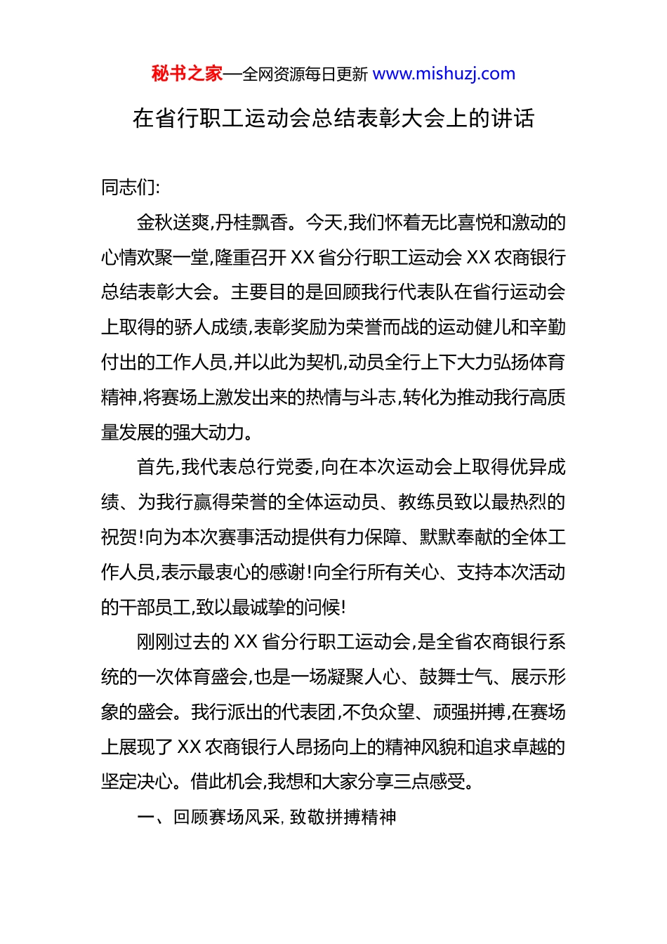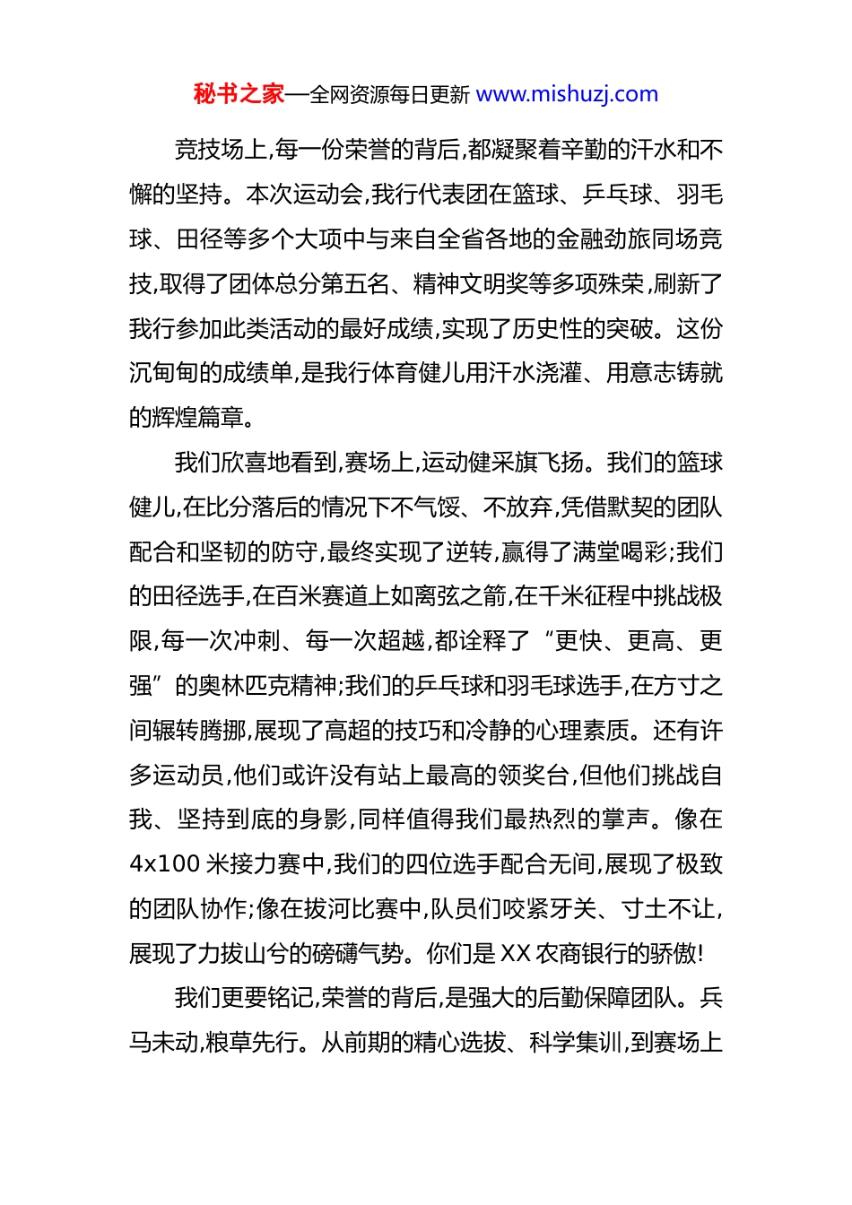 秘书之家—全网资源每日更新 www.mishuzj.com在省行职工运动会总结表彰大会上的讲话 同志们:金秋送爽,丹桂飘香。今天,我们怀着无比喜悦和激动的心情欢聚一堂,隆重召开 XX 省分行职工运动会 XX 农商银行总结表彰大会。主要目的是回顾我行代表队在省行运动会上取得的骄人成绩,表彰奖励为荣誉而战的运动健儿和辛勤付出的工作人员,并以此为契机,动员全行上下大力弘扬体育精神,将赛场上激发出来的热情与斗志,转化为推动我行高质量发展的强大动力。首先,我代表总行党委,向在本次运动会上取得优异成绩、为我行赢得荣誉的全体运动员、教练员致以最热烈的祝贺!向为本次赛事活动提供有力保障、默默奉献的全体工作人员,表示最衷心的感谢!向全行所有关心、支持本次活动的干部员工,致以最诚挚的问候!刚刚过去的 XX 省分行职工运动会,是全省农商银行系统的一次体育盛会,也是一场凝聚人心、鼓舞士气、展示形象的盛会。我行派出的代表团,不负众望、顽强拼搏,在赛场上展现了 XX 农商银行人昂扬向上的精神风貌和追求卓越的坚定决心。借此机会,我想和大家分享三点感受。一、回顾赛场风采,致敬拼搏精神秘书之家—全网资源每日更新 www.mishuzj.com竞技场上,每一份荣誉的背后,都凝聚着辛勤的汗水和不懈的坚持。本次运动会,我行代表团在篮球、乒乓球、羽毛球、田径等多个大项中与来自全省各地的金融劲旅同场竞技,取得了团体总分第五名、精神文明奖等多项殊荣,刷新了我行参加此类活动的最好成绩,实现了历史性的突破。这份沉甸甸的成绩单,是我行体育健儿用汗水浇灌、用意志铸就的辉煌篇章。我们欣喜地看到,赛场上,运动健采旗飞扬。我们的篮球健儿,在比分落后的情况下不气馁、不放弃,凭借默契的团队配合和坚韧的防守,最终实现了逆转,赢得了满堂喝彩;我们的田径选手,在百米赛道上如离弦之箭,在千米征程中挑战极限,每一次冲刺、每一次超越,都诠释了“更快、更高、更强”的奥林匹克精神;我们的乒乓球和羽毛球选手,在方寸之间辗转腾挪,展现了高超的技巧和冷静的心理素质。还有许多运动员,他们或许没有站上最高的领奖台,但他们挑战自我、坚持到底的身影,同样值得我们最热烈的掌声。像在4x100 米接力赛中,我们的四位选手配合无间,展现了极致的团队协作;像在拔河比赛中,队员们咬紧牙关、寸土不让,展现了力拔山兮的磅礴气势。你们是 XX 农商银行的骄傲!我们更要铭记,荣誉的背后,是强大的后勤保障团队。兵马未动,粮草先行。从前期的精心选拔、科学集训,到赛场上秘书之家—全网资源每日更新 www.mishuzj.com的后勤服务、加油助威,我们的教练员、领队和工作人员们付出了大量心血。他们有的反复研究战术,为运动员提供专业指导;有的细心照料饮食起居,确保大家以最佳状态参赛;有的在赛场边声嘶力竭地呐喊,成为运动员最坚强的后盾。正是这种台前幕后、上下一心的共同努力,才汇聚成了我们夺取胜利的强大合力。可以说,这枚奖牌,不仅属于场上的运动员,更属于每一位为之付出的 XX 农商银行人。此次运动会,我们不仅收获了成绩,更收获了精神,收获了作风。它全面检阅了我行的团队凝聚力和战斗力,充分展示了我行员工积极进取、团结协作、敢于胜利的良好形象。这种精神财富,远比奖牌本身更加珍贵,必将激励我们在未来的发展道路上,不断披荆斩棘、奋勇向前。二、弘扬体育精神,激发奋进力量同志们,体育的魅力,不止于竞技本身,更在于它所蕴含的深刻哲理和精神力量。一场成功的赛事,对我们的启示是多方面的。我们必须善于总结、善于提炼,将宝贵的体育精神,内化为我们的工作理念和行动自觉,融入到全行改革发展的血脉之中。第一,要大力弘扬“勇争第一、追求卓越”的进取精神。在竞技场上,每一位运动员的目标都是冠军。这种“当仁不让、舍我其谁”的豪情,正是我行在当前激烈的金融市秘书之家—全网资源每日更新 www.mishuzj.com场竞争中迫切需要的。我们不能有“小富即安”的守成心态,不能有“中游徘徊”的自满思想。全行上下必须牢固树立“要做就做最好、要干就干第一”的雄心壮志。对公业务要敢于和国有大行、股份制银行同台竞争,抢抓大项目、大客户;零售业务要深耕细作,在服务广度与深度上打造核心竞争力;风险防控要对标...