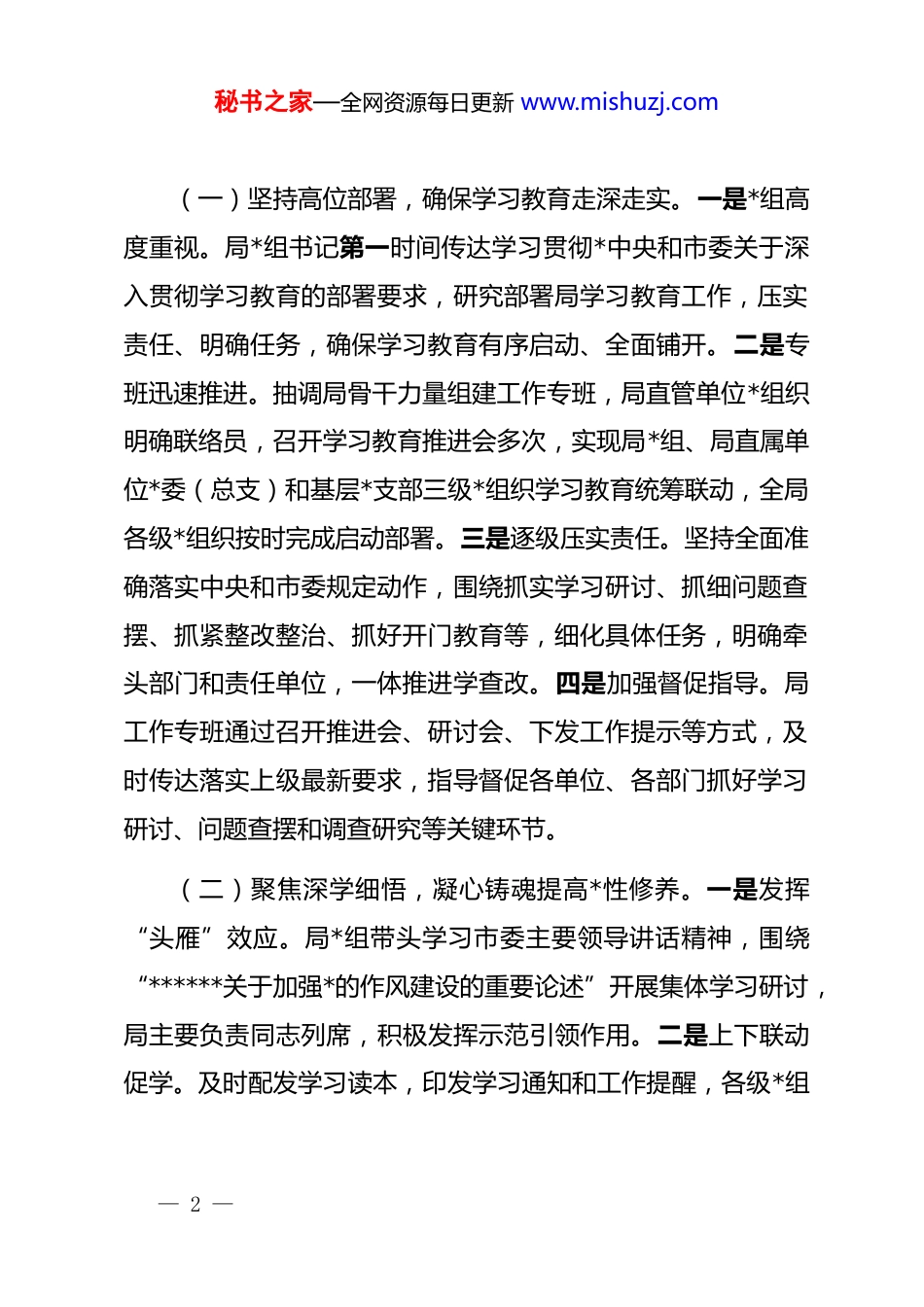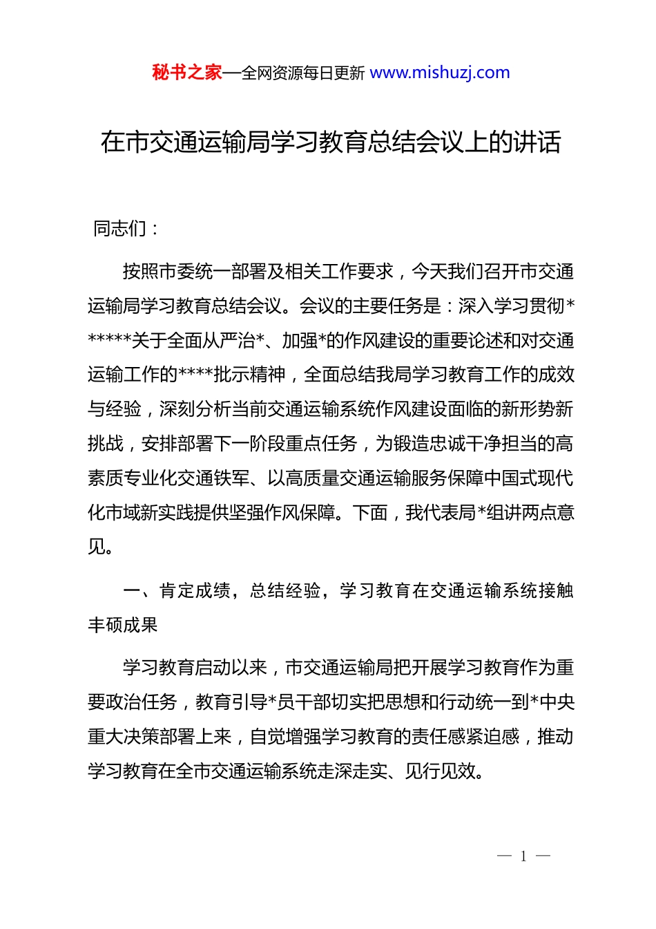 秘书之家—全网资源每日更新 www.mishuzj.com在市交通运输局学习教育总结会议上的讲话 同志们:按照市委统一部署及相关工作要求,今天我们召开市交通运输局学习教育总结会议。会议的主要任务是:深入学习贯彻******关于全面从严治*、加强*的作风建设的重要论述和对交通运输工作的****批示精神,全面总结我局学习教育工作的成效与经验,深刻分析当前交通运输系统作风建设面临的新形势新挑战,安排部署下一阶段重点任务,为锻造忠诚干净担当的高素质专业化交通铁军、以高质量交通运输服务保障中国式现代化市域新实践提供坚强作风保障。下面,我代表局*组讲两点意见。一、肯定成绩,总结经验,学习教育在交通运输系统接触丰硕成果学习教育启动以来,市交通运输局把开展学习教育作为重要政治任务,教育引导*员干部切实把思想和行动统一到*中央重大决策部署上来,自觉增强学习教育的责任感紧迫感,推动学习教育在全市交通运输系统走深走实、见行见效。— 1 —秘书之家—全网资源每日更新 www.mishuzj.com(一)坚持高位部署,确保学习教育走深走实。一是*组高度重视。局*组书记第一时间传达学习贯彻*中央和市委关于深入贯彻学习教育的部署要求,研究部署局学习教育工作,压实责任、明确任务,确保学习教育有序启动、全面铺开。二是专班迅速推进。抽调局骨干力量组建工作专班,局直管单位*组织明确联络员,召开学习教育推进会多次,实现局*组、局直属单位*委(总支)和基层*支部三级*组织学习教育统筹联动,全局各级*组织按时完成启动部署。三是逐级压实责任。坚持全面准确落实中央和市委规定动作,围绕抓实学习研讨、抓细问题查摆、抓紧整改整治、抓好开门教育等,细化具体任务,明确牵头部门和责任单位,一体推进学查改。四是加强督促指导。局工作专班通过召开推进会、研讨会、下发工作提示等方式,及时传达落实上级最新要求,指导督促各单位、各部门抓好学习研讨、问题查摆和调查研究等关键环节。(二)聚焦深学细悟,凝心铸魂提高*性修养。一是发挥“头雁”效应。局*组带头学习市委主要领导讲话精神,围绕“******关于加强*的作风建设的重要论述”开展集体学习研讨,局主要负责同志列席,积极发挥示范引领作用。二是上下联动促学。及时配发学习读本,印发学习通知和工作提醒,各级*组— 2 —秘书之家—全网资源每日更新 www.mishuzj.com织及时跟进,组织学习研讨,引导基层*员在学习教育中正本清源、固本培元,筑牢思想政治根基。三是注重关键群体。将年轻干部特别是年轻领导干部列为重点,举办“清风传家廉润初心”等专题讲座和廉洁教育课,通过谈心谈话、座谈交流等方式,教育引导年轻干部明辨是非、增强定力,将学习过程内化为思想自觉和行动自觉。(三)突出学用结合,推动作风建设向纵深发展。一是认真查摆问题。坚持联系实际边学习、边对照、边调研、边剖析,聚焦交通运输工程建设、行政审批、执法监管、资金管理、服务群众等领域,形成包含具体问题和表现的学习教育查摆问题清单及整改整治台账,确保问题找准找实、直达痛点。局*组、*组成员及局*组织均深入查摆问题,形成整改清单。二是树牢群众观念。坚持将学习教育与整治群众身边不正之风和腐败问题有机结合,明确重点整治任务和民生实事项目,落实局领导班子成员包保责任制,突出抓好交通出行服务领域问题整改。针对货车司机权益保障,优化投诉处置流程,建立“系统提示+短信提醒+人工催办”相结合的高效响应机制,提升办结率和满意度,学习教育启动以来,接办投诉 86 件,办结率92%)。针对群众出行“急难愁盼”,聚焦农村公路建设管养、— 3 —秘书之家—全网资源每日更新 www.mishuzj.com城市公交服务提升、高速公路服务区品质、出租车(网约车)规范管理等,推动解决了一批实际问题。三是注重学用结合。坚持把开展学习教育与贯彻落实******关于交通运输工作的重要论述结合起来,与贯彻落实市委市政府关于“四好农村路”建设、综合立体交通网规划、优化营商环境等部署要求结合起来,与落实巡视巡察问题整改、清廉交通建设等工作贯通起来,使学习教育每项措施都成为推动交通中心工作的有效举措,转化为推动...