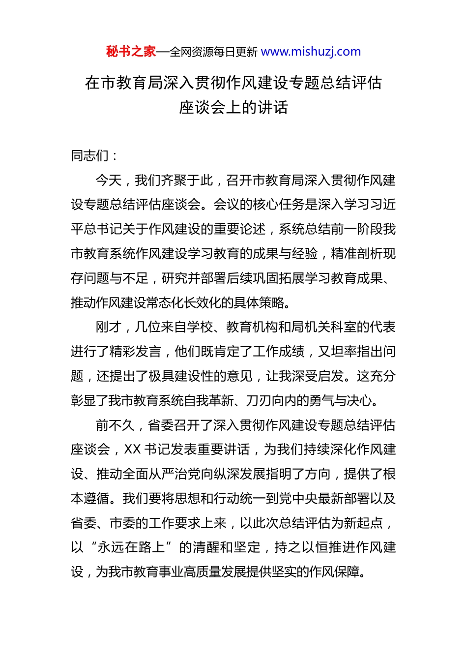 秘书之家—全网资源每日更新 www.mishuzj.com在市教育局深入贯彻作风建设专题总结评估座谈会上的讲话 同志们:今天,我们齐聚于此,召开市教育局深入贯彻作风建设专题总结评估座谈会。会议的核心任务是深入学习习近平总书记关于作风建设的重要论述,系统总结前一阶段我市教育系统作风建设学习教育的成果与经验,精准剖析现存问题与不足,研究并部署后续巩固拓展学习教育成果、推动作风建设常态化长效化的具体策略。刚才,几位来自学校、教育机构和局机关科室的代表进行了精彩发言,他们既肯定了工作成绩,又坦率指出问题,还提出了极具建设性的意见,让我深受启发。这充分彰显了我市教育系统自我革新、刀刃向内的勇气与决心。前不久,省委召开了深入贯彻作风建设专题总结评估座谈会,XX 书记发表重要讲话,为我们持续深化作风建设、推动全面从严治党向纵深发展指明了方向,提供了根本遵循。我们要将思想和行动统一到党中央最新部署以及省委、市委的工作要求上来,以此次总结评估为新起点,以“永远在路上”的清醒和坚定,持之以恒推进作风建设,为我市教育事业高质量发展提供坚实的作风保障。秘书之家—全网资源每日更新 www.mishuzj.com下面,我讲三点意见。一、总结成果、洞察短板,客观评估作风建设阶段性成效自作风建设学习教育开展以来,全市教育系统坚决贯彻中央决策部署以及省委、市委工作安排,将落实中央八项规定精神作为重大政治任务,紧密结合教育行业特性,以“严、实、效”为准则,精心组织、稳步推进,取得了显著的阶段性成效。(一)思想武装再强化,政治站位新提升。全市教育系统各级党组织和广大党员干部,通过集中学习、专题研讨、个人自学等多元方式,深刻领悟“两个确立”的决定性意义,不断增强“四个意识”、坚定“四个自信”、做到“两个维护”。大家深刻认识到,作风问题本质上是党性问题。据统计,此次学习教育覆盖全市 XX 所学校、XX余名教职工,实现了人员、内容、时间的全面落实。广大教育工作者“学高为师、身正为范”的职业精神更加凸显,廉洁从教、廉洁从政的自觉性大幅提高。(二)突出问题严整治,教育生态焕新颜。我们以问题为导向,聚焦群众反映强烈、长期未能解决的突出问题,开展了全方位、精准化整治。全市教育系统上下联动,通过自查自纠、交叉检查、明察暗访等方式,共梳理秘书之家—全网资源每日更新 www.mishuzj.com出“校外培训乱象”“违规招生”“教育资源分配不均”“教师有偿补课”等 XX 个方面 XX 条突出问题。针对这些问题,我们建立台账、明确责任、限定时间,实施销号管理。截至目前,已完成整改 XX 条,整改完成率达 95%以上。特别是针对校外培训市场的乱象,我们联合市场监管、公安等部门开展专项治理,查处了一批违规机构,形成了强大震慑。通过整治,教育领域的“痛点”“难点”问题得到有效缓解,风清气正的教育生态正在逐步形成。(三)服务意识更牢固,为民办事见成效。我们始终把学习教育的落脚点放在解决群众“急难愁盼”问题上,深入开展“查堵点、破难题、促发展”活动,将作风建设成果切实转化为惠民实效。全市各级教育部门和学校累计推出便民利民措施 XX 余项,包括优化入学报名系统,将平均报名等待时间缩短了 20%;在 XX 所学校推行课后延时服务,解决了家长的后顾之忧;组织骨干教师开展送教下乡活动超过 300 场次,受益学生近 8 万人次。这些实实在在的举措,有效提升了人民群众的教育获得感,群众满意度测评结果较去年同期提升了 9.2 个百分点,党和人民群众的血肉联系在教育领域得到进一步巩固。(四)干事创业热情高,教师队伍添活力。通过学习教育和整改整治,全市教育系统党员干部的纪律意识、规秘书之家—全网资源每日更新 www.mishuzj.com矩意识显著增强,担当作为、干事创业的氛围日益浓厚。一批长期困扰教育发展的难题得到破解,一批重点工作取得突破性进展。我们欣喜地看到,广大教育工作者将学习教育激发的热情,转化为推进我市教育改革、提升教育质量的强大动力。在推进“XX 智慧教育平台”建设、深化教育评价改革等重点工作中,大家勇挑重担、开拓创新,展现了教育...