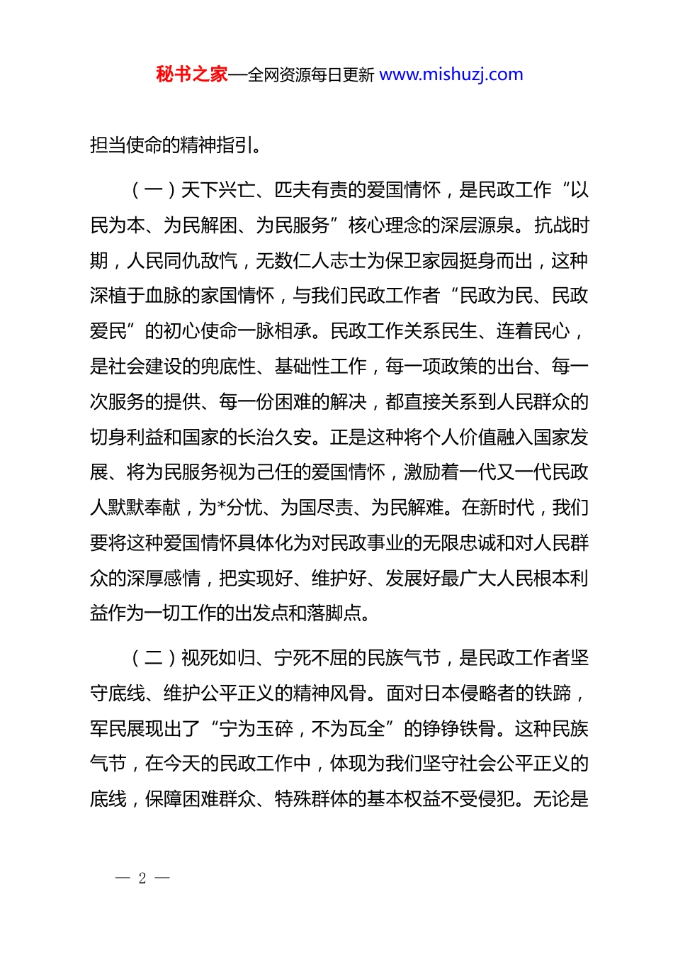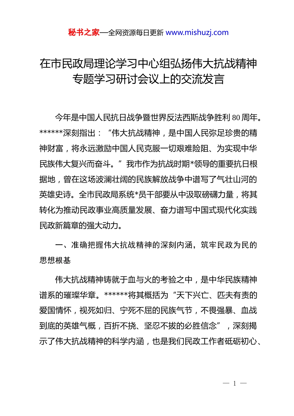 秘书之家—全网资源每日更新 www.mishuzj.com在市民政局理论学习中心组弘扬伟大抗战精神专题学习研讨会议上的交流发言今年是中国人民抗日战争暨世界反法西斯战争胜利 80 周年。******深刻指出:“伟大抗战精神,是中国人民弥足珍贵的精神财富,将永远激励中国人民克服一切艰难险阻、为实现中华民族伟大复兴而奋斗。”我市作为抗战时期*领导的重要抗日根据地,曾在这场波澜壮阔的民族解放战争中谱写了气壮山河的英雄史诗。全市民政局系统*员干部要从中汲取磅礴力量,将其转化为推动民政事业高质量发展、奋力谱写中国式现代化实践民政新篇章的强大动力。一、准确把握伟大抗战精神的深刻内涵,筑牢民政为民的思想根基伟大抗战精神铸就于血与火的考验之中,是中华民族精神谱系的璀璨华章。******将其概括为“天下兴亡、匹夫有责的爱国情怀,视死如归、宁死不屈的民族气节,不畏强暴、血战到底的英雄气概,百折不挠、坚忍不拔的必胜信念”,深刻揭示了伟大抗战精神的科学内涵,也是我们民政工作者砥砺初心、— 1 —秘书之家—全网资源每日更新 www.mishuzj.com担当使命的精神指引。(一)天下兴亡、匹夫有责的爱国情怀,是民政工作“以民为本、为民解困、为民服务”核心理念的深层源泉。抗战时期,人民同仇敌忾,无数仁人志士为保卫家园挺身而出,这种深植于血脉的家国情怀,与我们民政工作者“民政为民、民政爱民”的初心使命一脉相承。民政工作关系民生、连着民心,是社会建设的兜底性、基础性工作,每一项政策的出台、每一次服务的提供、每一份困难的解决,都直接关系到人民群众的切身利益和国家的长治久安。正是这种将个人价值融入国家发展、将为民服务视为己任的爱国情怀,激励着一代又一代民政人默默奉献,为*分忧、为国尽责、为民解难。在新时代,我们要将这种爱国情怀具体化为对民政事业的无限忠诚和对人民群众的深厚感情,把实现好、维护好、发展好最广大人民根本利益作为一切工作的出发点和落脚点。(二)视死如归、宁死不屈的民族气节,是民政工作者坚守底线、维护公平正义的精神风骨。面对日本侵略者的铁蹄,军民展现出了“宁为玉碎,不为瓦全”的铮铮铁骨。这种民族气节,在今天的民政工作中,体现为我们坚守社会公平正义的底线,保障困难群众、特殊群体的基本权益不受侵犯。无论是— 2 —秘书之家—全网资源每日更新 www.mishuzj.com保障城乡低保对象的基本生活,还是维护残疾人、孤儿等特殊群体的合法权益,亦或是推进殡葬改革、维护婚姻登记秩序,都需要我们有“宁死不屈”的气节,敢于较真碰硬,坚决抵制侵害群众利益的行为,确保*和政府的惠民政策不折不扣落到实处,让每一位服务对象都能感受到社会的公平与温暖。(三)不畏强暴、血战到底的英雄气概,是民政工作者攻坚克难、勇于担当的行动指南。抗战时期,人民在极端艰难困苦的条件下,开展了艰苦卓绝的游击战争,展现了不畏强敌、血战到底的英雄气概。当前,民政事业发展也面临着不少挑战:人口老龄化加速带来的养老服务压力、社会救助体系精准化精细化水平有待提升、基层治理体系和治理能力现代化建设任务艰巨等。面对这些“硬骨头”,我们民政工作者要发扬“不畏强暴、血战到底”的英雄气概,敢于直面矛盾,勇于攻坚克难。例如,在推进养老服务体系建设中,要敢于突破体制机制障碍,积极探索智慧养老、医养结合新模式;在深化基层治理改革中,要勇于创新社区服务管理方式,提升基层治理效能。(四)百折不挠、坚忍不拔的必胜信念,是民政工作者砥砺前行、追求卓越的力量支撑。抗日战争的胜利,是中华民族百折不挠、坚忍不拔精神的生动写照。民政事业的发展也并非— 3 —秘书之家—全网资源每日更新 www.mishuzj.com一帆风顺,从建国初期的百废待兴到改革开放后的蓬勃发展,再到新时代的高质量发展,每一步都离不开民政人“百折不挠、坚忍不拔”的必胜信念。面对改革发展中的新问题、新挑战,我们要坚定“民政工作无小事”的信念,以“钉钉子”精神一抓到底,以“功成不必在我,功成必定有我”的境界接续奋斗。例如,在推进流浪乞讨人员救助管理工作中,要秉持“不放弃任何一个生命”的信念,持续优...