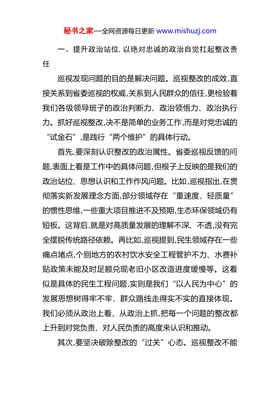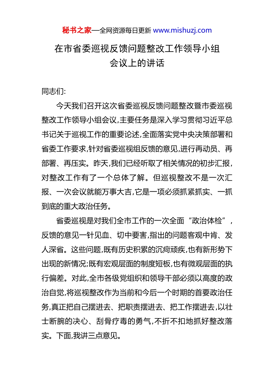 秘书之家—全网资源每日更新 www.mishuzj.com在市省委巡视反馈问题整改工作领导小组会议上的讲话 同志们:今天我们召开这次省委巡视反馈问题整改暨市委巡视整改工作领导小组会议,主要任务是深入学习贯彻习近平总书记关于巡视工作的重要论述,全面落实党中央决策部署和省委工作要求,针对省委巡视组反馈的意见,进行再动员、再部署、再压实。昨天,我们已经听取了相关情况的初步汇报,对整改工作有了一个总体了解。但巡视整改不是一次汇报、一次会议就能万事大吉,它是一项必须抓紧抓实、一抓到底的重大政治任务。省委巡视是对我们全市工作的一次全面“政治体检”,反馈的意见一针见血、切中要害,指出的问题客观中肯、发人深省。这些问题,既有历史积累的沉疴顽疾,也有新形势下出现的新情况;既有宏观层面的制度短板,也有微观层面的执行偏差。对此,全市各级党组织和领导干部必须以高度的政治自觉,将巡视整改作为当前和今后一个时期的首要政治任务,真正把自己摆进去、把职责摆进去、把工作摆进去,以壮士断腕的决心、刮骨疗毒的勇气,不折不扣地抓好整改落实。下面,我讲三点意见。秘书之家—全网资源每日更新 www.mishuzj.com一、提升政治站位,以绝对忠诚的政治自觉扛起整改责任巡视发现问题的目的是解决问题。巡视整改的成效,直接关系到省委巡视的权威,关系到人民群众的信任,更检验着我们各级领导班子的政治判断力、政治领悟力、政治执行力。抓好巡视整改,决不是简单的业务工作,而是对党忠诚的“试金石”,是践行“两个维护”的具体行动。首先,要深刻认识整改的政治属性。省委巡视反馈的问题,表面上看是工作中的具体问题,但根子上反映的是我们的政治站位、思想认识和工作作风问题。比如,巡视指出,在贯彻落实新发展理念方面,部分领域存在“重速度、轻质量”的惯性思维,一些重大项目推进不及预期,生态环保领域仍有短板。这背后,就是对高质量发展的理解不深、不透,没有完全摆脱传统路径依赖。再比如,巡视提到,民生领域存在一些痛点堵点,个别地方的农村饮水安全工程管护不力、水费补贴政策未能及时足额兑现老旧小区改造进度缓慢等。这看似是具体的民生工程问题,实则是我们“以人民为中心”的发展思想树得牢不牢、群众路线走得实不实的直接体现。我们必须从政治上看、从政治上抓,把每一个问题的整改都上升到对党负责、对人民负责的高度来认识和推动。其次,要坚决破除整改的“过关”心态。巡视整改不能秘书之家—全网资源每日更新 www.mishuzj.com有“闯关”思想,不能认为反馈了、开会了、部署了,就可以松一口气。从一些其他地区的经验看,“巡视整改有待巩固”和“巡视整改成果有待进一步巩固扩大”是普遍存在的现象。个别同志可能还存在“与己无关”的看客心态,认为问题出在基层、出在别的部门;或者存在“避重就轻”的投机心态,对容易解决的问题雷厉风行,对难啃的“硬骨头”则绕道走;甚至还有“蒙混过关”的侥幸心态,满足于纸面整改、数字整改。这些错误思想是整改工作的大敌,必须坚决予以纠正。全市上下要牢固树立“整改不到位就是对党不忠诚、对人民不负责”的理念,以最坚决的态度、最严格的标准、最务实的作风,确保整改工作经得起历史、人民和实践的检验。最后,要全面压实整改的责任链条。巡视整改是一项系统工程,必须构建起一级抓一级、层层抓落实的责任体系。市委作为整改的责任主体,要总揽全局、牵头抓总。我作为第一责任人,对整改工作负总责。各位市领导要严格履行“一岗双责”,按照职责分工,主动认领问题,带头研究措施,亲自督促进度。各牵头单位要切实担负起牵头职责,不能当“二传手”,要主动与协办单位沟通对接,形成合力。各责任单位要坚决扛起具体整改职责,单位“一把手”是本单位整改的第一责任人,要亲力亲为,确保本领域、本单位的问题一秘书之家—全网资源每日更新 www.mishuzj.com个不落、全面整改。要真正形成市委统一领导、领导小组牵头抓总、牵头单位和责任单位具体负责、纪检监察和组织部门监督推动的齐抓共管格局。二、聚焦精准施策,以动真碰硬的斗争精神确保整改实效发现问题是水平,解决问题是能力。巡视整改不能大而化之、浮于表面,必须坚持问题导向、效果导向,拿出“钉钉子...