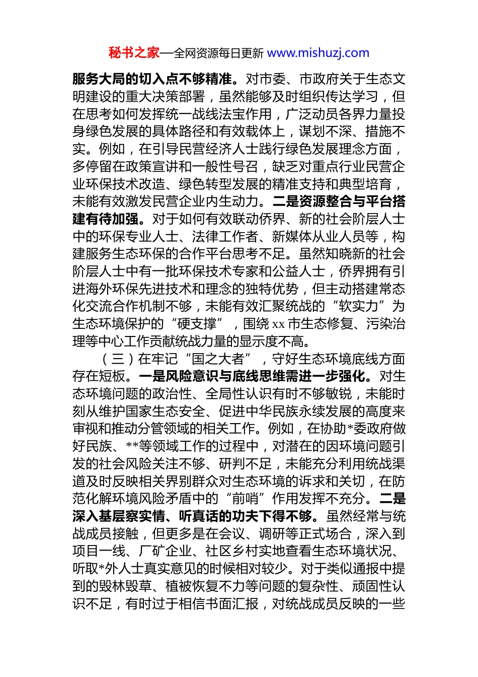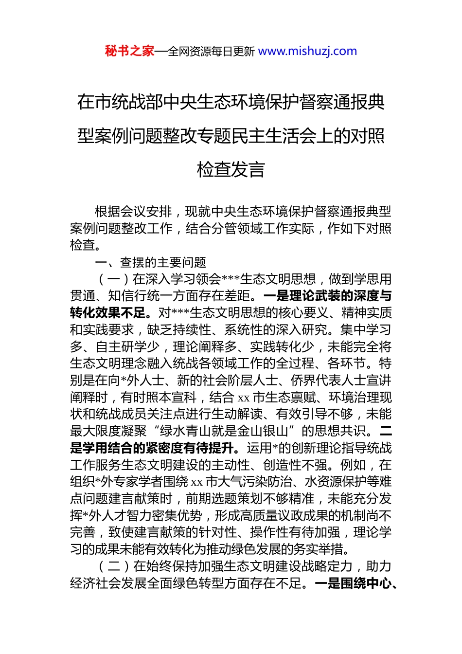 秘书之家—全网资源每日更新 www.mishuzj.com在市统战部中央生态环境保护督察通报典型案例问题整改专题民主生活会上的对照检查发言根据会议安排,现就中央生态环境保护督察通报典型案例问题整改工作,结合分管领域工作实际,作如下对照检查。一、查摆的主要问题(一)在深入学习领会***生态文明思想,做到学思用贯通、知信行统一方面存在差距。一是理论武装的深度与转化效果不足。对***生态文明思想的核心要义、精神实质和实践要求,缺乏持续性、系统性的深入研究。集中学习多、自主研学少,理论阐释多、实践转化少,未能完全将生态文明理念融入统战各领域工作的全过程、各环节。特别是在向*外人士、新的社会阶层人士、侨界代表人士宣讲阐释时,有时照本宣科,结合 xx 市生态禀赋、环境治理现状和统战成员关注点进行生动解读、有效引导不够,未能最大限度凝聚“绿水青山就是金山银山”的思想共识。二是学用结合的紧密度有待提升。运用*的创新理论指导统战工作服务生态文明建设的主动性、创造性不强。例如,在组织*外专家学者围绕 xx 市大气污染防治、水资源保护等难点问题建言献策时,前期选题策划不够精准,未能充分发挥*外人才智力密集优势,形成高质量议政成果的机制尚不完善,致使建言献策的针对性、操作性有待加强,理论学习的成果未能有效转化为推动绿色发展的务实举措。(二)在始终保持加强生态文明建设战略定力,助力经济社会发展全面绿色转型方面存在不足。一是围绕中心、秘书之家—全网资源每日更新 www.mishuzj.com服务大局的切入点不够精准。对市委、市政府关于生态文明建设的重大决策部署,虽然能够及时组织传达学习,但在思考如何发挥统一战线法宝作用,广泛动员各界力量投身绿色发展的具体路径和有效载体上,谋划不深、措施不实。例如,在引导民营经济人士践行绿色发展理念方面,多停留在政策宣讲和一般性号召,缺乏对重点行业民营企业环保技术改造、绿色转型发展的精准支持和典型培育,未能有效激发民营企业内生动力。二是资源整合与平台搭建有待加强。对于如何有效联动侨界、新的社会阶层人士中的环保专业人士、法律工作者、新媒体从业人员等,构建服务生态环保的合作平台思考不足。虽然知晓新的社会阶层人士中有一批环保技术专家和公益人士,侨界拥有引进海外环保先进技术和理念的独特优势,但主动搭建常态化交流合作机制不够,未能有效汇聚统战的“软实力”为生态环境保护的“硬支撑”,围绕 xx 市生态修复、污染治理等中心工作贡献统战力量的显示度不高。(三)在牢记“国之大者”,守好生态环境底线方面存在短板。一是风险意识与底线思维需进一步强化。对生态环境问题的政治性、全局性认识有时不够敏锐,未能时刻从维护国家生态安全、促进中华民族永续发展的高度来审视和推动分管领域的相关工作。例如,在协助*委政府做好民族、**等领域工作的过程中,对潜在的因环境问题引发的社会风险关注不够、研判不足,未能充分利用统战渠道及时反映相关界别群众对生态环境的诉求和关切,在防范化解环境风险矛盾中的“前哨”作用发挥不充分。二是深入基层察实情、听真话的功夫下得不够。虽然经常与统战成员接触,但更多是在会议、调研等正式场合,深入到项目一线、厂矿企业、社区乡村实地查看生态环境状况、听取*外人士真实意见的时候相对较少。对于类似通报中提到的毁林毁草、植被恢复不力等问题的复杂性、顽固性认识不足,有时过于相信书面汇报,对统战成员反映的一些秘书之家—全网资源每日更新 www.mishuzj.com基层环保“死角”问题跟踪督办、推动解决的力度不够坚决。(四)在树牢法治观念,运用法治方式推进生态环境治理方面存在弱项。一是法治宣传教育的针对性、实效性有待提升。在向统战成员宣传《环境保护法》《草原法》《森林法》等法律法规方面,形式较为单一,多采用发放资料、讲座培训等方式,结合典型案例进行以案说法、警示教育不够,导致部分统战成员对生态环境保护的法定责任、义务认识不清、界限不明。例如,在联系新的社会阶层人士中的企业管理者和从业人员时,对其应承担的环保法律责任强调不够,未能有效引导其牢固树立法治意识,自觉做...