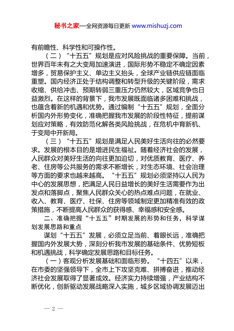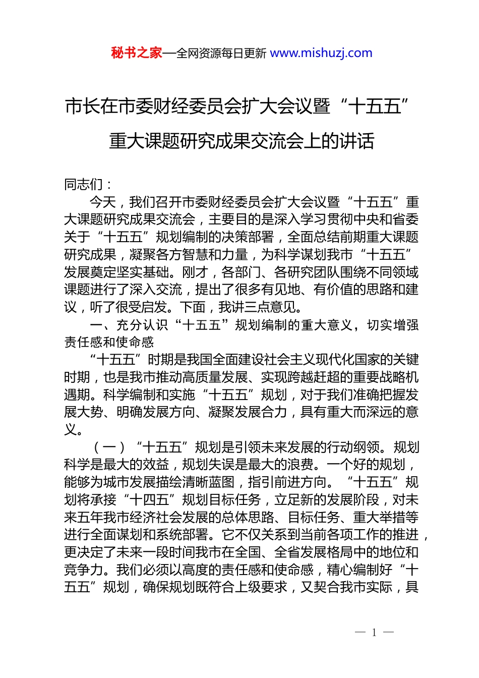 秘书之家—全网资源每日更新 www.mishuzj.com市长在市委财经委员会扩大会议暨“十五五”重大课题研究成果交流会上的讲话同志们:今天,我们召开市委财经委员会扩大会议暨“十五五”重大课题研究成果交流会,主要目的是深入学习贯彻中央和省委关于“十五五”规划编制的决策部署,全面总结前期重大课题研究成果,凝聚各方智慧和力量,为科学谋划我市“十五五”发展奠定坚实基础。刚才,各部门、各研究团队围绕不同领域课题进行了深入交流,提出了很多有见地、有价值的思路和建议,听了很受启发。下面,我讲三点意见。一、充分认识“十五五”规划编制的重大意义,切实增强责任感和使命感“十五五”时期是我国全面建设社会主义现代化国家的关键时期,也是我市推动高质量发展、实现跨越赶超的重要战略机遇期。科学编制和实施“十五五”规划,对于我们准确把握发展大势、明确发展方向、凝聚发展合力,具有重大而深远的意义。(一)“十五五”规划是引领未来发展的行动纲领。规划科学是最大的效益,规划失误是最大的浪费。一个好的规划,能够为城市发展描绘清晰蓝图,指引前进方向。“十五五”规划将承接“十四五”规划目标任务,立足新的发展阶段,对未来五年我市经济社会发展的总体思路、目标任务、重大举措等进行全面谋划和系统部署。它不仅关系到当前各项工作的推进,更决定了未来一段时间我市在全国、全省发展格局中的地位和竞争力。我们必须以高度的责任感和使命感,精心编制好“十五五”规划,确保规划既符合上级要求,又契合我市实际,具— 1 —秘书之家—全网资源每日更新 www.mishuzj.com有前瞻性、科学性和可操作性。(二)“十五五”规划是应对风险挑战的重要保障。当前,世界百年未有之大变局加速演进,国际形势不稳定不确定因素增多,贸易保护主义、单边主义抬头,全球产业链供应链面临重塑。国内经济正处于结构调整和转型升级的关键阶段,需求收缩、供给冲击、预期转弱三重压力仍然较大,区域竞争也日益激烈。在这样的背景下,我市发展既面临诸多困难和挑战,也蕴含着新的机遇和优势。通过编制“十五五”规划,全面分析国内外形势变化,准确把握我市发展的阶段性特征,提前谋划应对策略,有效防范化解各类风险挑战,在危机中育新机、于变局中开新局。(三)“十五五”规划是满足人民美好生活向往的必然要求。发展的根本目的是增进民生福祉。随着经济社会的发展,人民群众对美好生活的向往更加迫切,对优质教育、医疗、养老、住房等公共服务的需求不断增长,对生态环境、社会治理等方面的要求也越来越高。“十五五”规划必须坚持以人民为中心的发展思想,把满足人民日益增长的美好生活需要作为出发点和落脚点,聚焦人民群众关心的热点难点问题,在就业、收入、教育、医疗、社保、住房等领域制定更加精准有效的政策措施,不断提高人民群众的获得感、幸福感和安全感。二、准确把握“十五五”时期发展的形势和任务,科学谋划发展思路和重点谋划“十五五”发展,必须立足当前、着眼长远,准确把握国内外发展大势,深刻分析我市发展的基础条件、优势短板和机遇挑战,科学确定发展思路和目标任务。(一)客观分析发展基础和面临形势。“十四五”以来,在市委的坚强领导下,全市上下攻坚克难、拼搏奋进,推动经济社会发展取得了显著成效。经济实力持续增强,产业结构不断优化,创新驱动发展战略深入实施,城乡区域协调发展迈出— 2 —秘书之家—全网资源每日更新 www.mishuzj.com新步伐,生态环境质量持续改善,民生保障水平稳步提高。但我们也清醒地认识到,我市发展仍存在一些突出问题和短板,如产业层次总体偏低,创新能力不足,重大项目支撑不够,城乡发展不平衡不充分,民生领域还有不少薄弱环节等。我们也要看到,“十五五”时期,我市面临着诸多重大机遇。国家重大战略的深入实施,为我市带来了政策红利和发展空间;新一轮科技革命和产业变革加速演进,为我们推动产业转型升级提供了新动力;我市独特的区位优势、资源优势和产业基础,为未来发展奠定了坚实基础。我们要善于把握机遇,积极应对挑战,化压力为动力,推动经济社会高质量发展。(二)明确发展思路和目标...
