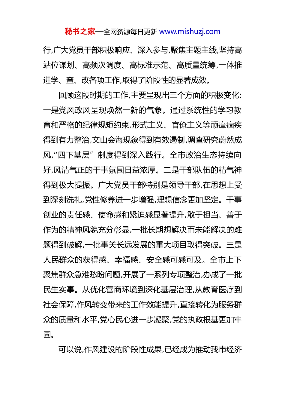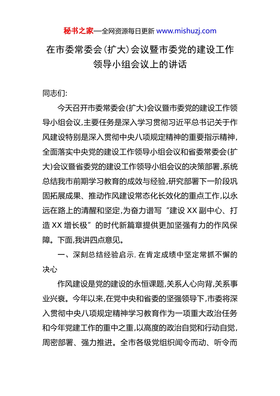 秘书之家—全网资源每日更新 www.mishuzj.com在市委常委会(扩大)会议暨市委党的建设工作领导小组会议上的讲话 同志们:今天召开市委常委会(扩大)会议暨市委党的建设工作领导小组会议,主要任务是深入学习贯彻习近平总书记关于作风建设特别是深入贯彻中央八项规定精神的重要指示精神,全面落实中央党的建设工作领导小组会议和省委常委会(扩大)会议暨省委党的建设工作领导小组会议的决策部署,系统总结我市前期学习教育的成效与经验,研究部署下一阶段巩固拓展成果、推动作风建设常态化长效化的重点工作,以永远在路上的清醒和坚定,为奋力谱写“建设 XX 副中心、打造 XX 增长极”的时代新篇章提供更加坚强有力的作风保障。下面,我讲四点意见。一、深刻总结经验启示,在肯定成绩中坚定常抓不懈的决心作风建设是党的建设的永恒课题,关系人心向背,关系事业兴衰。今年以来,在党中央和省委的坚强领导下,市委将深入贯彻中央八项规定精神学习教育作为一项重大政治任务和今年党建工作的重中之重,以高度的政治自觉和行动自觉,周密部署、强力推进。全市各级党组织闻令而动、听令而秘书之家—全网资源每日更新 www.mishuzj.com行,广大党员干部积极响应、深入参与,聚焦主题主线,坚持高站位谋划、高频次调度、高标准示范、高质量统筹,一体推进学、查、改各项工作,取得了阶段性的显著成效。回顾这段时期的工作,主要呈现出三个方面的积极变化:一是党风政风呈现焕然一新的气象。通过系统性的学习教育和严格的纪律规矩约束,形式主义、官僚主义等顽瘴痼疾得到有力整治,文山会海现象得到有效遏制,调查研究蔚然成风,“四下基层”制度得到深入践行。全市政治生态持续向好,风清气正的干事氛围日益浓厚。二是干部队伍的精气神得到极大提振。广大党员干部特别是领导干部,在思想上受到深刻洗礼,党性修养进一步增强,理想信念更加坚定。干事创业的责任感、使命感和紧迫感显著提升,敢于担当、善于作为的精神风貌充分彰显,一批长期想解决而未能解决的难题得到破解,一批事关长远发展的重大项目取得突破。三是人民群众的获得感、幸福感、安全感可感可及。全市上下聚焦群众急难愁盼问题,开展了一系列专项整治,办成了一批民生实事。从优化营商环境到深化基层治理,从教育医疗到社会保障,作风转变带来的工作效能提升,直接转化为服务群众的质量和水平,党心民心进一步凝聚,党的执政根基更加牢固。可以说,作风建设的阶段性成果,已经成为推动我市经济秘书之家—全网资源每日更新 www.mishuzj.com社会高质量发展的强大引擎,形成了作风建设与中心工作互促互进、相得益彰的良好局面。这些成绩的取得,根本在于以习近平同志为核心的党中央的坚强领导和习近平新时代中国特色社会主义思想的科学指引,是省委正确领导、悉心指导的结果,也是全市各级党组织和广大党员干部共同努力、不懈奋斗的结果。在充分肯定成绩的同时,更要清醒地认识到,作风问题具有极强的顽固性和反复性,犹如“逆水行舟,一篙松劲退千寻”。当前取得的成效只是初步的、阶段性的,基础尚不稳固。一些深层次问题仍未根除,一些隐形变异的“四风”问题时有发生,稍有松懈就可能反弹回潮、前功尽弃。习近平总书记的重要指示精神,为我们敲响了警钟,指明了方向。全市各级党组织和广大党员干部必须将思想和行动高度统一到总书记重要指示精神和党中央、省委的决策部署上来,深刻汲取此次学习教育给予我们的宝贵启示,切实增强持之以恒加强党的作风建设的高度自觉,始终保持“永远在路上”的坚韧与执着,以一抓到底的决心和毅力,把作风建设不断引向深入。二、准确把握形势要求,在清醒认识中增强常态长效的自觉党的十八大以来,以习近平同志为核心的党中央从制定秘书之家—全网资源每日更新 www.mishuzj.com和落实中央八项规定破题,持之以恒正风肃纪,开启了一场深刻的作风之变。进入新时代新征程,作风建设被赋予了新的时代内涵和更高的实践要求。我们必须胸怀“国之大者”,站在全局和战略的高度,深刻理解和把握作风建设的极端重要性。第一,深化作风建设是坚定拥护“两个确立”、坚决做到“两个维护”的政治检验。党的作风就是党的形象,关系到人心向背,关系到党的生死存亡。习近平总书...