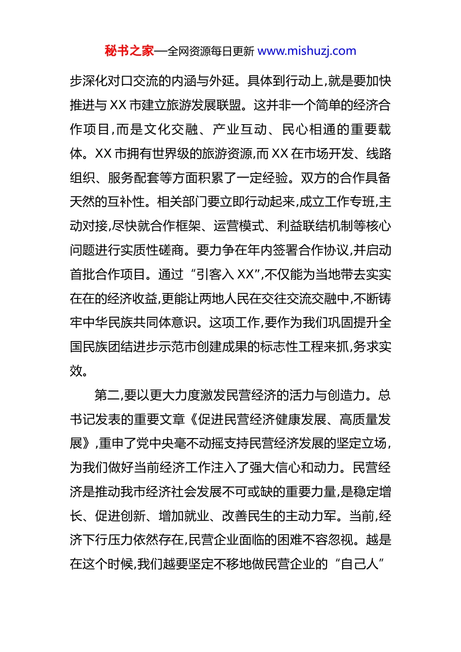 秘书之家—全网资源每日更新 www.mishuzj.com在市委常委会会议上的讲话 同志们:今天我们召开市委常委会会议,主要任务是传达学习总书记近期的重要讲话与重要文章精神,并结合我市实际,研究部署安全生产、“十五五”规划编制等几项事关全局和长远发展的重点工作。刚才,各位同志都发表了很好的意见。下面,我讲几点意见。一、深化思想引领,在服务国家战略全局中找准 XX 定位、展现 XX 作为思想是行动的先导。推动 XX 高质量发展,必须坚持用党的创新理论武装头脑、指导实践、推动工作,确保各项事业始终沿着正确方向前进。第一,要以更高站位服务和融入国家发展大局。总书记在听取 XX 自治区党委和政府工作汇报时的重要讲话,为我们进一步做好民族工作和对口支援工作提供了根本遵循。XX 的对口支援工作,不仅仅是经济任务,更是严肃的政治责任。这不仅关乎受援地区的发展稳定,也反映着我市的政治担当和发展水平。我们必须深刻认识到,服务国家战略,XX 不能缺位,也绝不能懈怠。当前,要将总书记提出的“改善民生、凝聚人心”作为工作的出发点和落脚点,进一秘书之家—全网资源每日更新 www.mishuzj.com步深化对口交流的内涵与外延。具体到行动上,就是要加快推进与 XX 市建立旅游发展联盟。这并非一个简单的经济合作项目,而是文化交融、产业互动、民心相通的重要载体。XX 市拥有世界级的旅游资源,而 XX 在市场开发、线路组织、服务配套等方面积累了一定经验。双方的合作具备天然的互补性。相关部门要立即行动起来,成立工作专班,主动对接,尽快就合作框架、运营模式、利益联结机制等核心问题进行实质性磋商。要力争在年内签署合作协议,并启动首批合作项目。通过“引客入 XX”,不仅能为当地带去实实在在的经济收益,更能让两地人民在交往交流交融中,不断铸牢中华民族共同体意识。这项工作,要作为我们巩固提升全国民族团结进步示范市创建成果的标志性工程来抓,务求实效。第二,要以更大力度激发民营经济的活力与创造力。总书记发表的重要文章《促进民营经济健康发展、高质量发展》,重申了党中央毫不动摇支持民营经济发展的坚定立场,为我们做好当前经济工作注入了强大信心和动力。民营经济是推动我市经济社会发展不可或缺的重要力量,是稳定增长、促进创新、增加就业、改善民生的主动力军。当前,经济下行压力依然存在,民营企业面临的困难不容忽视。越是在这个时候,我们越要坚定不移地做民营企业的“自己人”秘书之家—全网资源每日更新 www.mishuzj.com“贴心人”。支持民营经济,决不能停留在口号上,必须落实到具体行动中。首先,要在“促进公平”上下功夫。《中华人民共和国民营经济促进法》即将实施,这是法治保障的根本。全市各级各部门要组织专题学习,深刻领会其精神实质,并以此为契机,全面审视我们的现有政策和制度,坚决破除那些阻碍民营企业依法平等使用生产要素、公平参与市场竞争的“玻璃门”“旋转门”“弹簧门”。要确保所有企业,无论大小、无论所有制,都能在同一片蓝天下公平竞争。其次,要在“优化环境”上见真章。营商环境没有最好,只有更好。我们之前出台的优化营商环境“十条禁令”“十四条措施”,是向社会作出的庄严承诺,必须令行禁止,言出必行。要持续深化“放管服”改革,推动政务服务流程再造,提升“一网通办”效能,让数据多跑路、企业少跑腿。常态化开展的“送解优”行动要走深走实,不能满足于送政策上门,更要帮助企业解决融资、用工、用地等实际难题。构建亲清政商关系,关键在于“亲”而有度、“清”而有为。领导干部要坦荡真诚同民营企业家接触交往,主动靠前服务,真心实意为企业排忧解难,但同时必须守住底线、不越红线,做到交往有道、公私分明。二、聚焦中心任务,在凝聚社会发展合力中彰显巾帼担当、汇聚人民智慧秘书之家—全网资源每日更新 www.mishuzj.com妇女事业是党和人民事业的重要组成部分。在全面建设现代化新 XX 的征程中,必须充分发挥广大妇女“半边天”的重要作用。总书记关于妇女儿童和妇联工作的重要论述,深刻阐明了新时代妇女事业的地位作用和发展方向。全市各级妇联组织要牢记政治属性,坚持党建带妇建,将党的领导贯穿于妇联工作全过程、各方面。要...