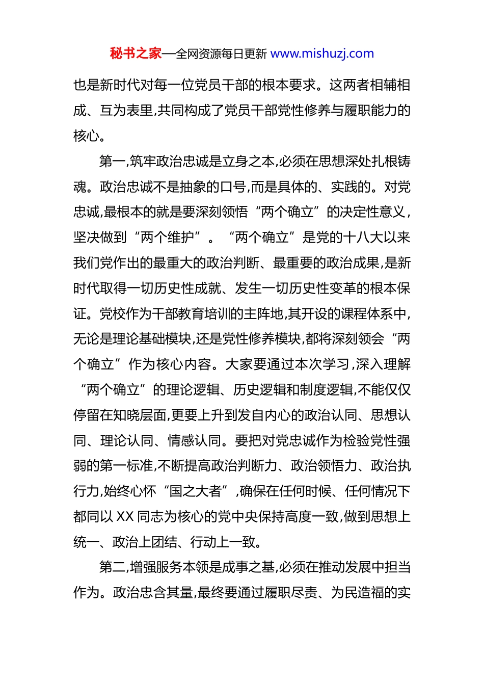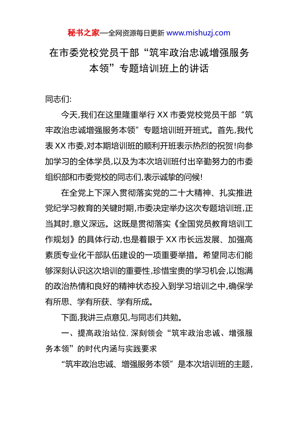 秘书之家—全网资源每日更新 www.mishuzj.com在市委党校党员干部“筑牢政治忠诚增强服务本领”专题培训班上的讲话 同志们:今天,我们在这里隆重举行 XX 市委党校党员干部“筑牢政治忠诚增强服务本领”专题培训班开班式。首先,我代表 XX 市委,对本期培训班的顺利开班表示热烈的祝贺!向参加学习的全体学员,以及为本次培训班付出辛勤努力的市委组织部和市委党校的同志们,表示诚挚的问候!在全党上下深入贯彻落实党的二十大精神、扎实推进党纪学习教育的关键时期,市委决定举办这次专题培训班,正当其时,意义深远。这既是贯彻落实《全国党员教育培训工作规划》的具体行动,也是着眼于 XX 市长远发展、加强高素质专业化干部队伍建设的一项重要举措。希望同志们能够深刻认识这次培训的重要性,珍惜宝贵的学习机会,以饱满的政治热情和良好的精神状态投入到学习培训之中,确保学有所思、学有所获、学有所成。下面,我讲三点意见,与同志们共勉。一、提高政治站位,深刻领会“筑牢政治忠诚、增强服务本领”的时代内涵与实践要求 “筑牢政治忠诚、增强服务本领”是本次培训班的主题,秘书之家—全网资源每日更新 www.mishuzj.com也是新时代对每一位党员干部的根本要求。这两者相辅相成、互为表里,共同构成了党员干部党性修养与履职能力的核心。第一,筑牢政治忠诚是立身之本,必须在思想深处扎根铸魂。政治忠诚不是抽象的口号,而是具体的、实践的。对党忠诚,最根本的就是要深刻领悟“两个确立”的决定性意义,坚决做到“两个维护”。“两个确立”是党的十八大以来我们党作出的最重大的政治判断、最重要的政治成果,是新时代取得一切历史性成就、发生一切历史性变革的根本保证。党校作为干部教育培训的主阵地,其开设的课程体系中,无论是理论基础模块,还是党性修养模块,都将深刻领会“两个确立”作为核心内容。大家要通过本次学习,深入理解“两个确立”的理论逻辑、历史逻辑和制度逻辑,不能仅仅停留在知晓层面,更要上升到发自内心的政治认同、思想认同、理论认同、情感认同。要把对党忠诚作为检验党性强弱的第一标准,不断提高政治判断力、政治领悟力、政治执行力,始终心怀“国之大者”,确保在任何时候、任何情况下都同以 XX 同志为核心的党中央保持高度一致,做到思想上统一、政治上团结、行动上一致。第二,增强服务本领是成事之基,必须在推动发展中担当作为。政治忠含其量,最终要通过履职尽责、为民造福的实秘书之家—全网资源每日更新 www.mishuzj.com际成效来检验。当前,XX 市正处在转型升级、跨越发展的关键阶段。今年上半年,面对复杂严峻的外部环境和艰巨繁重的改革发展稳定任务,全市上下共同努力,经济社会发展保持了稳中有进、进中提质的良好态势。初步核算,上半年全市地区生产总值(GDP)同比增长 5.2%,规模以上工业增加值增长 5.8%,固定资产投资增长 6.1%,社会消费品零售总额、城乡居民人均可支配收入等主要指标均实现了平稳增长。这些成绩来之不易,凝聚了全市人民的智慧和汗水。但同时,我们也必须清醒地看到,我市发展不平衡不充分的问题依然突出,产业结构优化升级的任务还很重,科技创新驱动能力有待加强,民生领域还有不少短板。面对新形势新任务,我们的一些干部还存在“本领恐慌”。有的对新发展理念理解不深不透,推动高质量发展的思路不宽、办法不多;有的不善于运用法治思维和法治方式深化改革、化解矛盾;有的抓项目、跑招商、优服务的专业能力不足。这些问题如果不能及时解决,必将制约 XX 市的高质量发展。因此,这次培训专门设置了宏观经济形势分析、机关公文写作、教学科研等课程,就是要引导大家聚焦全市中心工作,围绕产业链招商、重大项目建设、乡村全面振兴、城市功能品质提升、民生福祉改善等重点领域,干什么学什么、缺什么补什么,切实把学习成果转化为谋划发展秘书之家—全网资源每日更新 www.mishuzj.com的正确思路、促进发展的政策举措、领导发展的实际能力。二、坚持知行合一,聚焦学习培训的核心任务,务求取得扎实成效党校是锤炼党性的“大熔炉”,也是补充知识、提升能力的“加油站”。同志们要端正学习态度,全身心投入,力争通过这次系统学习,实现理论素养和履职能力的双...