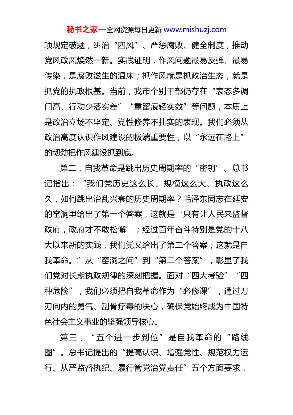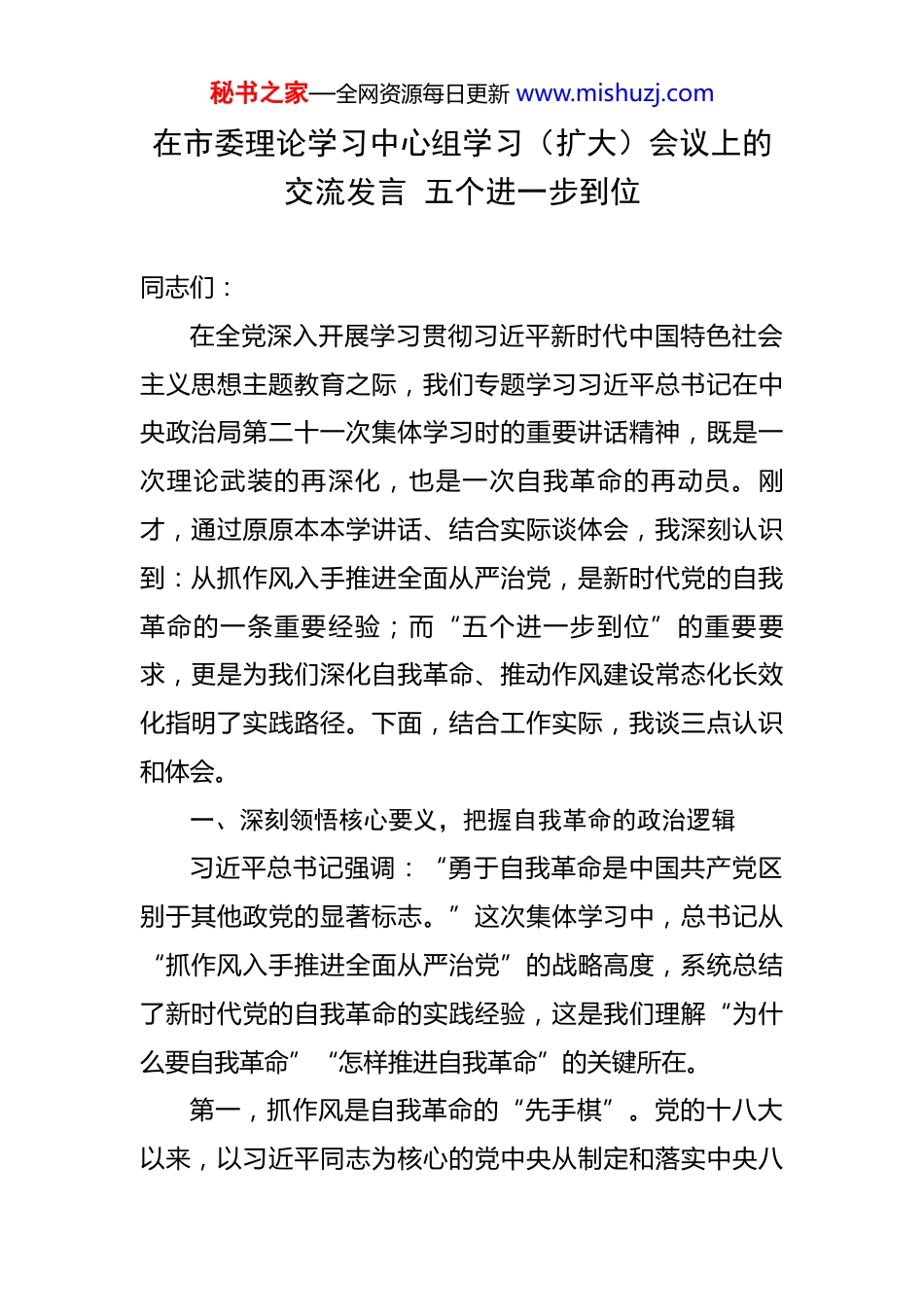 秘书之家—全网资源每日更新 www.mishuzj.com在市委理论学习中心组学习(扩大)会议上的交流发言 五个进一步到位同志们:在全党深入开展学习贯彻习近平新时代中国特色社会主义思想主题教育之际,我们专题学习习近平总书记在中央政治局第二十一次集体学习时的重要讲话精神,既是一次理论武装的再深化,也是一次自我革命的再动员。刚才,通过原原本本学讲话、结合实际谈体会,我深刻认识到:从抓作风入手推进全面从严治党,是新时代党的自我革命的一条重要经验;而“五个进一步到位”的重要要求,更是为我们深化自我革命、推动作风建设常态化长效化指明了实践路径。下面,结合工作实际,我谈三点认识和体会。一、深刻领悟核心要义,把握自我革命的政治逻辑习近平总书记强调:“勇于自我革命是中国共产党区别于其他政党的显著标志。”这次集体学习中,总书记从“抓作风入手推进全面从严治党”的战略高度,系统总结了新时代党的自我革命的实践经验,这是我们理解“为什么要自我革命”“怎样推进自我革命”的关键所在。第一,抓作风是自我革命的“先手棋”。党的十八大以来,以习近平同志为核心的党中央从制定和落实中央八秘书之家—全网资源每日更新 www.mishuzj.com项规定破题,纠治“四风”、严惩腐败、健全制度,推动党风政风焕然一新。实践证明,作风问题最易反弹、最易传染,是腐败滋生的温床;抓作风就是抓政治生态,就是抓党的执政根基。当前,我市个别干部仍存在“表态多调门高、行动少落实差”“重留痕轻实效”等问题,本质上是政治立场不坚定、党性修养不扎实的表现。我们必须从政治高度认识作风建设的极端重要性,以“永远在路上”的韧劲把作风建设抓到底。第二,自我革命是跳出历史周期率的“密钥”。总书记指出:“我们党历史这么长、规模这么大、执政这么久,如何跳出治乱兴衰的历史周期率?毛泽东同志在延安的窑洞里给出了第一个答案,这就是‘只有让人民来监督政府,政府才不敢松懈’;经过百年奋斗特别是党的十八大以来新的实践,我们党又给出了第二个答案,这就是自我革命。”从“窑洞之问”到“第二个答案”,彰显了我们党对长期执政规律的深刻把握。面对“四大考验”“四种危险”,我们必须把自我革命作为“必修课”,通过刀刃向内的勇气、刮骨疗毒的决心,确保党始终成为中国特色社会主义事业的坚强领导核心。第三,“五个进一步到位”是自我革命的“路 线图”。总书记提出的“提高认识、增强党性、规范权力运行、从严监督执纪、履行管党治党责任”五个方面要求,秘书之家—全网资源每日更新 www.mishuzj.com既抓住了思想建党的“根”,又紧扣制度治党的“纲”,是对新时代全面从严治党规律的系统总结。比如,“提高认识”解决的是“不想腐”的思想自觉问题,“规范权力运行”解决的是“不能腐”的制度约束问题,“从严监督执纪”解决的是“不敢腐”的震慑问题。这五个方面环环相扣、互为支撑,必须一体推进、全面落实。二、对标“五个进一步到位”,找准作风建设的实践路径推进党的自我革命,关键要把“五个进一步到位”要求转化为具体行动,在补短板、强弱项中完善作风建设常态化长效化机制。结合我市实际,重点要在以下五方面下功夫:一是在“提高认识”上深化,筑牢思想防线。思想松一寸,行动散一尺。要把习近平总书记关于党的自我革命的重要论述作为主题教育的“必学课”,通过专题研讨、案例教学、红色教育等方式,引导党员干部深刻认识“作风问题本质是党性问题”“腐败是党长期执政的最大威胁”等重大判断,切实增强“不想腐”的政治自觉。特别是要结合我市近年来查处的“酒桌文化”“圈子文化”典型案例,开展“以案说纪、以案说法”警示教育,让党员干部从思想深处树牢“红线意识”。二是在“增强党性”上用力,锤炼政治品格。党性是秘书之家—全网资源每日更新 www.mishuzj.com党员干部立身、立业、立言、立德的基石。要把党性修养作为终身课题,通过“三会一课”、民主生活会、组织生活会等载体,引导党员干部对照党章党规、对照先进典型,深入查摆“政治站位不高、宗旨意识淡化、担当精神不足”等问题,切实把“两个维护”体现在贯彻党中央决...