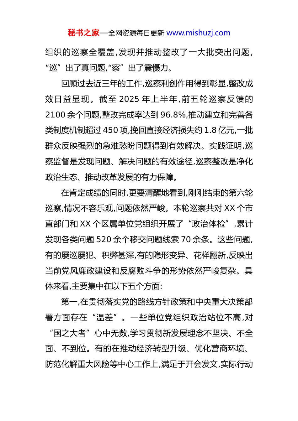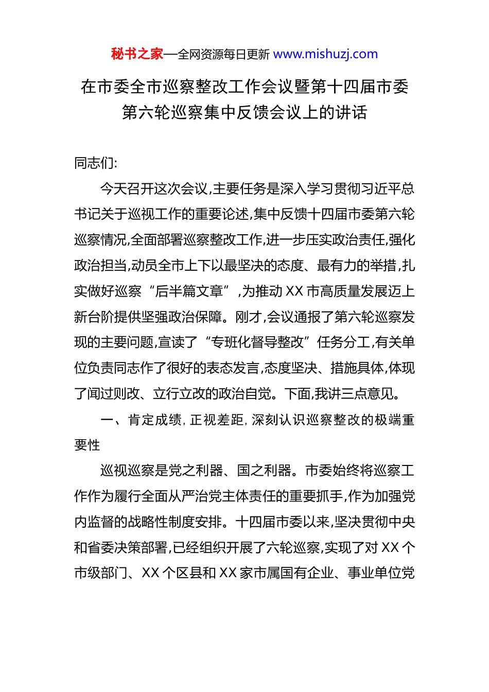 秘书之家—全网资源每日更新 www.mishuzj.com在市委全市巡察整改工作会议暨第十四届市委第六轮巡察集中反馈会议上的讲话 同志们:今天召开这次会议,主要任务是深入学习贯彻习近平总书记关于巡视工作的重要论述,集中反馈十四届市委第六轮巡察情况,全面部署巡察整改工作,进一步压实政治责任,强化政治担当,动员全市上下以最坚决的态度、最有力的举措,扎实做好巡察“后半篇文章”,为推动 XX 市高质量发展迈上新台阶提供坚强政治保障。刚才,会议通报了第六轮巡察发现的主要问题,宣读了“专班化督导整改”任务分工,有关单位负责同志作了很好的表态发言,态度坚决、措施具体,体现了闻过则改、立行立改的政治自觉。下面,我讲三点意见。一、肯定成绩,正视差距,深刻认识巡察整改的极端重要性巡视巡察是党之利器、国之利器。市委始终将巡察工作作为履行全面从严治党主体责任的重要抓手,作为加强党内监督的战略性制度安排。十四届市委以来,坚决贯彻中央和省委决策部署,已经组织开展了六轮巡察,实现了对 XX 个市级部门、XX 个区县和 XX 家市属国有企业、事业单位党秘书之家—全网资源每日更新 www.mishuzj.com组织的巡察全覆盖,发现并推动整改了一大批突出问题,“巡”出了真问题,“察”出了震慑力。回顾过去近三年的工作,巡察利剑作用得到彰显,整改成效日益显现。截至 2025 年上半年,前五轮巡察反馈的2100 余个问题,整改完成率达到 96.8%,推动建立和完善各类制度机制超过 450 项,挽回直接经济损失约 1.8 亿元,一批群众反映强烈的急难愁盼问题得到有效解决。实践证明,巡察监督是发现问题、解决问题的有效途径,巡察整改是净化政治生态、推动改革发展的有力保障。在肯定成绩的同时,更要清醒地看到,刚刚结束的第六轮巡察,情况不容乐观,问题依然严峻。本轮巡察共对 XX 个市直部门和 XX 个区属单位党组织开展了“政治体检”,累计发现各类问题 520 余个移交问题线索 70 余条。这些问题,有的屡巡屡犯、积弊甚深,有的隐形变异、花样翻新,反映出当前党风廉政建设和反腐败斗争的形势依然严峻复杂。具体来看,主要集中在以下五个方面:第一,在贯彻落实党的路线方针政策和中央重大决策部署方面存在“温差”。一些单位党组织政治站位不高,对“国之大者”心中无数,学习贯彻新发展理念不坚决、不全面、不到位。有的在推动经济转型升级、优化营商环境、防范化解重大风险等中心工作上,满足于开会发文,实际行动秘书之家—全网资源每日更新 www.mishuzj.com迟缓、效果不彰。有的单位对中央环保督察反馈问题整改不力,存在敷衍整改、表面整改现象,生态环境领域的短板依然突出。这些问题的根源在于政治意识不强、政治担当缺失,未能将“两个维护”真正体现在履职尽责的实际行动中。第二,在落实全面从严治党主体责任和监督责任方面存在“落差”。一些党组织管党治党失之于宽、失之于软,主体责任这根“弦”绷得不紧,“一岗双责”落得不实。党委(党组)书记作为第一责任人,对党风廉政建设工作研究部署多、跟踪问效少,压力传导层层递减。纪检监察机构监督执纪问责力度不够,对苗头性、倾向性问题抓早抓小不够,日常监督存在盲区。在工程建设、政府采购、国有资产管理等重点领域和关键环节,廉洁风险依然较高,违规操作、利益输送问题时有发生。第三,在践行以人民为中心的发展思想方面存在“偏差”。一些单位宗旨意识淡薄,漠视群众利益,形式主义、官僚主义问题顽固存在。有的窗口单位服务意识不强、办事效率不高,让群众和企业“多头跑、来回跑”。有的在民生领域投入不足,教育、医疗、养老等公共服务体系仍有短板,群众的获得感、幸福感、安全感有待提升。有的对群众信秘书之家—全网资源每日更新 www.mishuzj.com访反映的突出问题,推诿扯皮、久拖不决,小问题拖成大矛盾。第四,在落实新时代党的组织路线方面存在“温差”。一些党组织党建主业意识不强,存在重业务、轻党建的倾向,基层党组织建设薄弱。党内政治生活不严肃、不规范,“三会一课”制度执行不到位。选人用人视野不宽、程序不严,干部队伍结构不优、活力不足,存在论资排辈、迁就照顾现象。有的单位对干部日常教育管理监督失之于宽,干部不担当、不作...