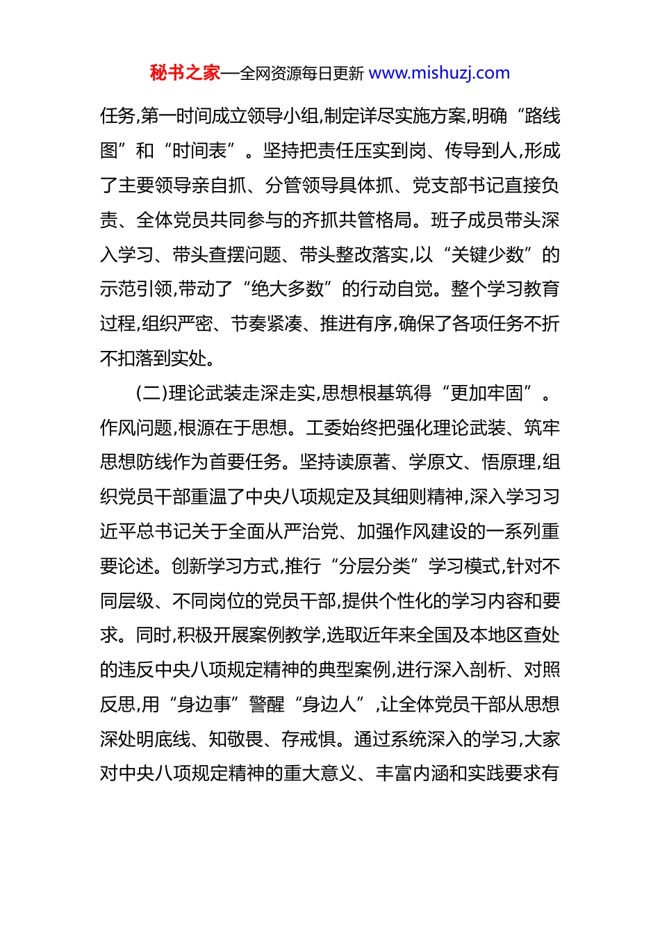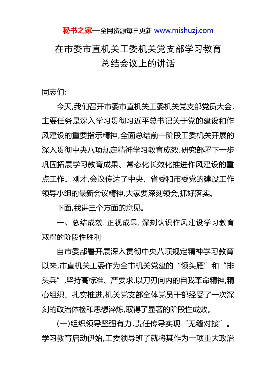 秘书之家—全网资源每日更新 www.mishuzj.com在市委市直机关工委机关党支部学习教育总结会议上的讲话 同志们:今天,我们召开市委市直机关工委机关党支部党员大会,主要任务是深入学习贯彻习近平总书记关于党的建设和作风建设的重要指示精神,全面总结前一阶段工委机关开展的深入贯彻中央八项规定精神学习教育成效,研究部署下一步巩固拓展学习教育成果、常态化长效化推进作风建设的重点工作。刚才,会议传达了中央、省委和市委党的建设工作领导小组的最新会议精神,大家要深刻领会,抓好落实。下面,我讲三个方面的意见。一、总结成效,正视成果,深刻认识作风建设学习教育取得的阶段性胜利自市委部署开展深入贯彻中央八项规定精神学习教育以来,市直机关工委作为全市机关党建的“领头雁”和“排头兵”,坚持高标准、严要求,以刀刃向内的自我革命精神,精心组织、扎实推进,机关党支部全体党员干部经受了一次深刻的政治体检和思想淬炼,取得了显著的阶段性成效。(一)组织领导坚强有力,责任传导实现“无缝对接”。学习教育启动伊始,工委领导班子就将其作为一项重大政治秘书之家—全网资源每日更新 www.mishuzj.com任务,第一时间成立领导小组,制定详尽实施方案,明确“路线图”和“时间表”。坚持把责任压实到岗、传导到人,形成了主要领导亲自抓、分管领导具体抓、党支部书记直接负责、全体党员共同参与的齐抓共管格局。班子成员带头深入学习、带头查摆问题、带头整改落实,以“关键少数”的示范引领,带动了“绝大多数”的行动自觉。整个学习教育过程,组织严密、节奏紧凑、推进有序,确保了各项任务不折不扣落到实处。(二)理论武装走深走实,思想根基筑得“更加牢固”。作风问题,根源在于思想。工委始终把强化理论武装、筑牢思想防线作为首要任务。坚持读原著、学原文、悟原理,组织党员干部重温了中央八项规定及其细则精神,深入学习习近平总书记关于全面从严治党、加强作风建设的一系列重要论述。创新学习方式,推行“分层分类”学习模式,针对不同层级、不同岗位的党员干部,提供个性化的学习内容和要求。同时,积极开展案例教学,选取近年来全国及本地区查处的违反中央八项规定精神的典型案例,进行深入剖析、对照反思,用“身边事”警醒“身边人”,让全体党员干部从思想深处明底线、知敬畏、存戒惧。通过系统深入的学习,大家对中央八项规定精神的重大意义、丰富内涵和实践要求有秘书之家—全网资源每日更新 www.mishuzj.com了更全面的理解,落实规定的思想自觉和行动自觉得到显著增强。(三)问题查摆动真碰硬,政治体检进行“全面扫描”。工委坚持问题导向,发扬斗争精神,组织全体党员干部以“学查改”为抓手,深入开展问题查摆。通过自己找、群众提、集体议、上级点等多种方式,广泛征求意见建议。每位党员干部都对照党章党规,对照中央八项规定精神,对照群众期盼,深入检视自身在思想、工作、生活、作风等方面存在的差距和不足。查摆出的问题不遮掩、不回避,形成了详实的问题清单和整改台账。据统计,学习教育期间,机关党支部共梳理查摆出涉及形式主义、官僚主义等方面的具体问题 58个,制定整改措施 90 余条,明确了整改时限和责任人。这种动真碰硬的自我剖析,让党员干部经历了一场深刻的“政治淋浴”,思想上的灰尘得到有效清洗。(四)整改整治务求实效,作风顽疾得到“精准祛除”。针对查摆出的问题,工委坚持“当下改”与“长久立”相结合,以钉钉子精神抓好整改落实。对能够立即解决的问题,立行立改;对需要持续整治的,明确阶段性目标,紧盯不放,一抓到底。聚力集中整治,重点纠治了文山会海、过度留痕、检查考核过多过滥等形式主义、官僚主义突出问题。例如,今年以来,工委机关发文数量同比减少 18%,会议数量同比减秘书之家—全网资源每日更新 www.mishuzj.com少 22%,切实为基层松了绑、减了负。在整治享乐主义、奢靡之风方面,严格执行财经纪律,上半年“三公”经费支出同比锐减 15.8%。通过靶向治疗、精准发力,一批长期存在的作风顽疾得到有效遏制,机关风气为之一新。(五)制度建设同步推进,长效机制构建“初见雏形”。作风建设非一日之功,必须依靠制度管长远。在抓好学习教育和整改整治的同时,工委同步推进制...