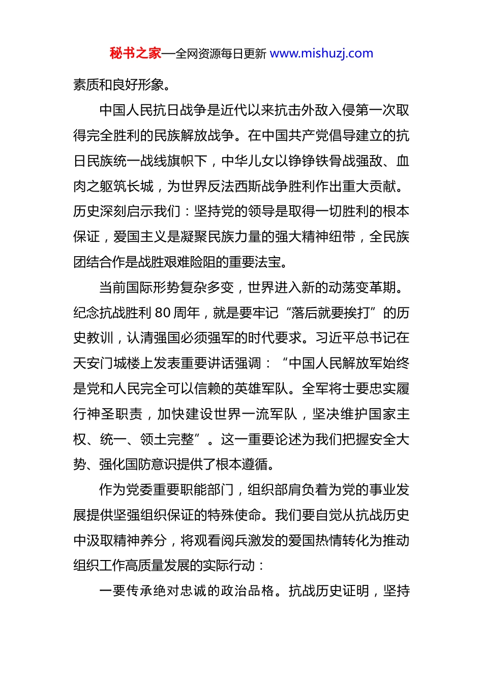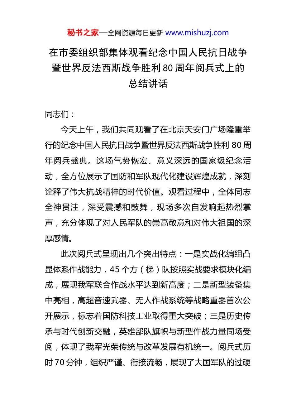秘书之家—全网资源每日更新 www.mishuzj.com在市委组织部集体观看纪念中国人民抗日战争暨世界反法西斯战争胜利 80 周年阅兵式上的总结讲话 同志们:今天上午,我们共同观看了在北京天安门广场隆重举行的纪念中国人民抗日战争暨世界反法西斯战争胜利 80 周年阅兵盛典。这场气势恢宏、意义深远的国家级纪念活动,全方位展示了国防和军队现代化建设辉煌成就,深刻诠释了伟大抗战精神的时代价值。观看过程中,全体同志全神贯注,深受震撼和鼓舞,现场多次自发响起热烈掌声,充分体现了对人民军队的崇高敬意和对伟大祖国的深厚感情。此次阅兵式呈现出几个突出特点:一是实战化编组凸显体系作战能力,45 个方(梯)队按照实战要求模块化编成,展现我军联合作战水平达到新高度;二是新型装备集中亮相,高超音速武器、无人作战系统等战略重器首次公开展示,标志着国防科技工业取得重大突破;三是历史传承与时代创新交融,英雄部队旗帜与新型作战力量同场受阅,体现了我军光荣传统与改革发展有机统一。阅兵式历时 70 分钟,组织严谨、衔接流畅,展现了大国军队的过硬秘书之家—全网资源每日更新 www.mishuzj.com素质和良好形象。中国人民抗日战争是近代以来抗击外敌入侵第一次取得完全胜利的民族解放战争。在中国共产党倡导建立的抗日民族统一战线旗帜下,中华儿女以铮铮铁骨战强敌、血肉之躯筑长城,为世界反法西斯战争胜利作出重大贡献。历史深刻启示我们:坚持党的领导是取得一切胜利的根本保证,爱国主义是凝聚民族力量的强大精神纽带,全民族团结合作是战胜艰难险阻的重要法宝。当前国际形势复杂多变,世界进入新的动荡变革期。纪念抗战胜利 80 周年,就是要牢记“落后就要挨打”的历史教训,认清强国必须强军的时代要求。习近平总书记在天安门城楼上发表重要讲话强调:“中国人民解放军始终是党和人民完全可以信赖的英雄军队。全军将士要忠实履行神圣职责,加快建设世界一流军队,坚决维护国家主权、统一、领土完整”。这一重要论述为我们把握安全大势、强化国防意识提供了根本遵循。作为党委重要职能部门,组织部肩负着为党的事业发展提供坚强组织保证的特殊使命。我们要自觉从抗战历史中汲取精神养分,将观看阅兵激发的爱国热情转化为推动组织工作高质量发展的实际行动:一要传承绝对忠诚的政治品格。抗战历史证明,坚持秘书之家—全网资源每日更新 www.mishuzj.com党的领导是我们战胜一切困难的根本保证。要深入学习贯彻习近平新时代中国特色社会主义思想,教育引导各级党员干部深刻领悟“两个确立”的决定性意义,增强“四个意识”、坚定“四个自信”、做到“两个维护”。当前要重点抓好党的创新理论武装工作,分级分类开展党员干部教育培训,确保党的路线方针政策在 XX 得到不折不扣贯彻执行。二要强化担当作为的使命意识。抗战胜利是全体中华儿女勠力同心、奋勇拼搏的结果。要牢固树立重实干、重实绩的用人导向,健全干部担当作为激励和保护机制,大力选拔使用在改革开放前沿、重大任务一线表现突出的干部。去年以来,全市共培训各级干部 XX 万人次,轮训基层党组织书记 XX 人次,下一步要进一步完善干部考核评价体系,推动能者上、优者奖、庸者下、劣者汰成为常态。三要夯实坚强有力的组织体系。抗战时期党的组织体系发挥了中流砥柱作用。要坚持大抓基层的鲜明导向,持续推进基层党组织标准化规范化建设,着力提升政治功能和组织功能。截至目前,全市基层党组织总数达 XX 个,非公企业和社会组织党组织覆盖率分别提升至 XX%和 XX%。要深入开展“五星”支部创建,整顿软弱涣散基层党组织,推动基层党建与乡村振兴、基层治理等中心工作深度秘书之家—全网资源每日更新 www.mishuzj.com融合。四要凝聚爱国奉献的人才力量。抗战胜利离不开各方面人才的聪明才智。要深入实施人才强市战略,完善人才引进、培养、使用、评价机制,去年引进高层次人才 XX名,建成院士工作站 XX 个。要进一步加强政治引领和政治吸纳,引导广大人才弘扬爱国奋斗精神,建功立业新时代,为推进中国式现代化建设 XX 实践提供智力支持。同志们,历史的接力棒已经传到我们手中。...