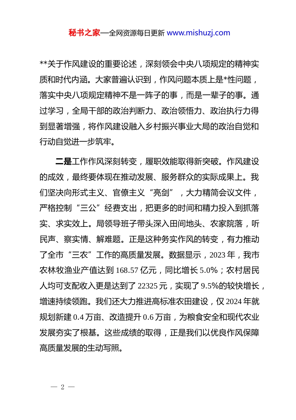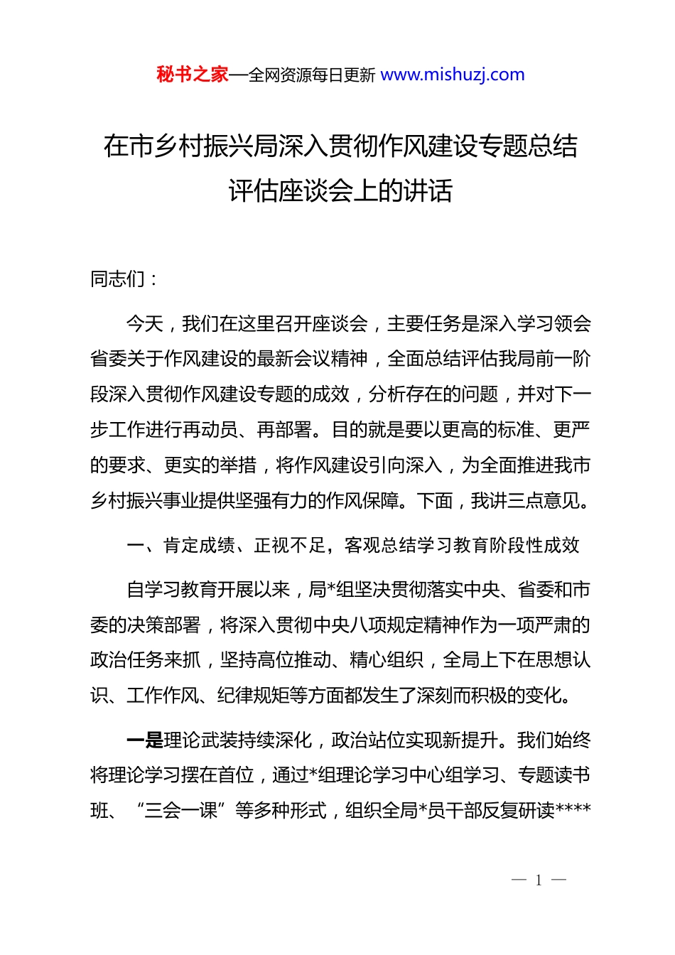 秘书之家—全网资源每日更新 www.mishuzj.com在市乡村振兴局深入贯彻作风建设专题总结评估座谈会上的讲话同志们:今天,我们在这里召开座谈会,主要任务是深入学习领会省委关于作风建设的最新会议精神,全面总结评估我局前一阶段深入贯彻作风建设专题的成效,分析存在的问题,并对下一步工作进行再动员、再部署。目的就是要以更高的标准、更严的要求、更实的举措,将作风建设引向深入,为全面推进我市乡村振兴事业提供坚强有力的作风保障。下面,我讲三点意见。一、肯定成绩、正视不足,客观总结学习教育阶段性成效自学习教育开展以来,局*组坚决贯彻落实中央、省委和市委的决策部署,将深入贯彻中央八项规定精神作为一项严肃的政治任务来抓,坚持高位推动、精心组织,全局上下在思想认识、工作作风、纪律规矩等方面都发生了深刻而积极的变化。一是理论武装持续深化,政治站位实现新提升。我们始终将理论学习摆在首位,通过*组理论学习中心组学习、专题读书班、“三会一课”等多种形式,组织全局*员干部反复研读****— 1 —秘书之家—全网资源每日更新 www.mishuzj.com**关于作风建设的重要论述,深刻领会中央八项规定的精神实质和时代内涵。大家普遍认识到,作风问题本质上是*性问题,落实中央八项规定精神不是一阵子的事,而是一辈子的事。通过学习,全局干部的政治判断力、政治领悟力、政治执行力得到显著增强,将作风建设融入乡村振兴事业大局的政治自觉和行动自觉进一步筑牢。二是工作作风深刻转变,履职效能取得新突破。作风建设的成效,最终要体现在推动发展、服务群众的实际成果上。我们坚决向形式主义、官僚主义“亮剑”,大力精简会议文件,严格控制“三公”经费支出,把更多的时间和精力投入到抓落实、求实效上。局领导班子带头深入田间地头、农家院落,听民声、察实情、解难题。正是这种务实作风的转变,有力推动了全市“三农”工作的高质量发展。数据显示,2023 年,我市农林牧渔业产值达到 168.57 亿元,同比增长 5.0%;农村居民人均可支配收入更是达到了 22325 元,实现了 9.5%的较快增长,增速持续领跑。我们还大力推进高标准农田建设,仅 2024 年就规划新建 0.4 万亩、改造提升 0.6 万亩,为粮食安全和现代农业发展夯实了根基。这些成绩的取得,正是我们以优良作风保障高质量发展的生动写照。— 2 —秘书之家—全网资源每日更新 www.mishuzj.com三是制度笼子不断扎紧,纪律防线构筑新屏障。我们坚持标本兼治,把“当下改”与“长久立”结合起来。针对巡察反馈、内部自查中发现的薄弱环节,我们全面梳理和修订了财务管理、公务接待、项目审批、因公出差等一系列内部规章制度,让制度“长牙”、纪律“带电”。我们还强化了日常监督和执纪问责,运用好监督执纪“第一种形态”,对苗头性、倾向性问题及时提醒、咬耳扯袖,让红脸出汗成为常态。通过制度的刚性约束和严格的监督执纪,全局干部纪律意识和规矩意识显著增强,“不敢腐、不能腐、不想腐”的思想堤坝日益牢固。在肯定成绩的同时,我们必须清醒地认识到,与新时代新征程对干部作风提出的更高要求相比,与人民群众对美好生活的新期待相比,我们的工作还存在一些不容忽视的差距和问题。一是个别干部的思想认识仍有偏差。有的人存在“闯关”思想,认为学习教育告一段落就可以松口气、歇歇脚,对作风建设的长期性、复杂性、艰巨性认识不足。二是形式主义、官僚主义问题仍未根除。文山会海现象虽有改观,但在一些领域仍有反弹回潮的风险;有的工作看似落实了,但穿透力不强,政策的“最后一公里”仍有堵点。三是服务群众的精准性和主动性仍需加强。在解决群众“急难愁盼”问题上,有时还停留在被动— 3 —秘书之家—全网资源每日更新 www.mishuzj.com受理层面,主动下沉、靠前服务、未诉先办的意识和能力还有待提升。对于项目实施过程中群众反映的一些具体困难,我们的响应和解决机制还不够高效。四是干事创业的精气神仍需提振。少数干部存在“躺平”心态,面对乡村振兴的复杂任务和艰巨挑战,存在畏难情绪,缺乏攻坚克难的锐气和开拓创新的勇气。这些问题,我们必须高度重视,以刀刃向内的...