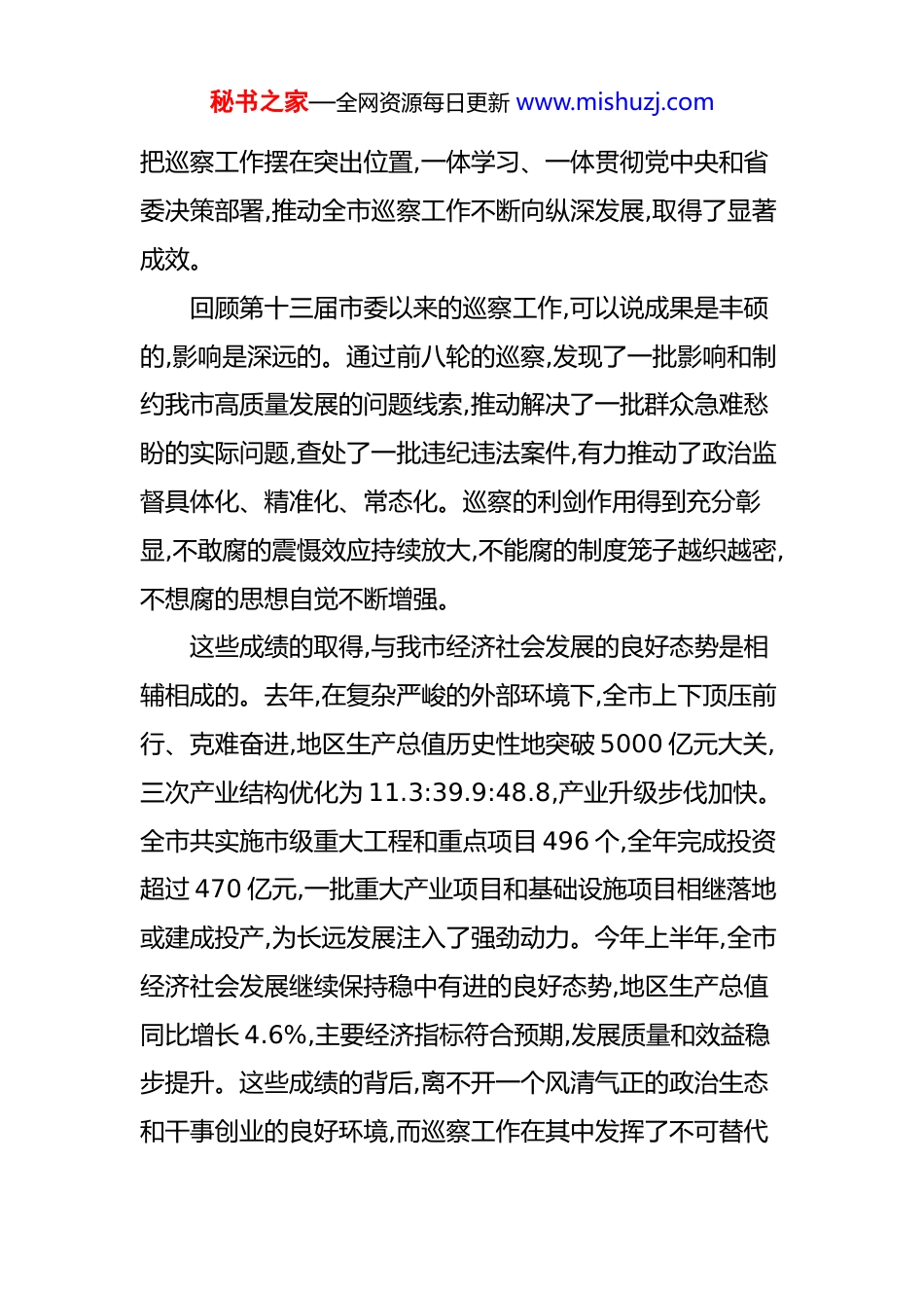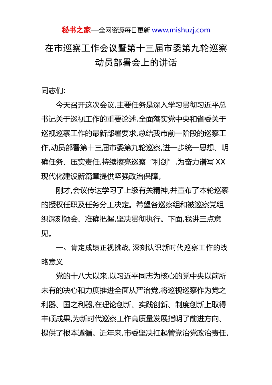 秘书之家—全网资源每日更新 www.mishuzj.com在市巡察工作会议暨第十三届市委第九轮巡察动员部署会上的讲话 同志们:今天召开这次会议,主要任务是深入学习贯彻习近平总书记关于巡视工作的重要论述,全面落实党中央和省委关于巡视巡察工作的最新部署要求,总结我市前一阶段的巡察工作,动员部署第十三届市委第九轮巡察,进一步统一思想、明确任务、压实责任,持续擦亮巡察“利剑”,为奋力谱写 XX现代化建设新篇章提供坚强政治保障。刚才,会议传达学习了上级有关精神,并宣布了本轮巡察的授权任职及任务分工决定。希望各巡察组和被巡察党组织深刻领会、准确把握,坚决贯彻执行。下面,我讲三点意见。一、肯定成绩正视挑战,深刻认识新时代巡察工作的战略意义党的十八大以来,以习近平同志为核心的党中央以前所未有的决心和力度推进全面从严治党,将巡视巡察作为党之利器、国之利器,在理论创新、实践创新、制度创新上取得丰硕成果,为新时代巡察工作高质量发展指明了前进方向、提供了根本遵循。近年来,市委坚决扛起管党治党政治责任,秘书之家—全网资源每日更新 www.mishuzj.com把巡察工作摆在突出位置,一体学习、一体贯彻党中央和省委决策部署,推动全市巡察工作不断向纵深发展,取得了显著成效。回顾第十三届市委以来的巡察工作,可以说成果是丰硕的,影响是深远的。通过前八轮的巡察,发现了一批影响和制约我市高质量发展的问题线索,推动解决了一批群众急难愁盼的实际问题,查处了一批违纪违法案件,有力推动了政治监督具体化、精准化、常态化。巡察的利剑作用得到充分彰显,不敢腐的震慑效应持续放大,不能腐的制度笼子越织越密,不想腐的思想自觉不断增强。这些成绩的取得,与我市经济社会发展的良好态势是相辅相成的。去年,在复杂严峻的外部环境下,全市上下顶压前行、克难奋进,地区生产总值历史性地突破 5000 亿元大关,三次产业结构优化为 11.3:39.9:48.8,产业升级步伐加快。全市共实施市级重大工程和重点项目 496 个,全年完成投资超过 470 亿元,一批重大产业项目和基础设施项目相继落地或建成投产,为长远发展注入了强劲动力。今年上半年,全市经济社会发展继续保持稳中有进的良好态势,地区生产总值同比增长 4.6%,主要经济指标符合预期,发展质量和效益稳步提升。这些成绩的背后,离不开一个风清气正的政治生态和干事创业的良好环境,而巡察工作在其中发挥了不可替代秘书之家—全网资源每日更新 www.mishuzj.com的净化器和助推器作用。党风廉政建设社会评价指数逐年稳步上升,纪检监察机关接收的信访举报数量连续三年呈下降趋势,这些数据都从侧面印证了巡察监督的成效。在肯定成绩的同时,必须清醒地认识到,我市全面从严治党和反腐败斗争的形势依然严峻复杂,一些深层次、顽固性问题尚未得到根本解决。从前几轮巡察和日常监督执纪情况看,一些问题仍需高度警惕:一是政治站位不高的问题依然存在。有的单位党组织贯彻落实党中央决策部署和省委、市委工作要求不够坚决,满足于“传达了、学习了”,但在结合实际、创造性转化上办法不多、效果不彰。二是权力运行不规范的问题时有发生。在工程建设、土地出让、国资国企、公共资源交易等重点领域,廉洁风险依然较高,违规插手干预、利益输送等问题禁而未绝。三是形式主义、官僚主义问题具有顽固性。有的干部担当精神不足,“躺平”思想抬头,对群众诉求推诿扯皮、敷衍塞责;有的地方和部门在优化营商环境、服务市场主体上仍然存在“中梗阻”现象。四是“微腐败”问题在基层易发多发。一些基层干部利用手中职权吃拿卡要、优亲厚友,损害群众切身利益,侵蚀党的执政根基。特别需要警惕的是,个别领域还存在数据造假、虚报浮夸的现象,这不仅是作风问题,更是严重的政治不诚信问题,必须露头就打、严惩不贷。秘书之家—全网资源每日更新 www.mishuzj.com当前,XX 正处在转型升级、跨越发展的关键时期。越是任务艰巨、挑战严峻,越要发挥巡察的监督保障执行、促进完善发展作用。全市各级党组织和广大党员干部必须从战略和全局的高度,深刻认识深化政治巡察的极端重要性,自觉把思想和行动统一到市委的决策部署上来,以永远在路上的坚韧和执着,推动全面从严治党向纵深发展,为 X...