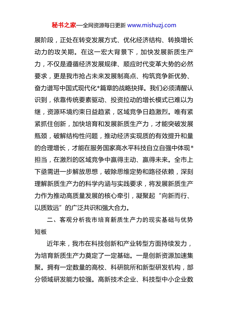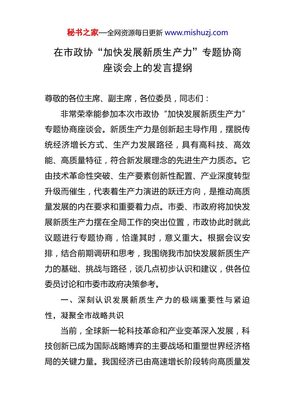 秘书之家—全网资源每日更新 www.mishuzj.com在市政协“加快发展新质生产力”专题协商座谈会上的发言提纲 尊敬的各位主席、副主席,各位委员,同志们:非常荣幸能参加本次市政协“加快发展新质生产力”专题协商座谈会。新质生产力是创新起主导作用,摆脱传统经济增长方式、生产力发展路径,具有高科技、高效能、高质量特征,符合新发展理念的先进生产力质态。它由技术革命性突破、生产要素创新性配置、产业深度转型升级而催生,代表着生产力演进的跃迁方向,是推动高质量发展的内在要求和重要着力点。市委、市政府将加快发展新质生产力摆在全局工作的突出位置,市政协此时就此议题进行专题协商,恰逢其时,意义重大。根据会议安排,结合前期调研和思考,我围绕我市加快发展新质生产力的基础、挑战与路径,谈几点初步认识和建议,供各位委员讨论和市委市政府决策参考。一、深刻认识发展新质生产力的极端重要性与紧迫性,凝聚全市战略共识当前,全球新一轮科技革命和产业变革深入发展,科技创新已成为国际战略博弈的主要战场和重塑世界经济格局的关键力量。我国经济已由高速增长阶段转向高质量发秘书之家—全网资源每日更新 www.mishuzj.com展阶段,正处在转变发展方式、优化经济结构、转换增长动力的攻关期。在这一宏大背景下,加快发展新质生产力,不仅是遵循经济发展规律、顺应时代变革大势的必然要求,更是我市抢占未来发展制高点、构筑竞争新优势、奋力谱写中国式现代化*篇章的战略抉择。我们必须清醒认识到,依靠传统要素驱动、投资拉动的增长模式已难以为继,资源环境约束日益趋紧,区域竞争日趋激烈。唯有紧紧抓住创新,加快培育和发展新质生产力,才能突破发展瓶颈,破解结构性问题,推动经济实现质的有效提升和量的合理增长,才能在服务国家高水平科技自立自强中体现*担当,在激烈的区域竞争中赢得主动、赢得未来。全市上下亟需进一步解放思想,破除思维定势和路径依赖,深刻理解新质生产力的科学内涵与实践要求,将发展新质生产力作为推动高质量发展的核心牵引,凝聚起“向新而行、以质致远”的广泛共识和强大合力。二、客观分析我市培育新质生产力的现实基础与优势短板近年来,我市在科技创新和产业转型方面持续发力,为培育新质生产力奠定了一定基础。一是创新资源加速集聚。拥有一定数量的高校、科研院所和新型研发机构,部分领域研发能力较强。高新技术企业、科技型中小企业数秘书之家—全网资源每日更新 www.mishuzj.com量持续增长,创新型企业梯队初步形成。二是产业转型升级步伐加快。传统产业数字化、绿色化改造深入推进,战略性新兴产业呈现良好发展势头,在高端装备制造、新材料、生物医药、新一代信息技术等领域形成了一些特色产业集群和龙头企业。三是政策环境不断优化。陆续出台了一系列鼓励科技创新、人才引进、产业升级的政策措施,创新生态持续改善。然而,对标新质生产力的内涵要求,对照先进地区的发展水平,我市仍存在不少差距和短板:一是科技创新策源能力有待加强。原始创新能力相对不足,重大创新平台能级不高,顶尖人才和团队偏少,产学研用深度融合的机制尚未完全理顺,科技成果本地转化率和产业化率有待提升。二是产业链供应链韧性和安全水平不高。部分产业仍处于价值链中低端,关键核心技术“卡脖子”问题依然突出,产业链上下游协同不够,具有全球竞争力的产业集群尚未形成。三是要素配置效率仍需优化。数据、人才、资本等新型生产要素的市场化配置机制还不健全,创新要素向优质企业和项目集聚的效应不够明显。有利于创新的投融资体系有待完善,科技金融结合需进一步深化。四是体制机制障碍亟待破除。科技管理体制仍需优化,科技评价体系有待完善,宽容失败的文化氛围尚不浓厚。部分领域秘书之家—全网资源每日更新 www.mishuzj.com存在隐性壁垒,制约了新技术、新业态、新模式的蓬勃发展。三、明确主攻方向与路径,精准发力构建现代化产业体系发展新质生产力,核心在于科技创新,落脚点在产业升级。必须紧密结合我市资源禀赋、产业基础、科研条件,找准主攻方向和实现路径。一是强化科技创新核心驱动力,打造区域性创新策源地。 要更加...