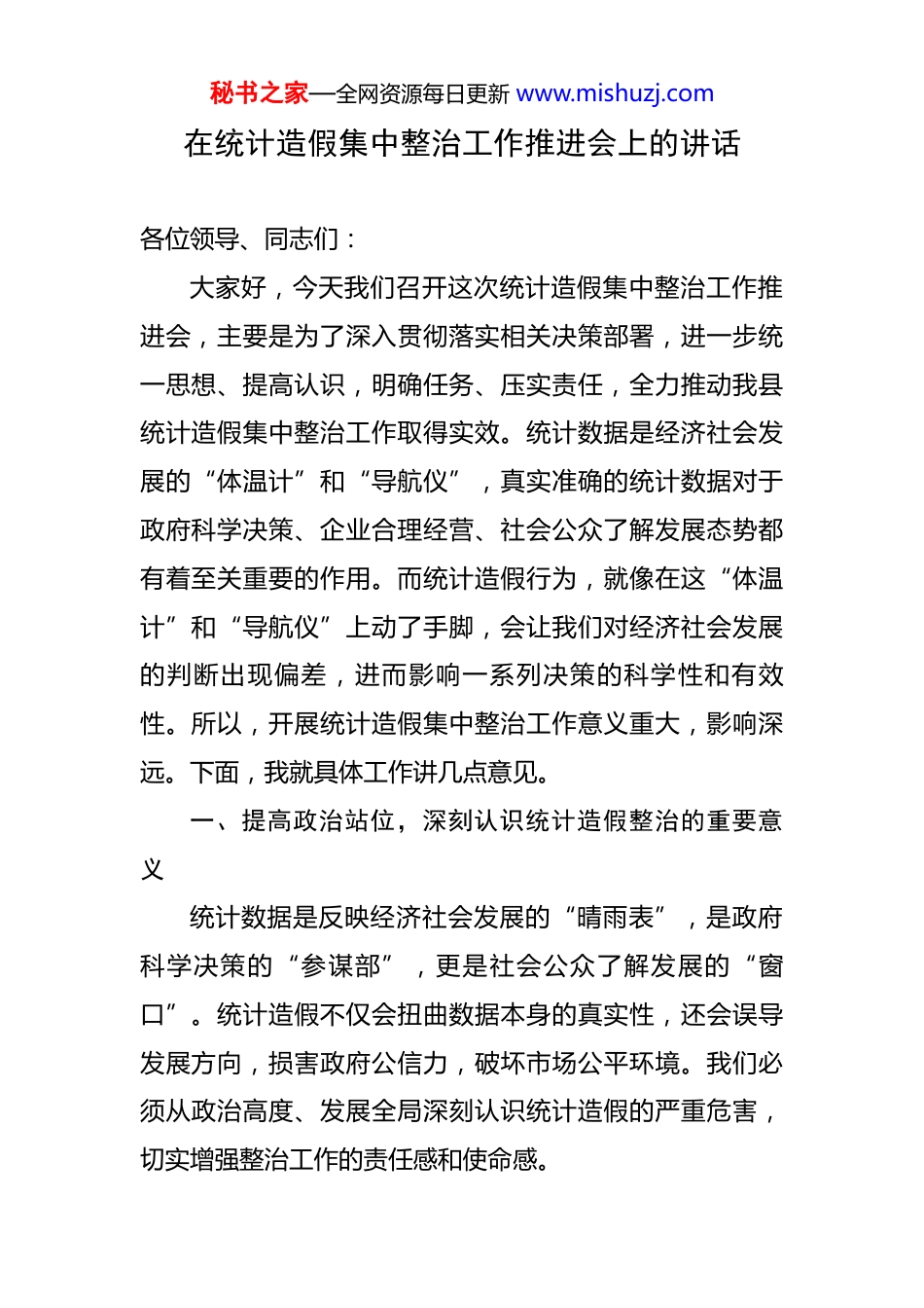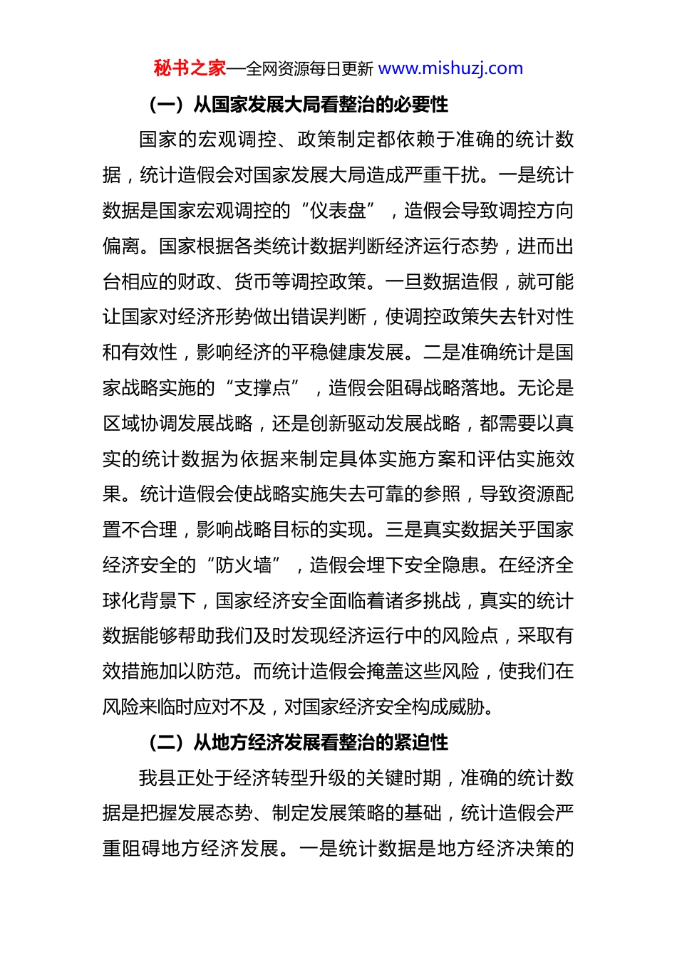 秘书之家—全网资源每日更新 www.mishuzj.com在统计造假集中整治工作推进会上的讲话 各位领导、同志们:大家好,今天我们召开这次统计造假集中整治工作推进会,主要是为了深入贯彻落实相关决策部署,进一步统一思想、提高认识,明确任务、压实责任,全力推动我县统计造假集中整治工作取得实效。统计数据是经济社会发展的“体温计”和“导航仪”,真实准确的统计数据对于政府科学决策、企业合理经营、社会公众了解发展态势都有着至关重要的作用。而统计造假行为,就像在这“体温计”和“导航仪”上动了手脚,会让我们对经济社会发展的判断出现偏差,进而影响一系列决策的科学性和有效性。所以,开展统计造假集中整治工作意义重大,影响深远。下面,我就具体工作讲几点意见。一、提高政治站位,深刻认识统计造假整治的重要意义统计数据是反映经济社会发展的“晴雨表”,是政府科学决策的“参谋部”,更是社会公众了解发展的“窗口”。统计造假不仅会扭曲数据本身的真实性,还会误导发展方向,损害政府公信力,破坏市场公平环境。我们必须从政治高度、发展全局深刻认识统计造假的严重危害,切实增强整治工作的责任感和使命感。秘书之家—全网资源每日更新 www.mishuzj.com(一)从国家发展大局看整治的必要性国家的宏观调控、政策制定都依赖于准确的统计数据,统计造假会对国家发展大局造成严重干扰。一是统计数据是国家宏观调控的“仪表盘”,造假会导致调控方向偏离。国家根据各类统计数据判断经济运行态势,进而出台相应的财政、货币等调控政策。一旦数据造假,就可能让国家对经济形势做出错误判断,使调控政策失去针对性和有效性,影响经济的平稳健康发展。二是准确统计是国家战略实施的“支撑点”,造假会阻碍战略落地。无论是区域协调发展战略,还是创新驱动发展战略,都需要以真实的统计数据为依据来制定具体实施方案和评估实施效果。统计造假会使战略实施失去可靠的参照,导致资源配置不合理,影响战略目标的实现。三是真实数据关乎国家经济安全的“防火墙”,造假会埋下安全隐患。在经济全球化背景下,国家经济安全面临着诸多挑战,真实的统计数据能够帮助我们及时发现经济运行中的风险点,采取有效措施加以防范。而统计造假会掩盖这些风险,使我们在风险来临时应对不及,对国家经济安全构成威胁。(二)从地方经济发展看整治的紧迫性我县正处于经济转型升级的关键时期,准确的统计数据是把握发展态势、制定发展策略的基础,统计造假会严重阻碍地方经济发展。一是统计数据是地方经济决策的秘书之家—全网资源每日更新 www.mishuzj.com“指南针”,造假会导致发展走弯路。我县的产业布局、项目建设、招商引资等决策都需要以统计数据为参考。如果数据失真,就可能导致决策失误,使宝贵的资源投入到不适合的领域,错失发展机遇。二是真实统计是地方产业升级的“助推器”,造假会延缓升级进程。通过统计数据可以清晰地了解各产业的发展状况、存在问题,从而有针对性地推动产业升级。统计造假会掩盖产业发展中的真实问题,使升级措施无法精准发力,阻碍产业向高端化、智能化、绿色化转型。三是准确数据是地方经济活力的“晴雨表”,造假会影响发展信心。企业投资、人才流入等都看重地方经济的真实发展态势,失真的统计数据会给外界传递错误信号,降低投资者和人才对我县发展的信心,影响我县经济的吸引力和竞争力。(三)从政府公信力建设看整治的关键性政府公信力是政府开展工作的重要基础,统计数据的真实性直接关系到政府在群众心中的形象和信任度。一是统计数据是政府承诺兑现的“成绩单”,造假会损害群众信任。群众通过统计数据来感受政府工作成效,评估政府承诺的兑现情况。如果统计数据造假,群众就会对政府的工作产生怀疑,降低对政府的信任,影响政府与群众之间的良性互动。二是真实统计是政府依法行政的“试金石”,造假会破坏法治形象。统计工作有明确的法律法规秘书之家—全网资源每日更新 www.mishuzj.com规范,统计造假是违法行为,会让群众觉得政府在执法犯法,损害政府依法行政的形象,影响法治政府建设进程。三是准确数据是政府政务公开的“重要内容”,造...